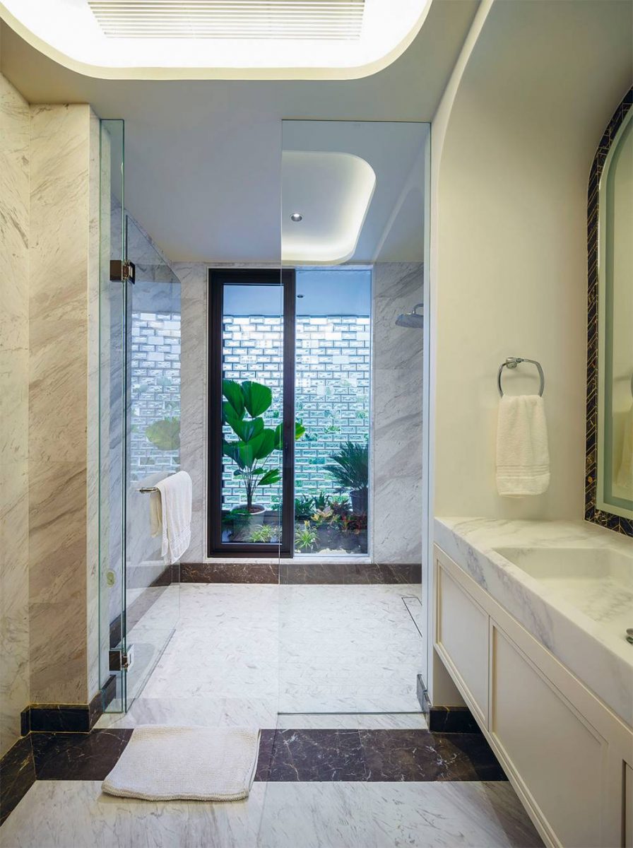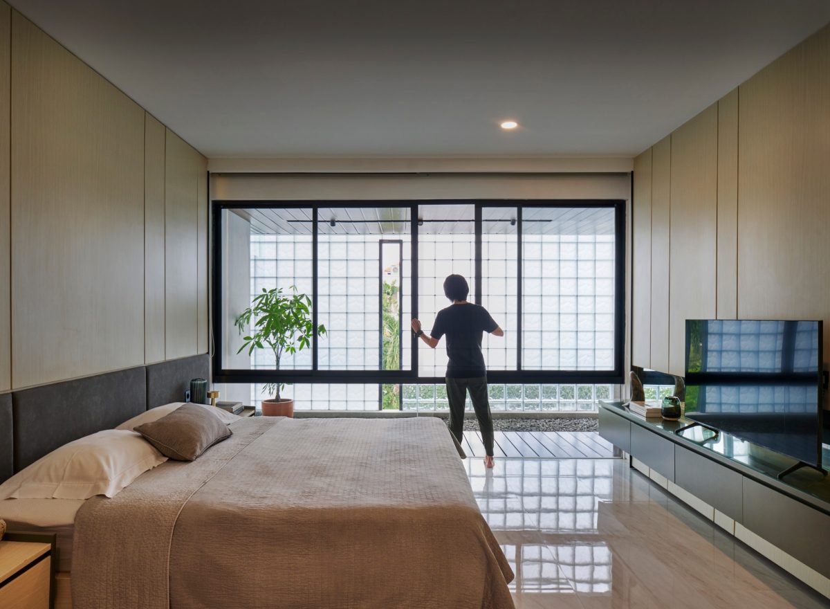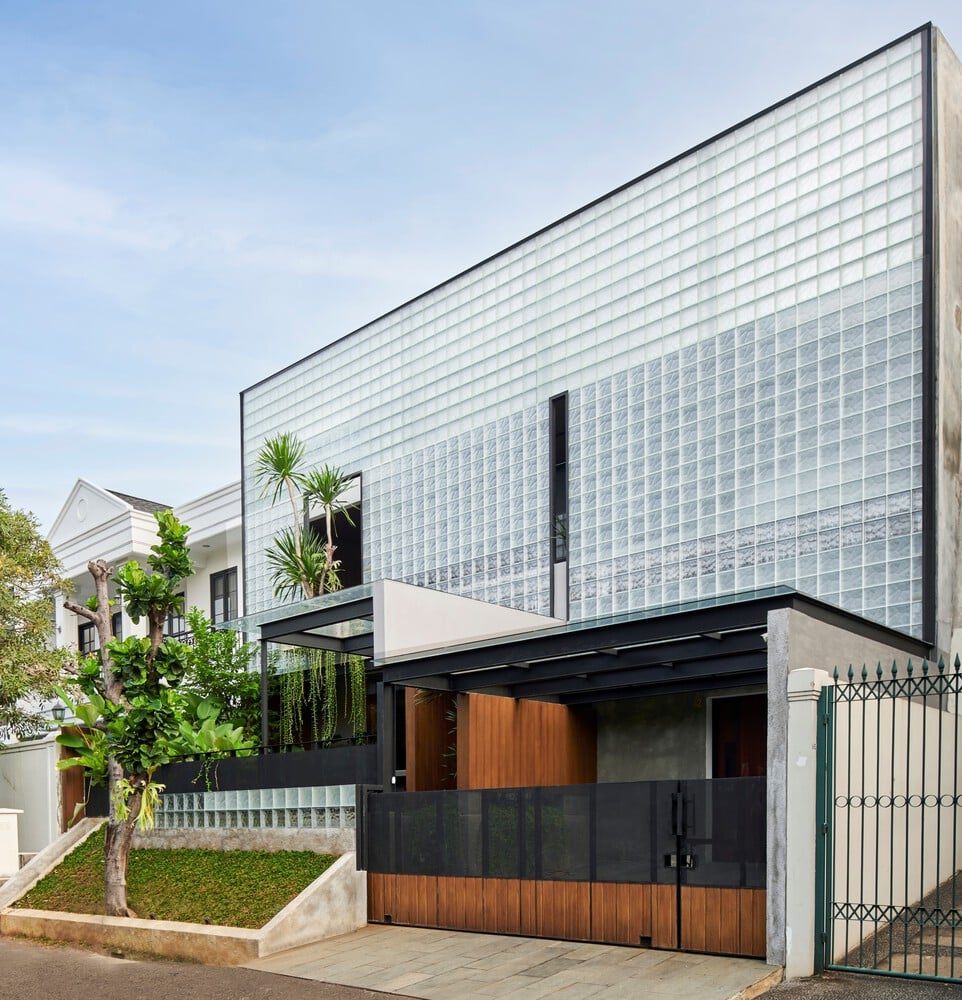 บ้านหลังนี้มีความจำเป็นต้องหันหน้าเผชิญกับแสงแดดจากทิศตะวันออกและตะวันตก สถาปนิกได้ตัดสินใจเลือกใช้วัสดุธรรมดาสามัญอย่าง “บล็อกแก้ว” มาออกแบบเป็นองค์ประกอบของฟาซาดอาคารขนาดใหญ่ เพื่อออกแบบให้บ้านออกมาสวยงามน่าอยู่ ไปพร้อม ๆ กับการปกป้องพื้นที่ด้านในจากความร้อนของแสงแดด ซึ่งมีคุณสมบัติช่วยหักเหแสง กันความร้อน กันเสียง และไม่ทำให้บ้านทึบ >> อ่านต่อ