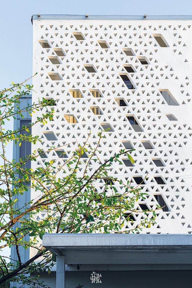 การรีโนเวตบ้านหลังนี้ไม่ได้คืนชีพให้ตัวบ้านเท่านั้น แต่คืนความรู้สึกดีๆของชีวิตคู่ และความรู้สึกรักบานให้กลับมาอีกครั้ง ผ่านการออกแบบ “สเปซ” ของบ้านมือสองให้อยู่สบาย ขณะเดียวกันก็เอื้อต่อการสร้างความสัมพันธ์ที่ทำให้ทุกวันได้กลายเป็น “เวลาของเรา” ในส่วนของฟาซาดหน้าบ้านออกแบบด้วยบล็อกช่องลมสามเหลี่ยมสีขาว จัดเป็นลายกราฟิกให้มีทั้งความทึบและความโปร่ง สร้างความเป็นส่วนตัว แต่ไม่ตัดขาดจากภายนอก >> อ่านต่อ