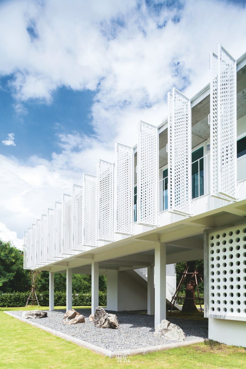 บ้านสีขาวทรงกล่องที่เรียบเท่ปนน่ารักด้วยฟาซาดบล็อกช่องลมและซุ้มโค้ง เพราะหน้าบ้านหันไปทางทิศตะวันออกเฉียงใต้ที่มีแดดค่อนข้างมาก จึงออกแบบผนังอาคาร 2 ชั้น คือผนังบล็อกช่องลมชั้นนอกเพื่อกรองแสงแดด และทำบานเลื่อนกระจกไว้ชั้นในให้เปิดระบายอากาศได้ ดีไซน์แรกออกแบบองค์ประกอบบ้านเป็นสี่เหลี่ยม แต่ปรับให้มีเส้นโค้งดูน่ารักขึ้น >> อ่านต่อ