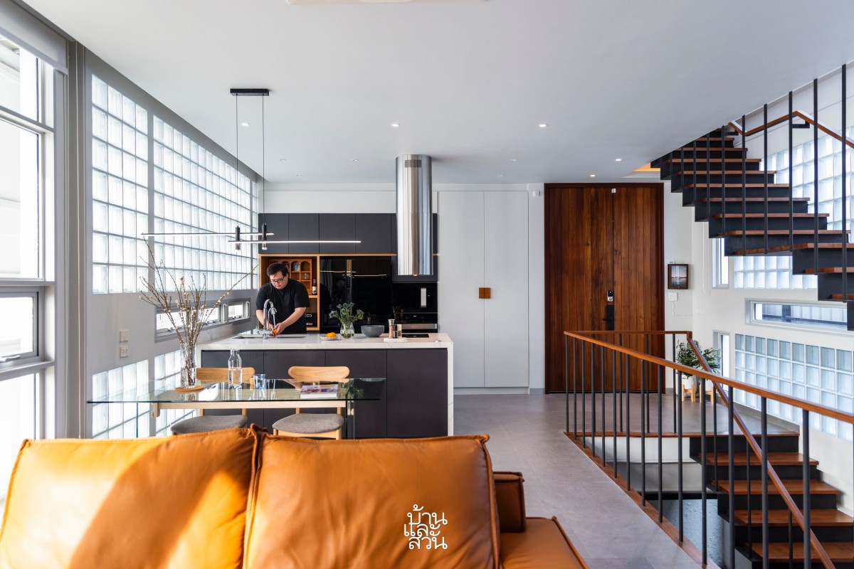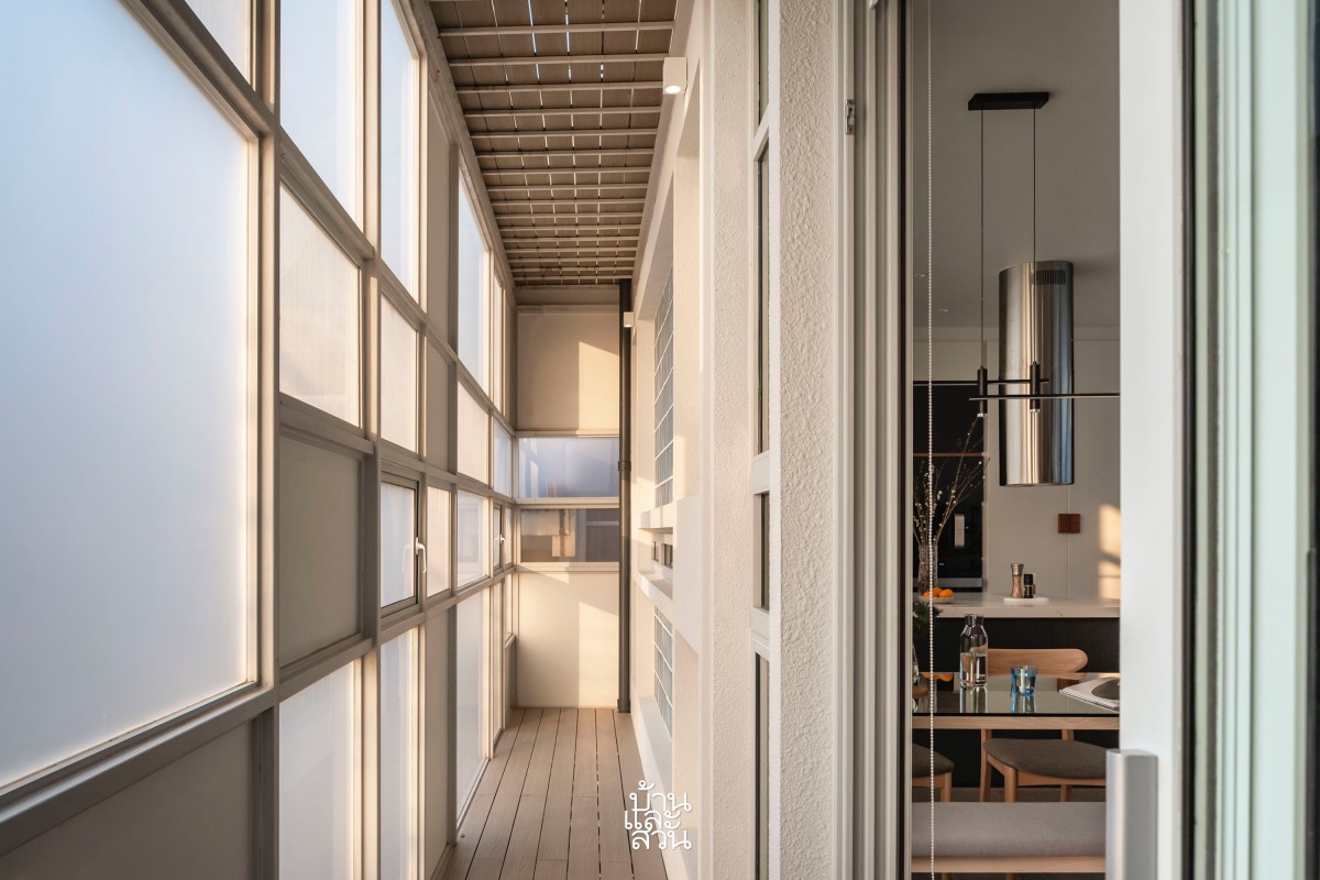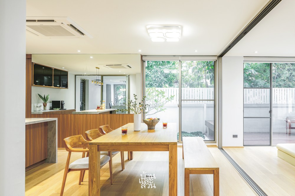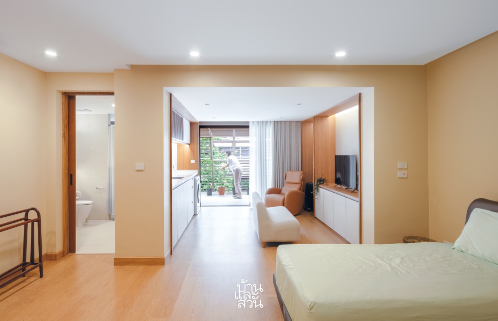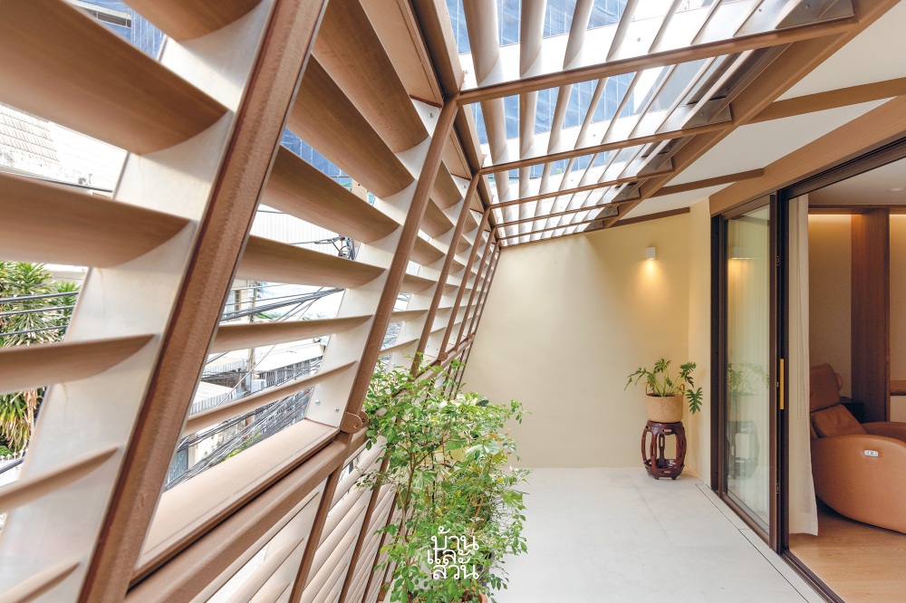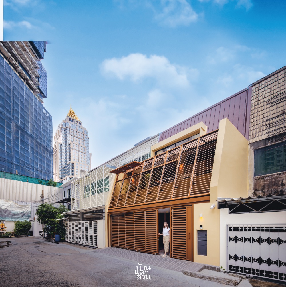 รีโนเวตทาวน์เฮ้าส์ในเมือง ให้รองรับการใช้ชีวิตของแม่ที่อายุมากขึ้น โจทย์หลักคือการติดตั้งลิฟต์อำนวยความสะดวก ส่วนพื้นที่ภายในออกแบบให้โปร่งโล่ง เปิดรับแสงและลมธรรมชาติ ทำให้รู้สึกสบายแม้อยู่ในเมืองใหญ่ โดยมีจุดเด่นที่ฟาซาดแผงระแนงไม้เทียมช่วยสร้างความเป็นส่วนตัวและสร้างความสวยงามเมื่อแสงธรรมชาติตกกระทบ >> อ่านต่อ