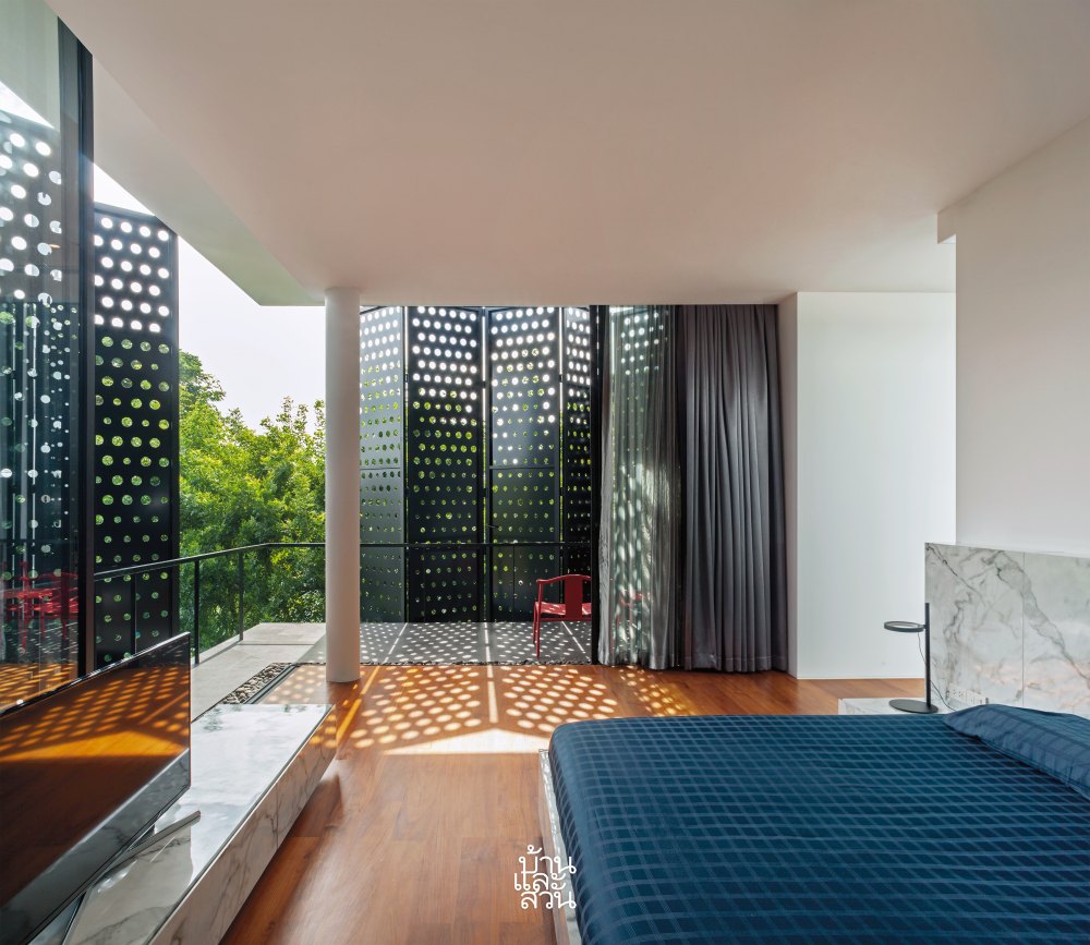 บ้านโมเดิร์นโครงสร้างเหล็กหลังนี้ดึงเอาจุดเด่นของวัสดุที่ดูเรียบง่ายอย่างอะลูมิเนียมมาใช้แทนเหล็กดัดแบบเดิมๆ ได้อย่างสวยงาม ให้ฟังก์ชันการใช้งานที่ดี และยังสร้างเอกลักษณ์พิเศษเฉพาะตัว ด้วยการดีไซน์เพิ่มลูกเล่นผสมกันระหว่างฟาซาดอะลูมิเนียมสีดำที่ทำเป็นบานเฟี้ยมเจาะรูวงกลมขนาดแตกต่างกัน โดยรูขนาดเล็กใช้สำหรับมุมที่ต้องการความเป็นส่วนตัวสูง รูขนาดใหญ่เจาะเรียงนำสายตาไปยังต้นไม้และท้องฟ้า กับบางส่วนที่เป็นระแนงอะลูมิเนียมสีขาวสามารถเลื่อนเปิดเมื่อต้องการเห็นวิวเต็มที่ และเลื่อนปิดเพื่อความปลอดภัย >> อ่านต่อ