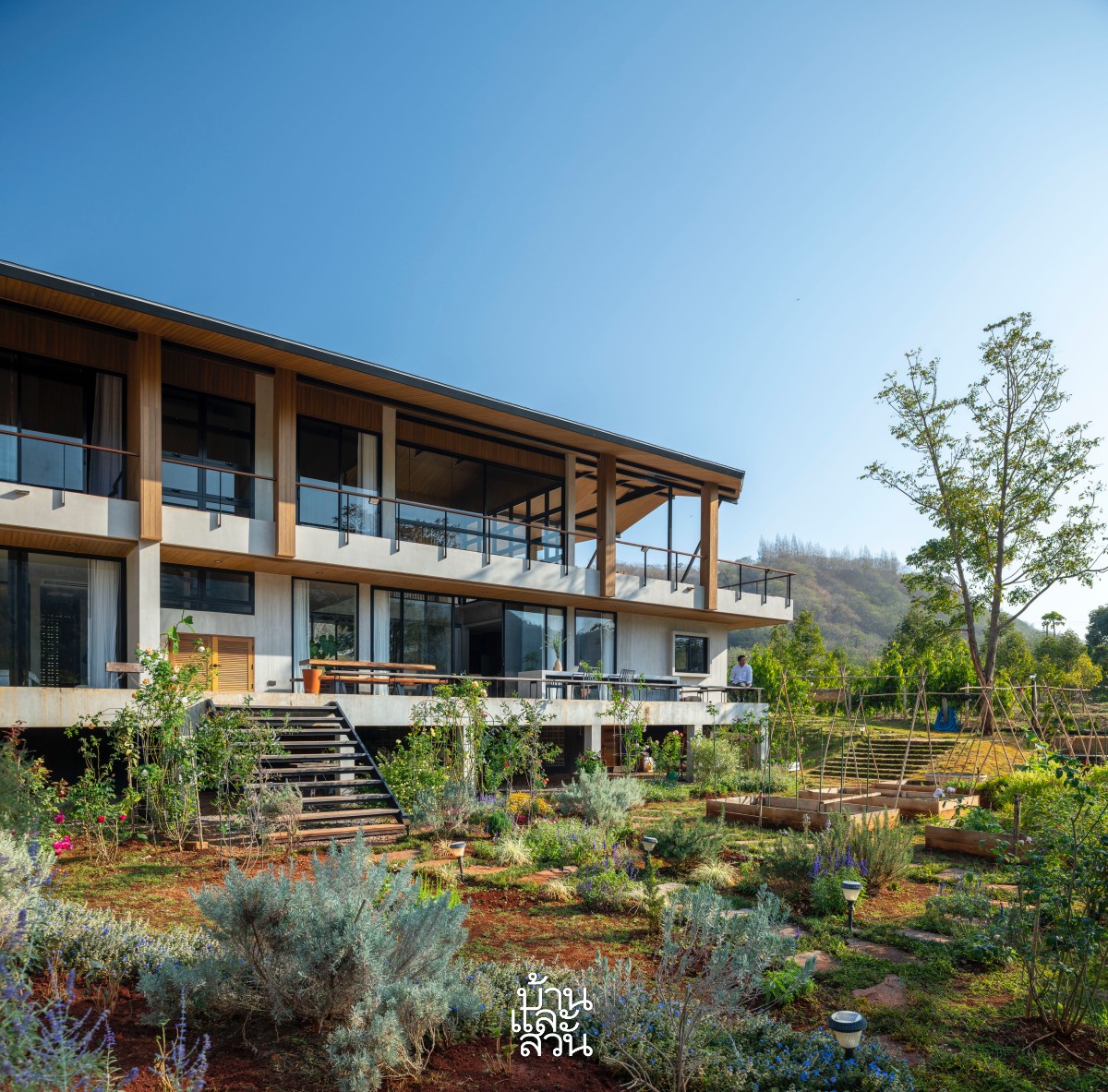 บ้านตากอากาศล้อมสวน โอบด้วยวิวภูเขา ที่ตั้งใจให้ตัวบ้านกลมกลืนไปกับบริบท จึงออกแบบบ้านด้วยโครงสร้างอิงภูเขา ช่องเปิดรับลม และวัสดุท้องถิ่นรอบบ้าน