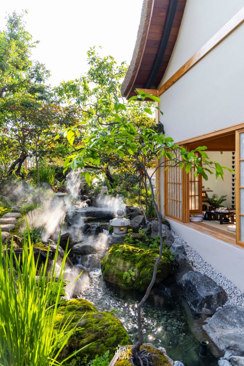 ภาพสวนในพื้นที่ที่มีหน้ากว้างประมาณ 5 เมตร แต่เป็นเนินสูงถึง 1 เมตร ที่เห็นตรงหน้าต่างไปจากสวนญี่ปุ่นทั่วไปที่เคยเห็น ให้ความรู้สึกเหมือนอยู่ริมลำธารบนเนินเขาในป่าสักแห่ง ริมลำธารเต็มไปด้วยก้อนหินที่มีรูปทรงและสีสันแปลกตา ต้นไม้ใหญ่ฟอร์มสวยที่แตกกิ่งทอดล้อไปกับไม้พุ่มไม้ดอกที่อยู่ด้านล่าง ดุจดังภาพวาดที่ธรรมชาติรังสรรค์ “ที่ญี่ปุ่นมักจะสร้างบ้าน วัด วัง ตามแหล่งธรรมชาติ ใกล้ภูเขา ใกล้น้ำตกครับ เราจำลองบรรยากาศให้คล้ายลักษณะดังกล่าว ปรับพื้นที่ไล่สโลปให้มีลักษณะเป็นเนินเขาตามธรรมชาติเพื่อให้น้ำจากหัวน้ำตกค่อย ๆ ไหลลงมาตามลำธาร ทำรั้วให้สูงกว่าปกติ เพื่อใช้เป็นกำแพงกันดินรับน้ำหนักโครงสร้างของบริเวณหัวน้ำตก”