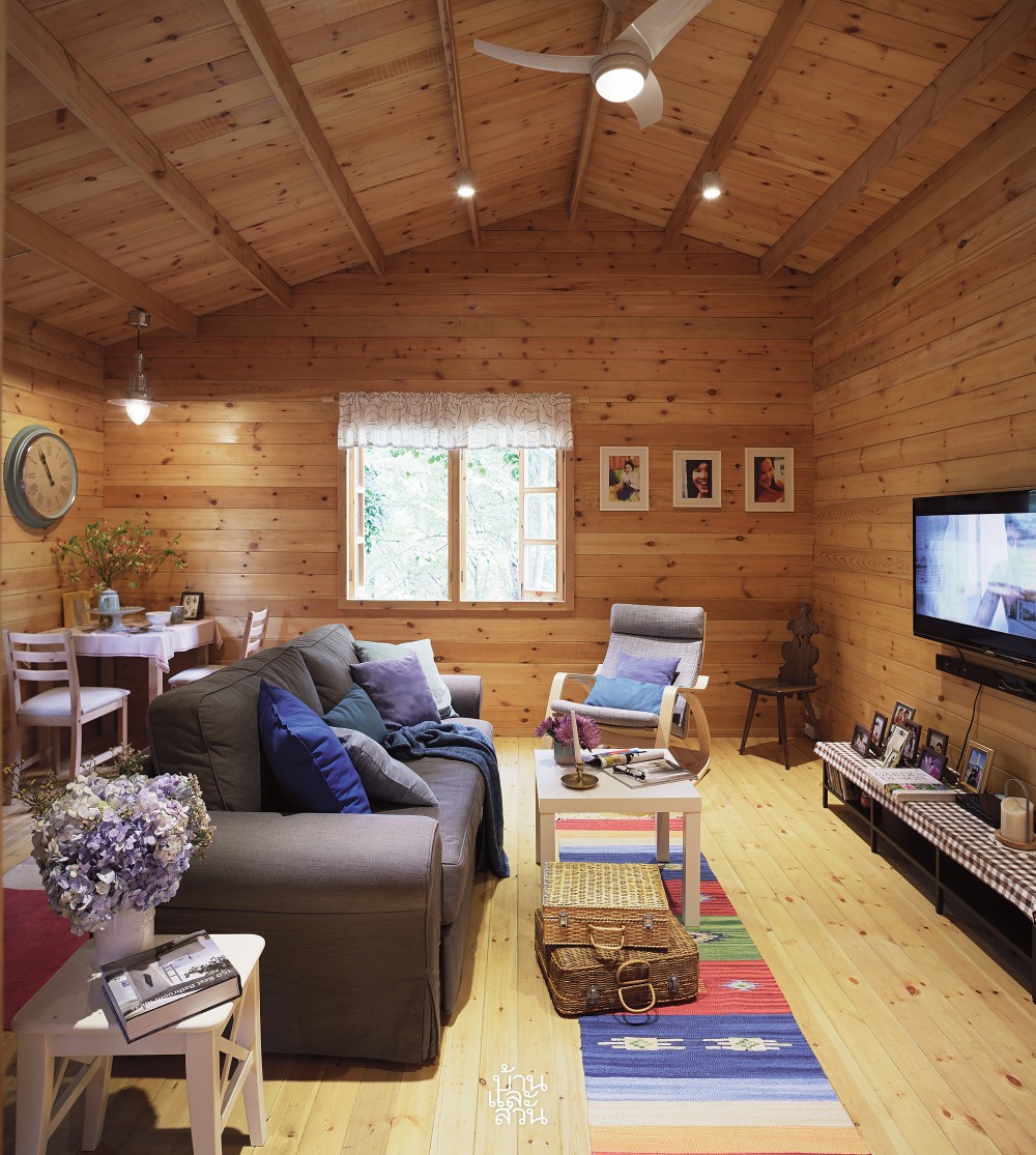 บ้านเล็กๆ หลังนี้ก่อสร้างด้วยไม้สนจากประเทศรัสเซีย ทั้งหลังประกอบขึ้นด้วยระบบน็อกดาวน์ จึงก่อสร้างได้รวดเร็วกว่าบ้านแบบปกติมาก แถมยังมีกลิ่นหอมจากไม้สนและดูสวยงามอีกด้วย สีเหลืองครีมอ่อนๆ ของตัวบ้านเมื่ออยู่ท่ามกลางต้นไม้น้อยใหญ่ก็สร้างบรรยากาศให้บ้านดูน่าอยู่และมีชีวิตชีวา การแบ่งพื้นที่ใ ช้สอยของบ้านดูกะทัดรัด เริ่มตั้งแต่ระเบียงไม้กว้างหน้าบ้านสำหรับออกมานั่งพักผ่อน ส่วนภายในประกอบด้วยห้องโถงซึ่งกว้างขวางเพียงพอให้คนในครอบครัวมาใช้งานร่วมกัน ทั้งยังแบ่งมุมหนึ่งเป็นแพนทรี่เล็กๆ ได้ด้วย รอบห้องเจาะหน้าต่างให้แสงสว่างจากภายนอกลอดเข้ามา บ้านหลังนี้มีเพียง 1 ห้องนอนและ 1 ห้องน้ำ แต่ก็จัดวางผังการใช้งานได้ลงตัวและสวยงาม >> อ่านต่อ