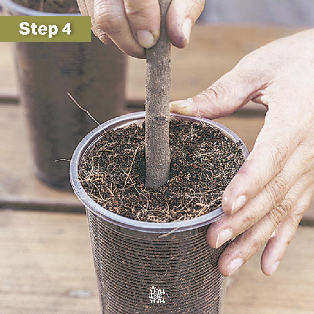 ปักกิ่งที่เตรียมไว้ลงในช่องจากขั้นตอนที่ 4 จากนั้นใช้นิ้วกดวัสดุปลูกให้แน่น เพื่อไม่ให้กิ่งชำขยับ