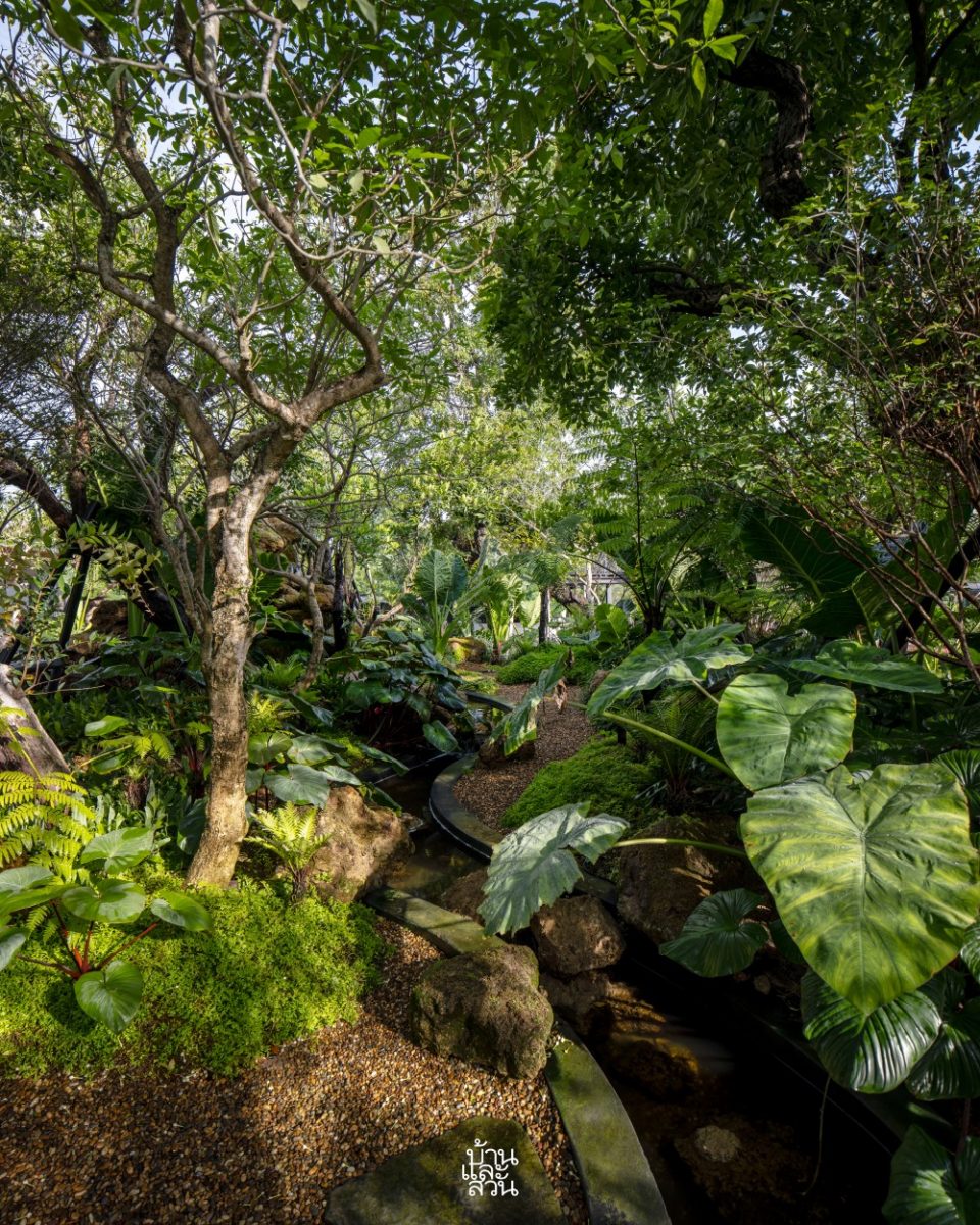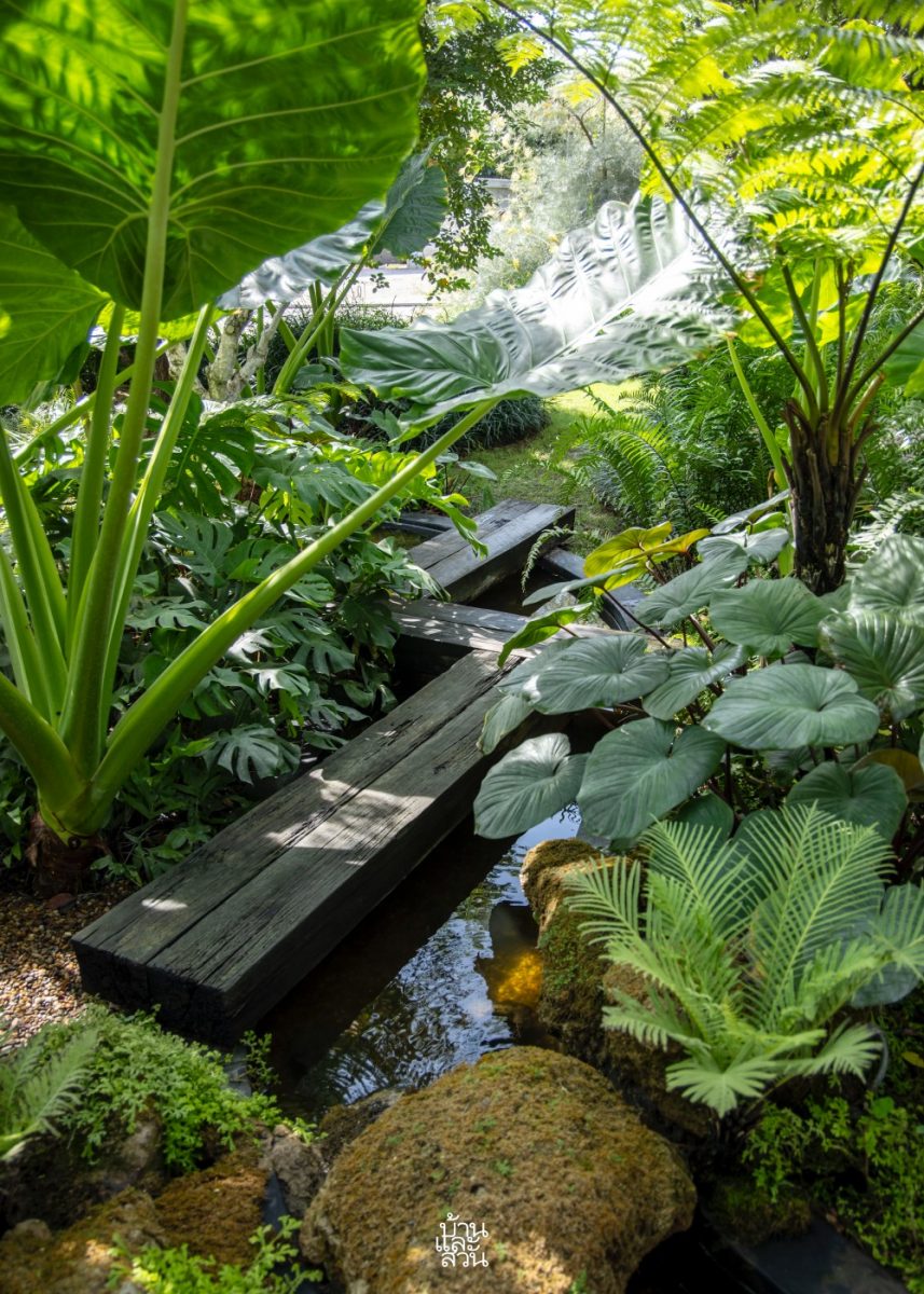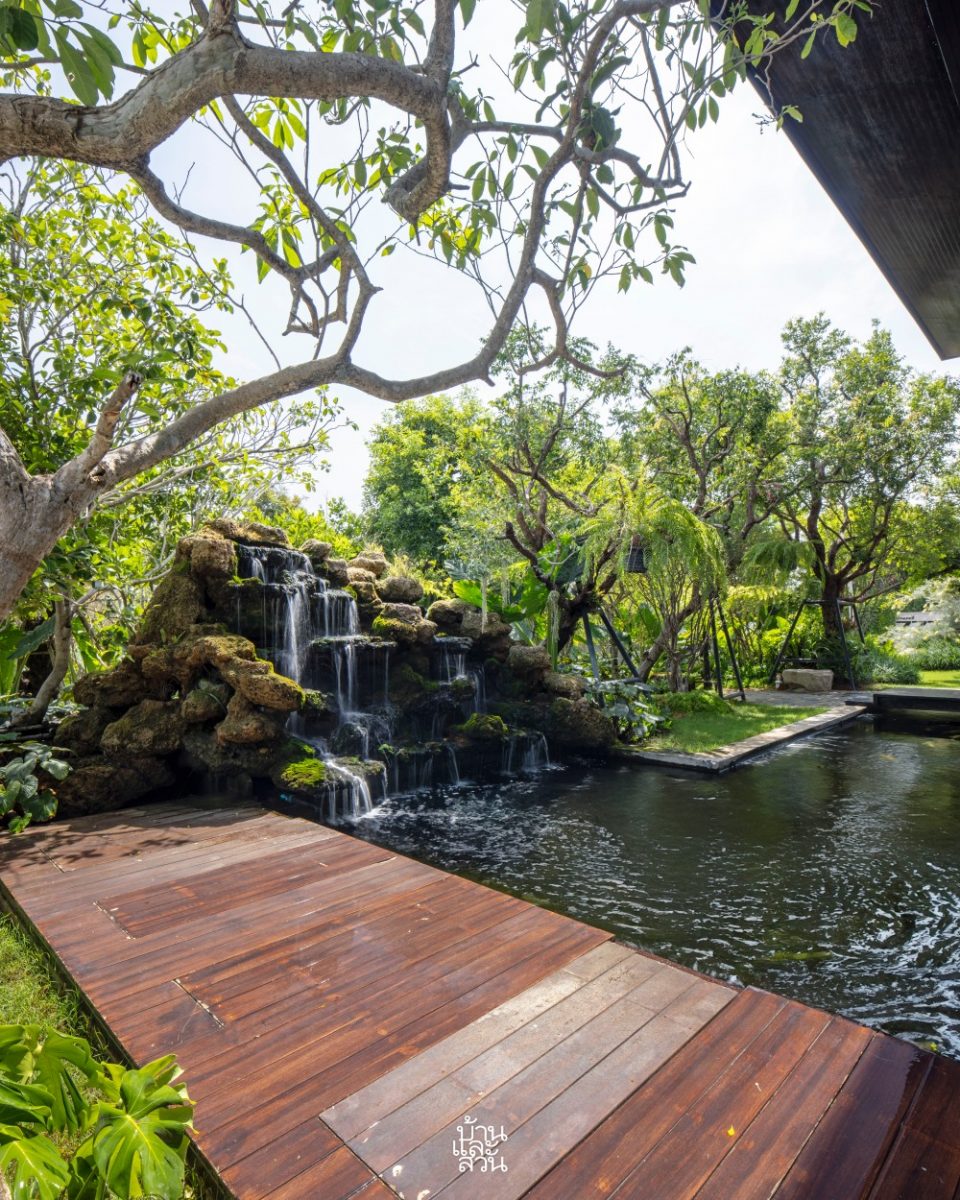 “จากบ่อเลี้ยงปลาเดิมที่หน้าบ้านก็ได้เพิ่มมุมมองและความมีชีวิตชีวาด้วยหัวน้ำตกหินฟองน้ำขนาดใหญ่ ซึ่งจะพิเศษตรงที่น้ำตกนี้ ออกแบบให้สามารถมองได้จาก 2 ด้าน ทั้งจากในบ้านมองออกมาเห็นความสดชื่นเย็นสบาย และจากด้านนอกที่มองเข้าไปจะเห็นน้ำตกเป็นฉากกั้นด้านหลังเพิ่มความเป็นส่วนตัวให้แก่อาคาร ก่อนที่สายน้ำจะไหลเชื่อมเข้าสู่ลำธารในสวน เล่นระดับสูง-ต่ำ ให้จังหวะของน้ำช่วยเติมออกซิเจน เพิ่มบรรยากาศให้สวน อีกทั้งลำธารบางช่วงยังทำให้เด็ก ๆ ได้วิ่งเล่น สัมผัสน้ำ และสำรวจธรรมชาติอย่างใกล้ชิด นอกจากนี้ ผมยังได้เพิ่มบ่อน้ำอีก 2 บ่อ เพื่อให้มีน้ำตกขนาดใหญ่และระดับที่รองลงมาใกล้เคียงกับธรรมชาติจริง ที่มีความหลากหลายของขนาดและรูปแบบ หรือมีหลายบ่อที่น้ำไหลเชื่อมถึงกัน ซึ่งแม้ว่าทั้งสามบ่อในสวนจะไม่ได้ทำเป็นโครงสร้างเดียวกัน เพื่อลดความยุ่งยากในการบำรุงรักษาและไม่ต้องจัดการกับปริมาณน้ำมาก ๆ แต่ด้วยพรรณไม้นานาชนิด รวมถึงการเลือกใช้องค์ประกอบที่เป็นวัสดุจากธรรมชาติ อย่างหินฟองน้ำ หินไข่นกกระทา แผ่นหินกาบ ไม้หมอนรถไฟ และกรวดสีน้ำผึ้ง ที่ดูสอดคล้องและเป็นหนึ่งเดียวกัน ก็ช่วยให้บรรยากาศโดยรวมดูเชื่อมต่อและกลมกลืนกันได้