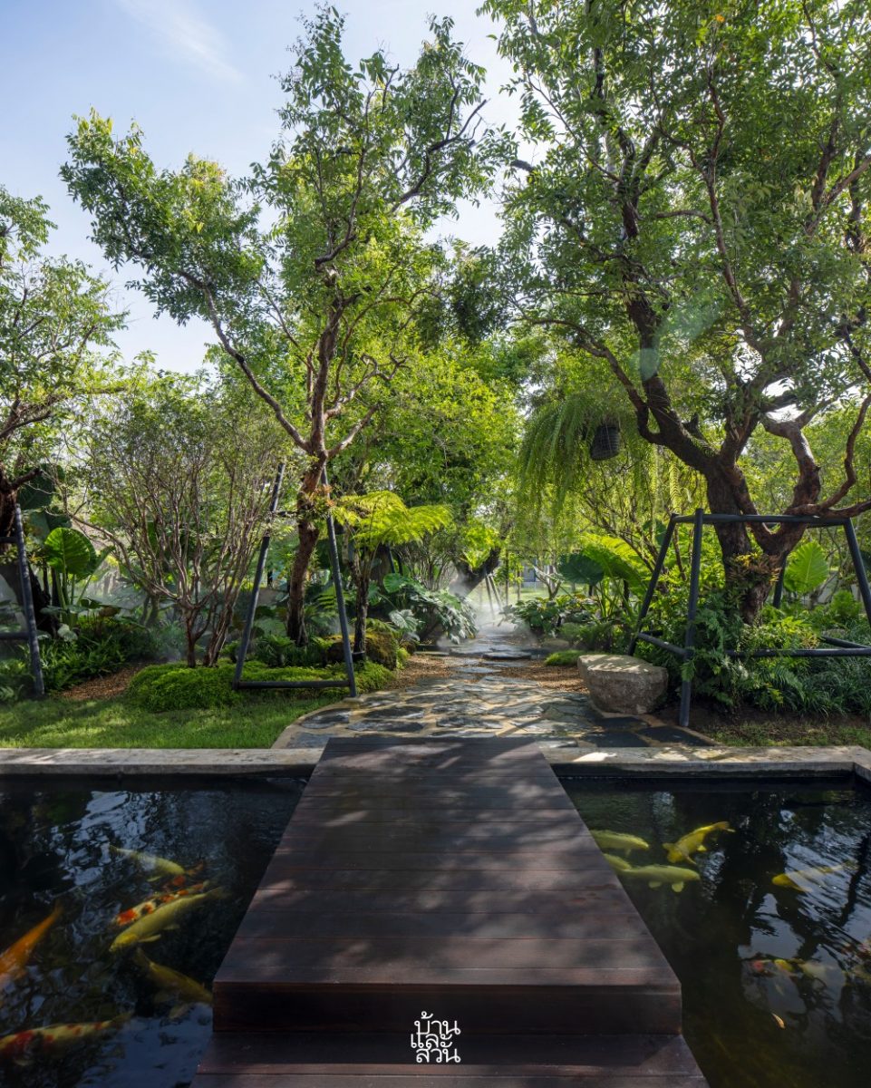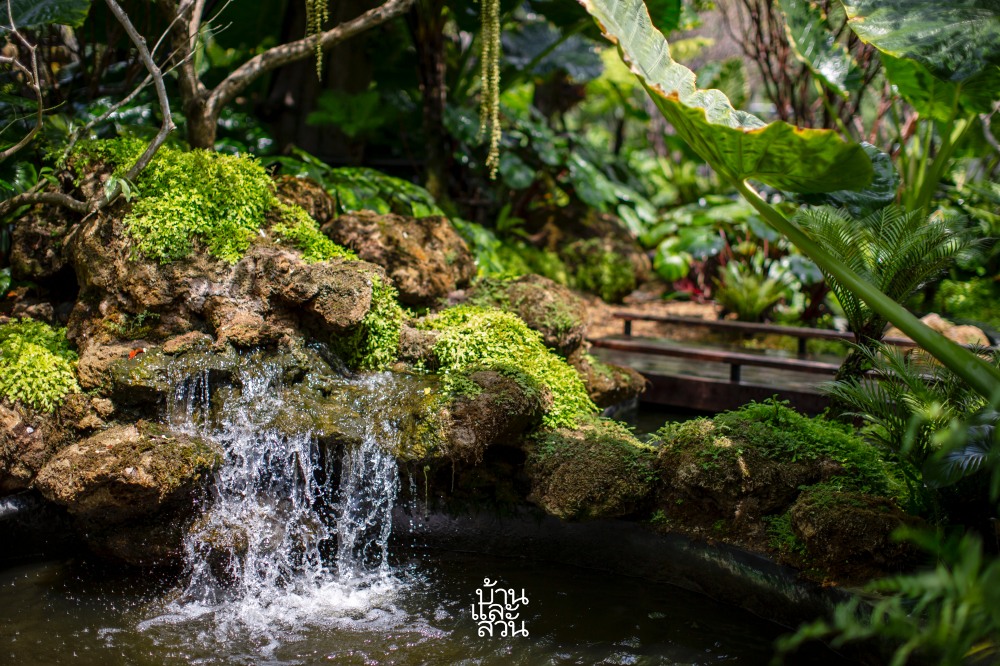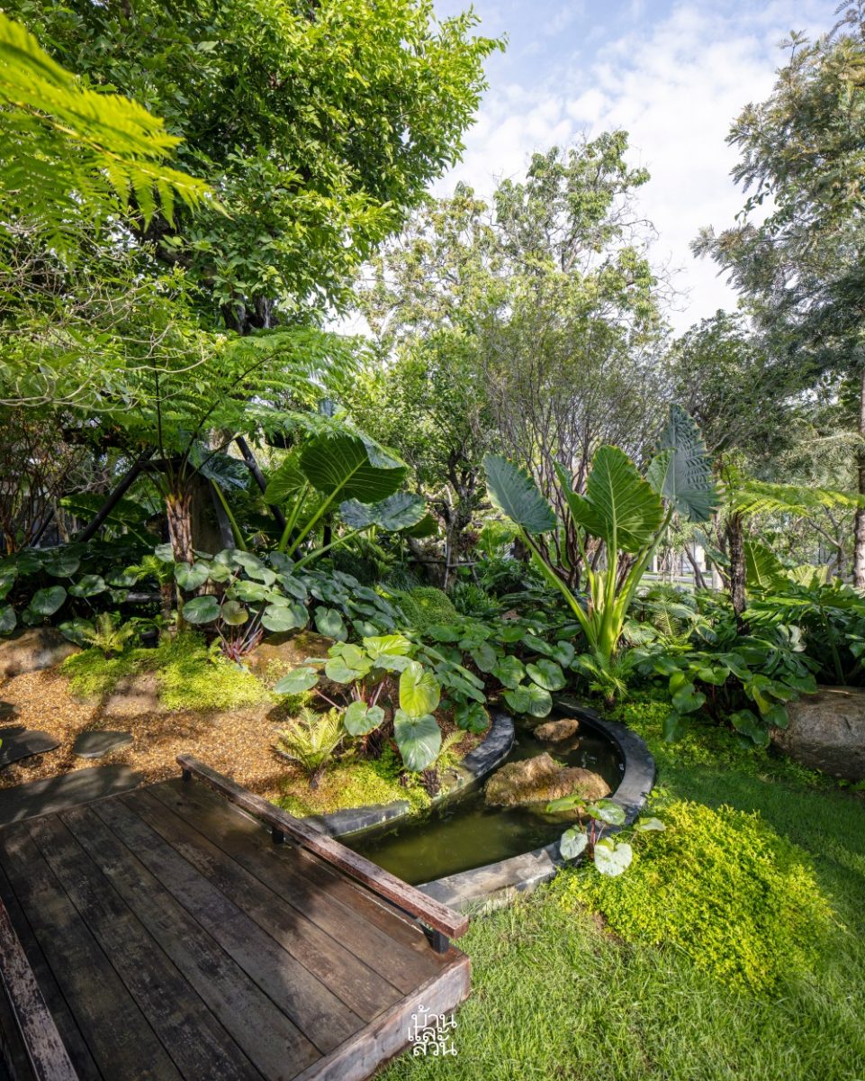 “จากบ่อเลี้ยงปลาเดิมที่หน้าบ้านก็ได้เพิ่มมุมมองและความมีชีวิตชีวาด้วยหัวน้ำตกหินฟองน้ำขนาดใหญ่ ซึ่งจะพิเศษตรงที่น้ำตกนี้ ออกแบบให้สามารถมองได้จาก 2 ด้าน ทั้งจากในบ้านมองออกมาเห็นความสดชื่นเย็นสบาย และจากด้านนอกที่มองเข้าไปจะเห็นน้ำตกเป็นฉากกั้นด้านหลังเพิ่มความเป็นส่วนตัวให้แก่อาคาร ก่อนที่สายน้ำจะไหลเชื่อมเข้าสู่ลำธารในสวน เล่นระดับสูง-ต่ำ ให้จังหวะของน้ำช่วยเติมออกซิเจน เพิ่มบรรยากาศให้สวน อีกทั้งลำธารบางช่วงยังทำให้เด็ก ๆ ได้วิ่งเล่น สัมผัสน้ำ และสำรวจธรรมชาติอย่างใกล้ชิด นอกจากนี้ ผมยังได้เพิ่มบ่อน้ำอีก 2 บ่อ เพื่อให้มีน้ำตกขนาดใหญ่และระดับที่รองลงมาใกล้เคียงกับธรรมชาติจริง ที่มีความหลากหลายของขนาดและรูปแบบ หรือมีหลายบ่อที่น้ำไหลเชื่อมถึงกัน ซึ่งแม้ว่าทั้งสามบ่อในสวนจะไม่ได้ทำเป็นโครงสร้างเดียวกัน เพื่อลดความยุ่งยากในการบำรุงรักษาและไม่ต้องจัดการกับปริมาณน้ำมาก ๆ แต่ด้วยพรรณไม้นานาชนิด รวมถึงการเลือกใช้องค์ประกอบที่เป็นวัสดุจากธรรมชาติ อย่างหินฟองน้ำ หินไข่นกกระทา แผ่นหินกาบ ไม้หมอนรถไฟ และกรวดสีน้ำผึ้ง ที่ดูสอดคล้องและเป็นหนึ่งเดียวกัน ก็ช่วยให้บรรยากาศโดยรวมดูเชื่อมต่อและกลมกลืนกันได้