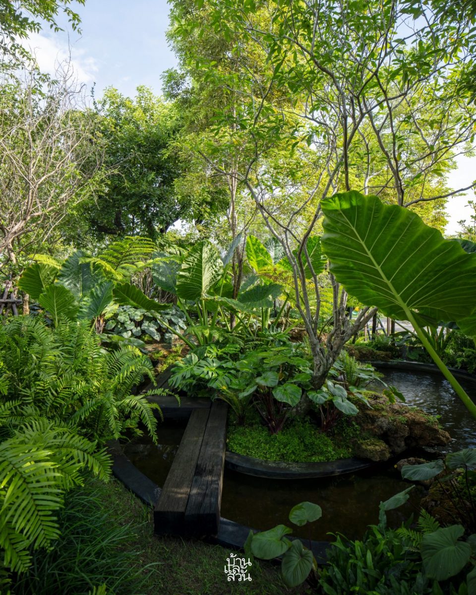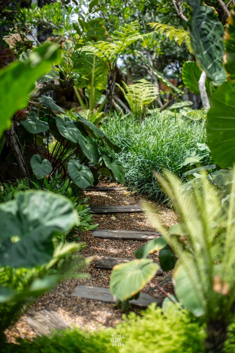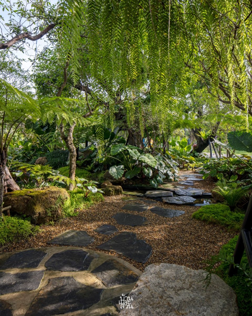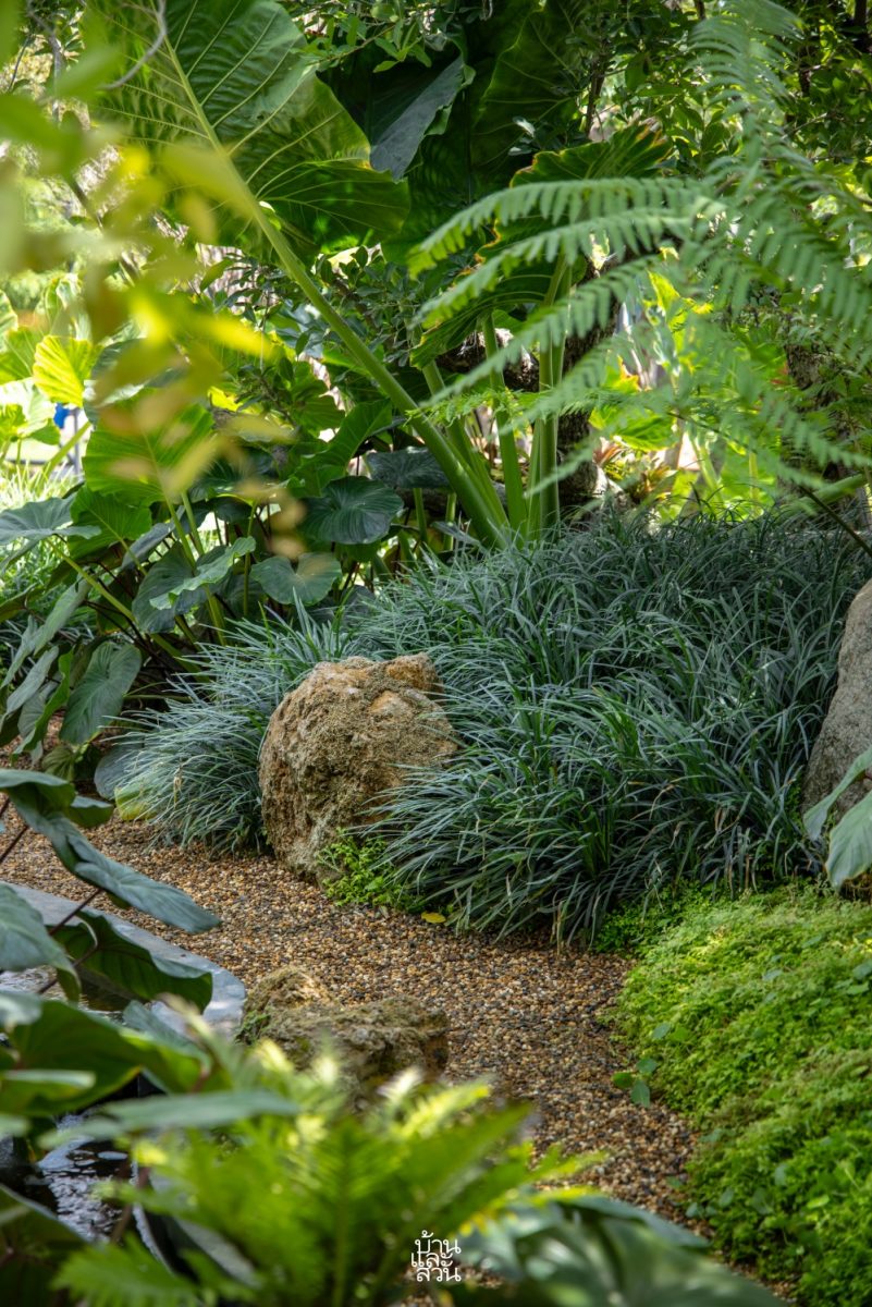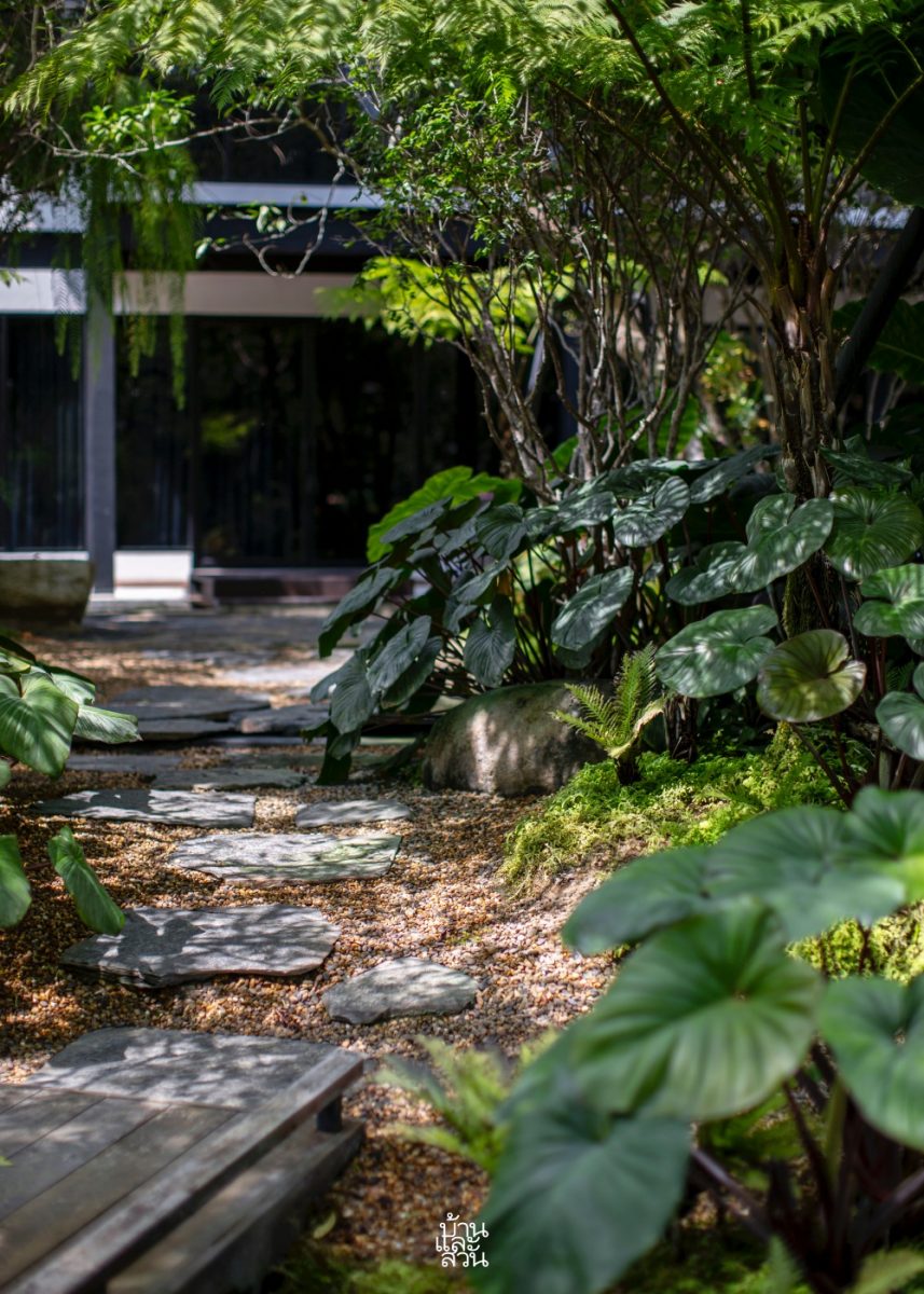 “โจทย์หรือความต้องการของเจ้าของบ้านที่อยากให้มาออกแบบคือ การเปลี่ยนพื้นที่โล่งให้กลายเป็นสวนที่มีความเป็นธรรมชาติ รู้สึกเชื่อมโยงกับบรรยากาศโดยรอบ เสมือนเป็นโอเอซิสของบ้านที่ให้ความรู้สึกสงบและผ่อนคลายกับทุกคนในครอบครัว โดยเฉพาะลูก ๆ จะได้ออกมาใช้ชีวิต และเก็บเกี่ยวประสบการณ์จากโลกสีเขียวรอบตัว ผมจึงได้เลือกสวนสไตล์ทรอปิคัลที่มีความร่นรื่นเข้ามาช่วยเติมเต็มบรรยากาศและการใช้งาน เน้นการเก็บโครงสร้าง ไม้เดิม และปลูกพืชพรรณหลากหลายระดับเพิ่มทั้งไม้ยืนต้น อย่างเสม็ดแดง ไม้พุ่มระดับกลาง เช่น โมก แก้วมุกดา องุ่นบราซิล รวมถึงไม้พุ่มและไม้คลุมดิน เช่น บอนกระดาด มอนสเตอรา เสน่ห์จันทร์แดง ปรง และเฟินต่าง ๆ ในรูปแบบกลุ่มและต้นเดี่ยว เพื่อทำให้เกิดมิติและมุมมองที่น่าสนใจ