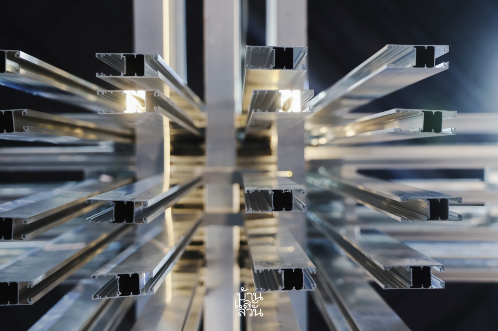 Looklen Architects นำเสนอประสบการณ์ใหม่ในการสัมผัสอะลูมิเนียมจาก S-ONE ผ่าน Public space ที่แสดงเอกลักษณ์และวิสัยทัศน์ของแบรนด์ ที่ได้รับแรงบันดาลใจจากการสำรวจขั้นตอนการผลิตที่น่าสนใจในโรงงานของ S-ONE เช่น การมัดอะลูมิเนียมก่อนนำไปทำความสะอาดในบ่อชุบ และผิว Mill หรือสีต้นฉบับของอะลูมิเนียม โดยไอเดียนี้ถูกนำเสนอผ่านประสบการณ์การสัมผัสอะลูมิเนียมใน 3 รูปแบบ การรับรู้ผ่านมุมมองและพื้นที่ของสถาปัตยกรรม, การสัมผัสอะลูมิเนียมผ่านรูปแบบเฟอร์นิเจอร์ และการสร้างปฎิสัมพันธ์กับอะลูมิเนียมผ่านผลิตภัณฑ์และสื่อมัลติมีเดีย เพื่อให้ทุกคนได้รู้จักและเป็นที่จดจำ โดยไม่ลืมหัวใจสำคัญคือการใช้วัสดุอย่างคุ้มค่า เน้นความยั่งยืนเพื่อให้สามารถนำวัสดุกลับมาใช้ใหม่ ด้วยการออกแบบระบบกริด-เสา ที่คำนึงถึงการตัดแบ่งเส้นอะลูมิเนียมจากโรงงาน ที่ยาว 6.40 เมตร โดยแบ่งเป็นช่วงไม่เกิน 2.50 เมตร ซึ่งเป็นระยะสามารถนำกลับมาใช้ได้มากที่สุด