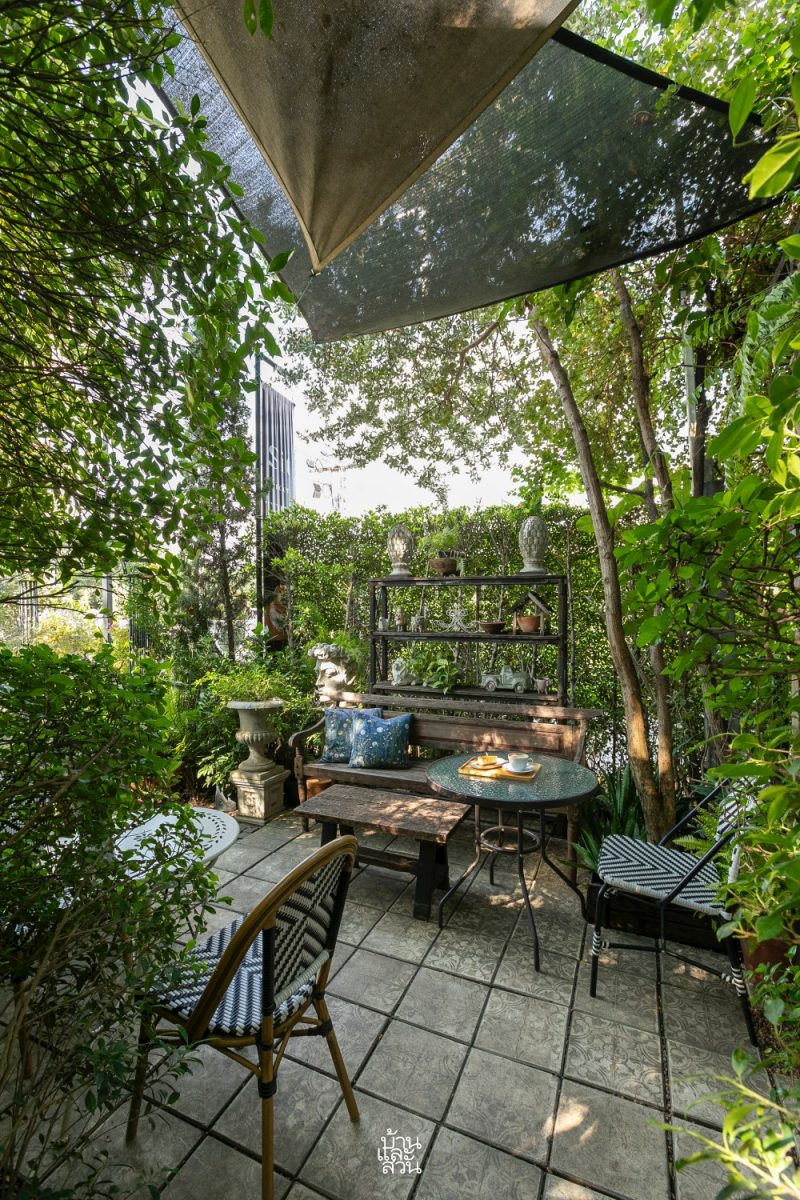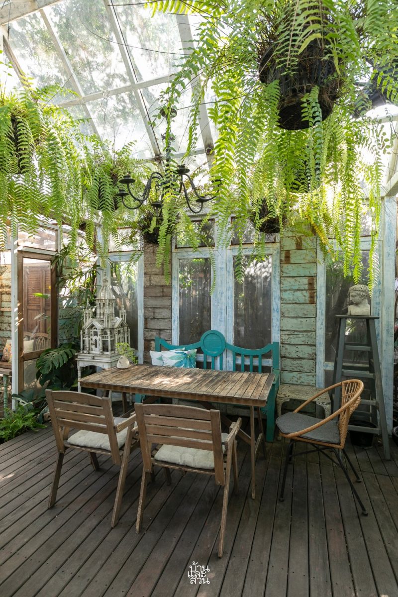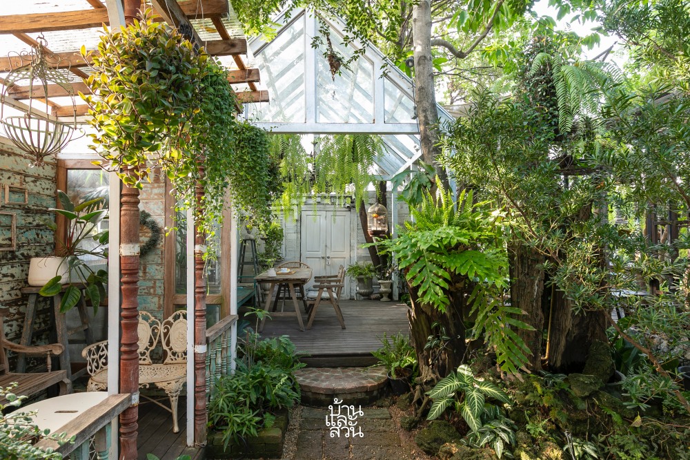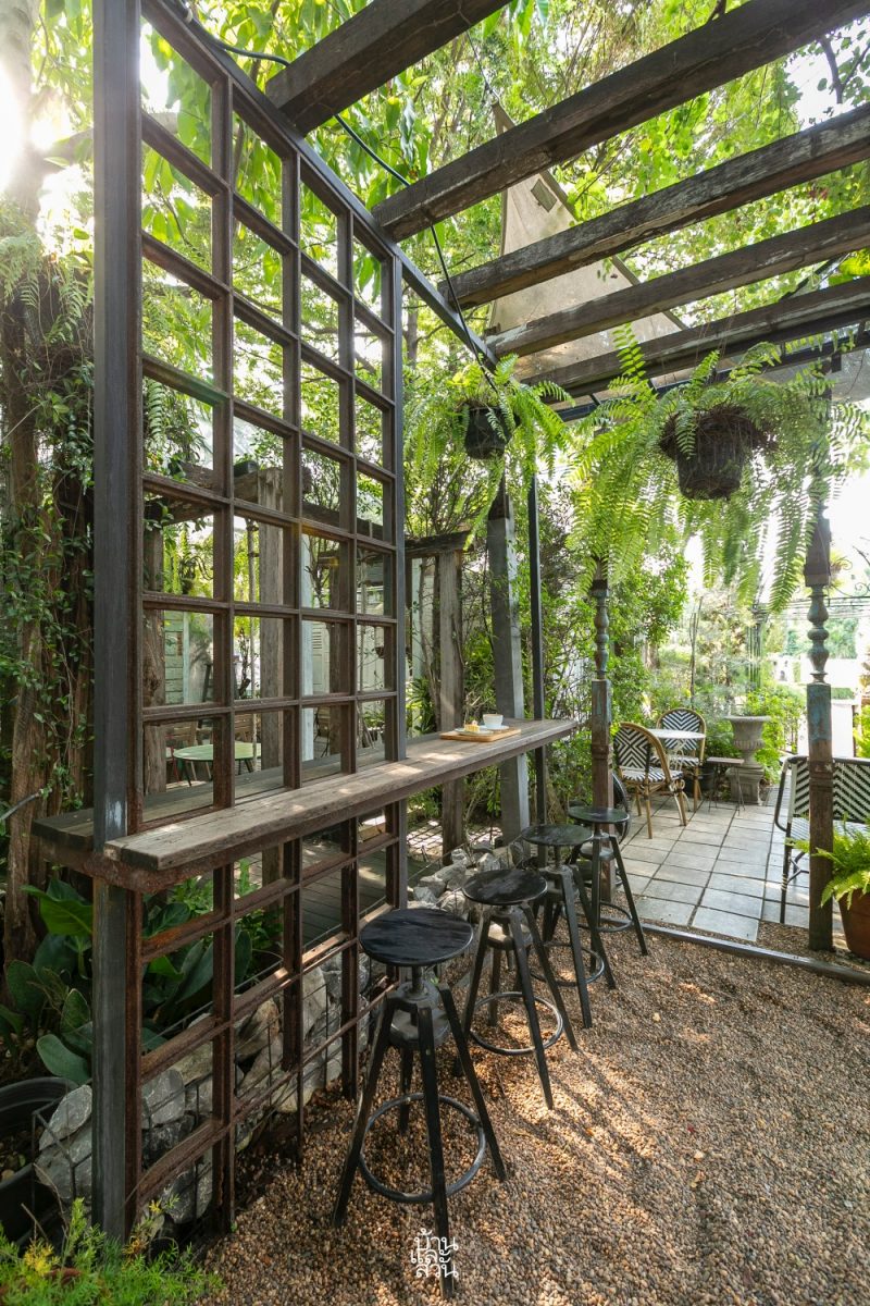 “ส่วนต้นไม้ใหญ่ที่เห็นเป็นของเดิมตั้งแต่สมัยทำร้านขายต้นไม้ครับ ผมไปเลือกซื้อมาเอง วางทิ้งไว้จนรากแทงลงดิน ผมเดินสำรวจรอบร้านและเขียนแปลนดูว่าตรงไหนที่พอจะมีพื้นที่ใส่อะไรแทรกลงไปได้บ้าง วางชุดเก้าอี้เพิ่มตรงไหนได้ บางส่วนที่เห็นเป็นของเดิมครับ เราแค่ปรับแต่งใหม่ไม่ได้รื้ออะไรออกไป เช่น ลำธารน้ำตก พื้นทางเดินในสวนบางจุด ตกแต่งเพิ่มเติมขึ้นมาใหม่บางส่วน เช่น กลาสเฮ้าส์ ศาลาในสวน ระเบียงไม้ ค่อย ๆ ทำแต่ก็ทำพร้อม ๆ กันทั้งหมดเพื่อเปิดเป็นคาเฟ่ คอนเซ็ปต์ที่ตั้งไว้คือนั่งกินข้าวจิบกาแฟกินขนมใต้ต้นไม้ใหญ่ในสวนหลังบ้านเพื่อนต่างชาติครับ