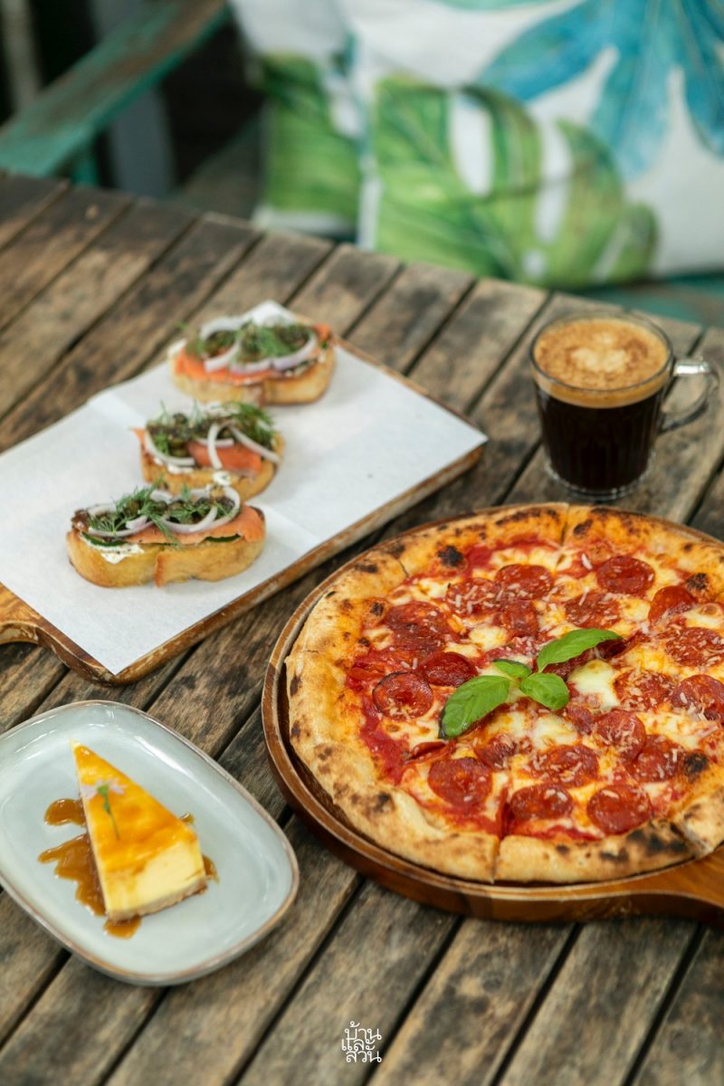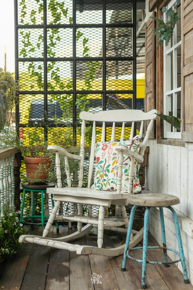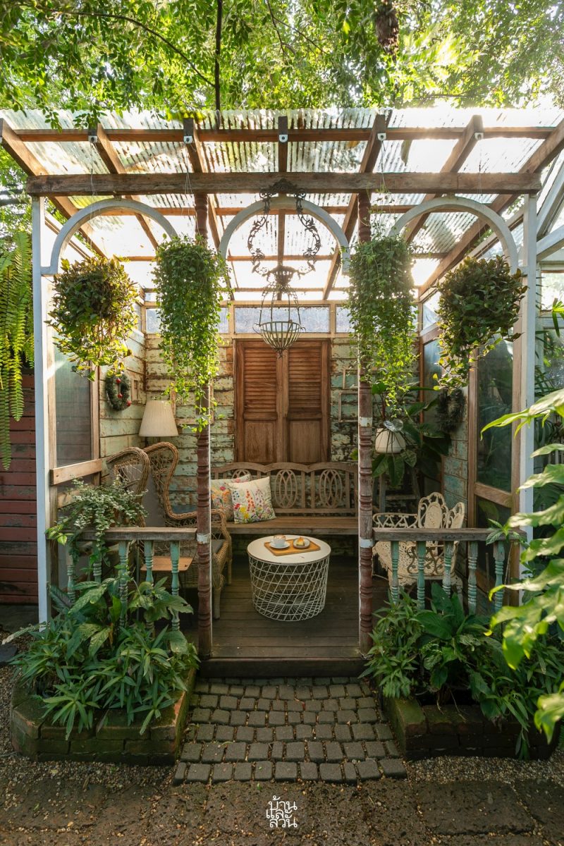 “ส่วนต้นไม้ใหญ่ที่เห็นเป็นของเดิมตั้งแต่สมัยทำร้านขายต้นไม้ครับ ผมไปเลือกซื้อมาเอง วางทิ้งไว้จนรากแทงลงดิน ผมเดินสำรวจรอบร้านและเขียนแปลนดูว่าตรงไหนที่พอจะมีพื้นที่ใส่อะไรแทรกลงไปได้บ้าง วางชุดเก้าอี้เพิ่มตรงไหนได้ บางส่วนที่เห็นเป็นของเดิมครับ เราแค่ปรับแต่งใหม่ไม่ได้รื้ออะไรออกไป เช่น ลำธารน้ำตก พื้นทางเดินในสวนบางจุด ตกแต่งเพิ่มเติมขึ้นมาใหม่บางส่วน เช่น กลาสเฮ้าส์ ศาลาในสวน ระเบียงไม้ ค่อย ๆ ทำแต่ก็ทำพร้อม ๆ กันทั้งหมดเพื่อเปิดเป็นคาเฟ่ คอนเซ็ปต์ที่ตั้งไว้คือนั่งกินข้าวจิบกาแฟกินขนมใต้ต้นไม้ใหญ่ในสวนหลังบ้านเพื่อนต่างชาติครับ