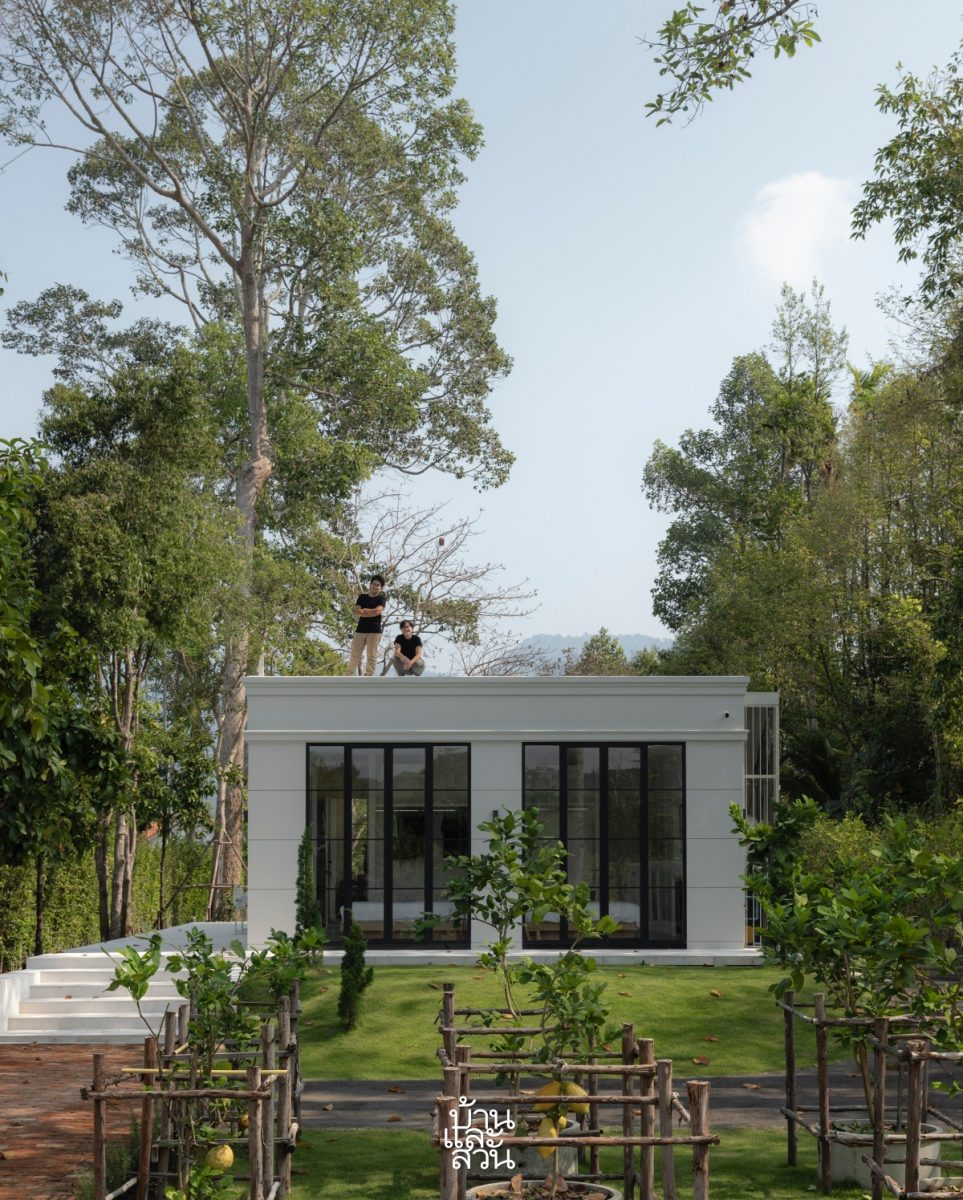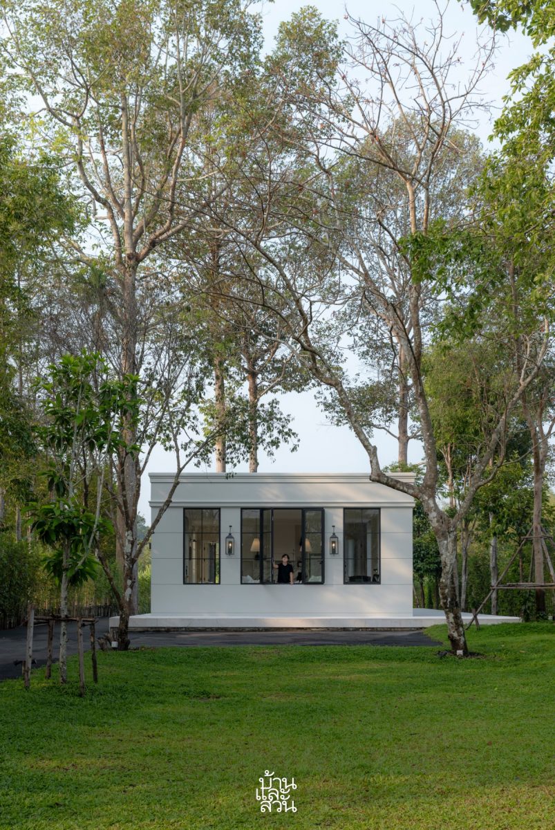 บ้านเล็กในสวน สีขาวในรูปทรงกล่อง ขนาดพื้นที่ 96 ตารางเมตร ตกแต่งให้อยู่สบายด้วยสไตล์โมเดิร์นคลาสสิก ในบริบทของบ้านสวนที่ปลูกผักไว้กินเองหลังบ้าน