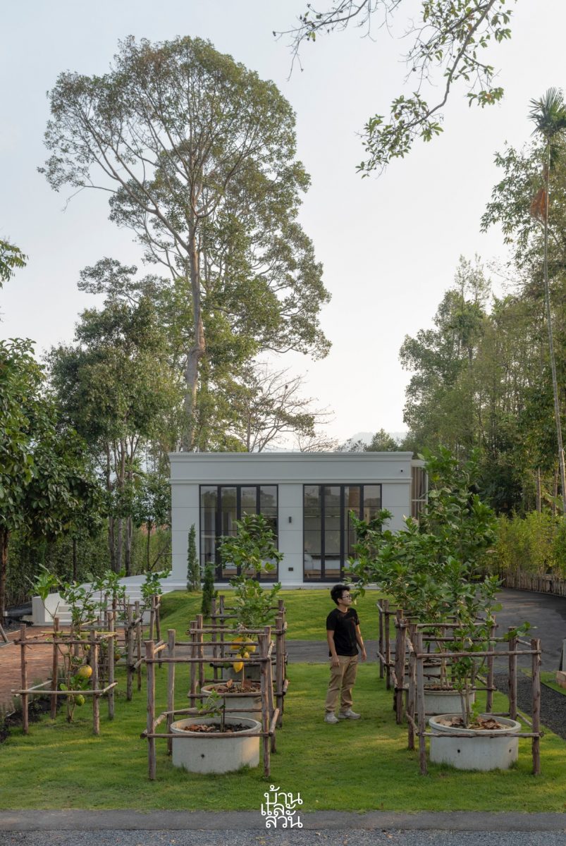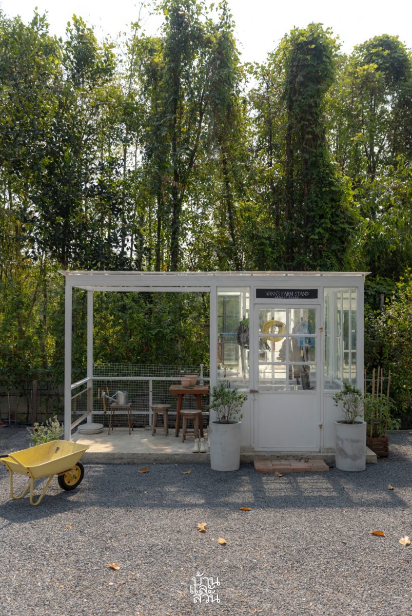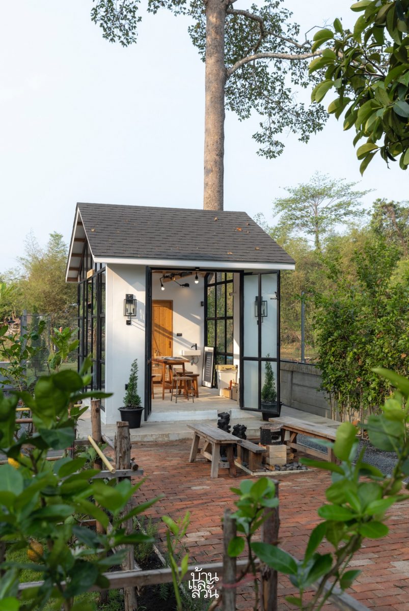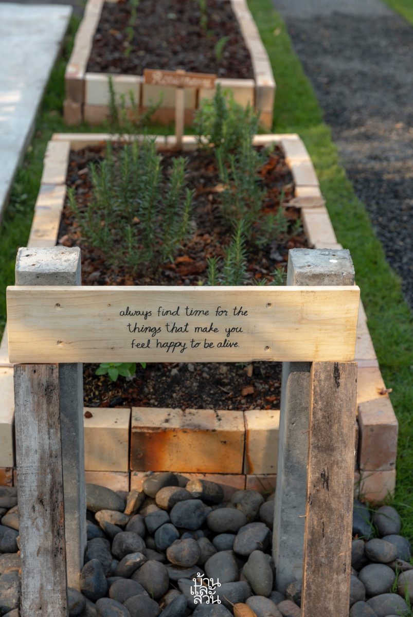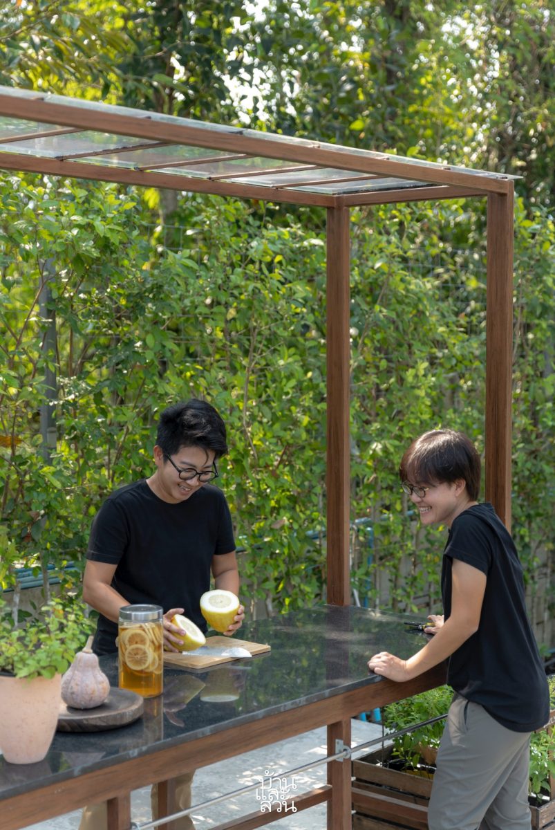 ออกจากตัวบ้านไปแล้ว หลังบ้านก็ยังมีฟังก์ชันน่ารัก ๆ ที่ทั้งคู่ออกแบบวางผังไว้ให้เป็นเหมือน Backyard สำหรับปลูกพืชผักและสมุนไพรสำหรับใช้ในชีวิตประจำวัน โดยมีแปลงหลักตรงกลางสำหรับปลูก เลมอน แซมด้วยพืชผักสวนครัวที่ใช้บ่อย พร้อมสร้างโรงเรือนสำหรับทำงานฝีมือแยกกับโรงเรือนเก็บอุปกรณ์เครื่องมือสวน และพื้นที่สำหรับเตาปิ้งย่างกับครัวไทยที่วางแผนไว้ว่าจะทำเตาอบพิซซ่าในอนาคตด้วย