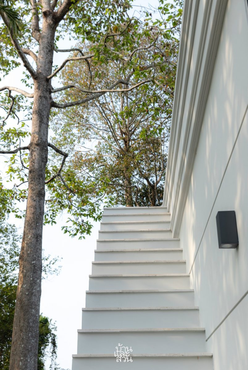 “องค์ประกอบสภาพแวดล้อมทั้งหมดนี้มีผลต่อการออกแบบตัวบ้านค่อนข้างมาก และเราก็ชอบต้นไม้ใหญ่ เลยเลือกที่จะสร้างบ้านเป็นอาคารทรงสี่เหลี่ยมที่มีหลังคาเป็นดาดฟ้าเพื่อเพิ่มความแข็งแรงของตัวบ้านเผื่อไว้เลย เพราะเคยเห็นกิ่งยางนาที่ร่วงลงมาค่อนข้างใหญ่ ถ้าทำหลังคาจั่วหรือหลังคาเบาก็อาจเสียหายและเสียค่าซ่อมแซมทีหลัง อีกอย่างคือดาดฟ้าโล่งทำให้ขึ้นมาใช้ฟังก์ชันด้านบนทำกิจกรรมต่าง ๆ ได้ด้วย ทั้งนั่งเล่น กางเต็นท์ ดูดาว บางคืนก็มองเห็นทางช้างเผือกด้วย”