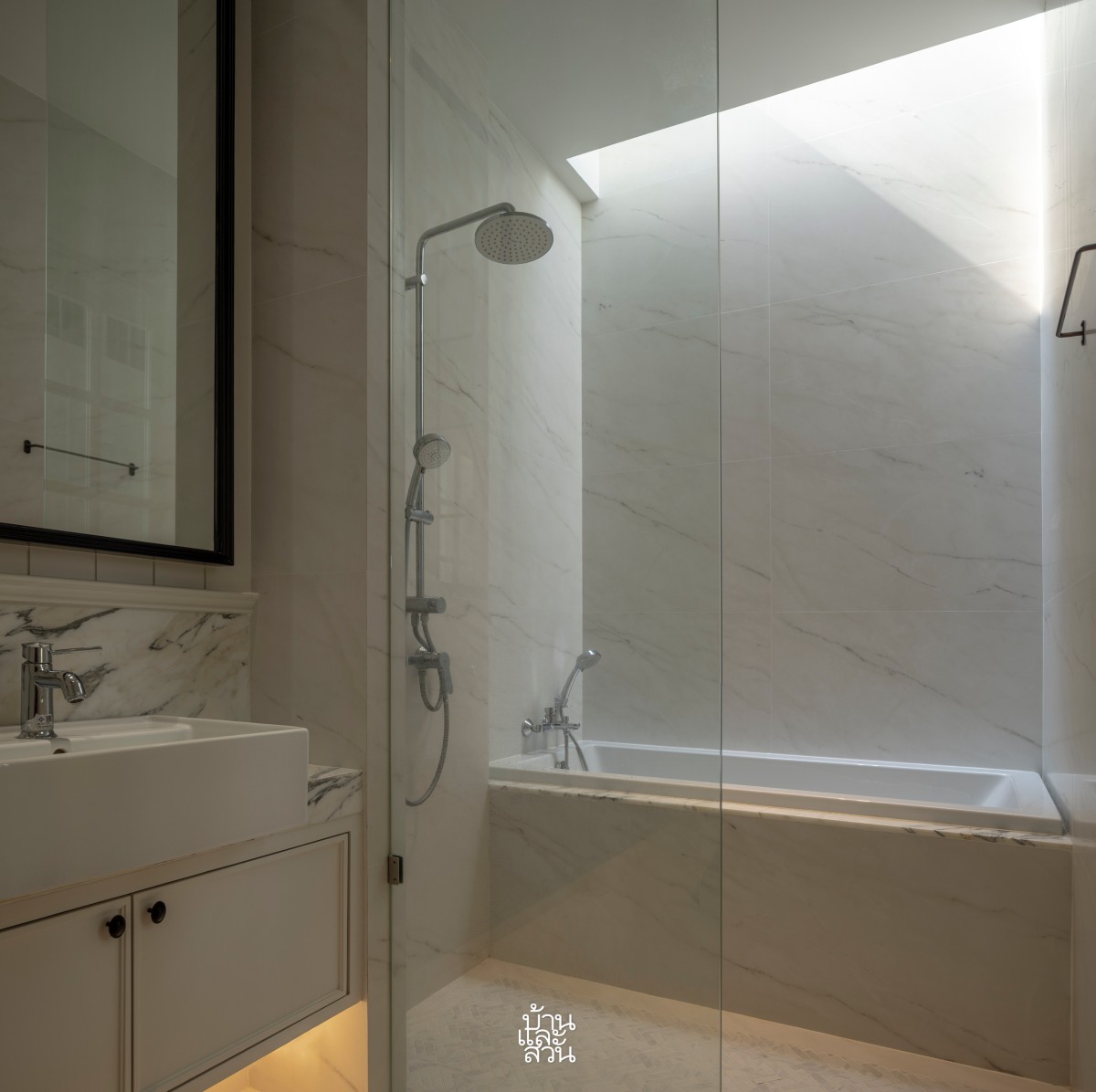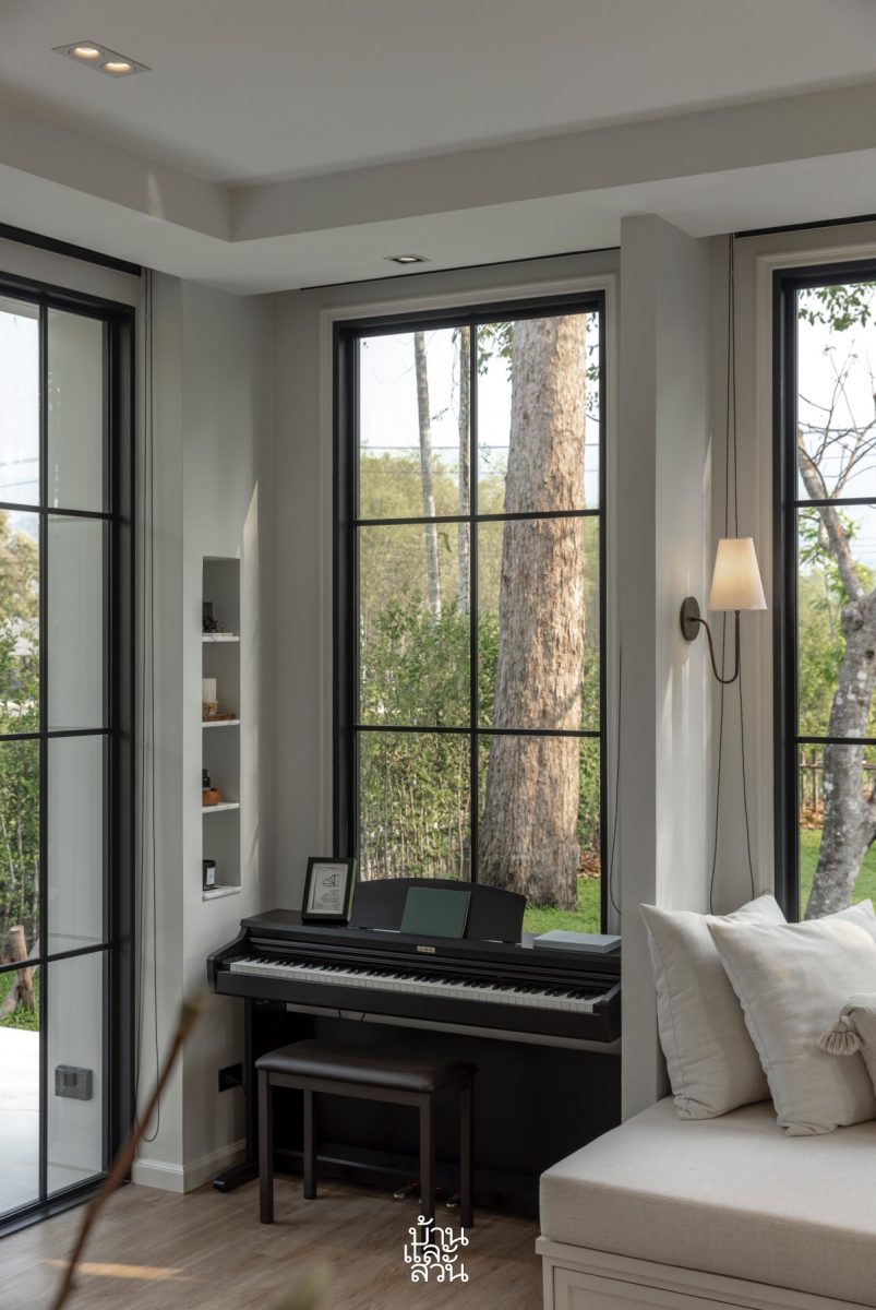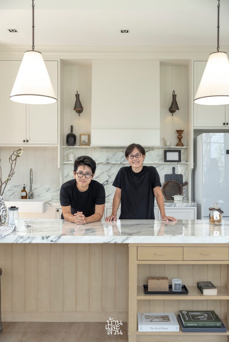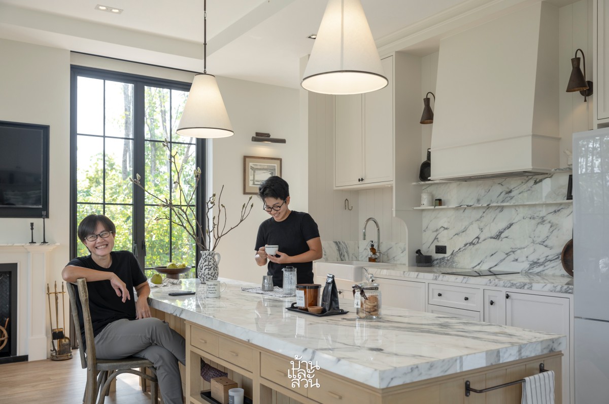 “เราเปิดสเปซในบ้านให้สูงเกือบ 3 เมตร แล้วแต่งด้วยสไตล์โมเดิร์นคลาสสิกผสมความเป็น Farmhouse Boutique Hotel ที่เน้นความสบาย ใช้โทนสีขาวเป็นหลักตัดด้วยสีดำให้ดู Timeless เพื่อให้บ้านดูโมเดิร์นอยู่ตลอด ไม่ล้าสมัย ผสมด้วยกลิ่นอายแบบชนบทของฝรั่งเศสจากเฟอร์นิเจอร์และของตกแต่ง ทั้งโคมไฟวินเทจ หินอะลาเบสกาโต้ ลายเส้นที่กรุผนัง รูปภาพสีพาสเทลที่บอกเล่าเรื่องราวการใช้ชีวิต ส่วนใหญ่พื้นที่ใช้งานหลักของเราจะอยู่ตรงบริเวณ Kitchen Island ที่แชร์ฟังก์ชันร่วมกัน ทั้งทำงาน กินข้าว นั่งเล่น ดื่มกาแฟ เล่นเปียโน ถึงจะอยู่กันคนละมุมแต่ก็ยังมองเห็นและสื่อสารกันได้ตลอด”