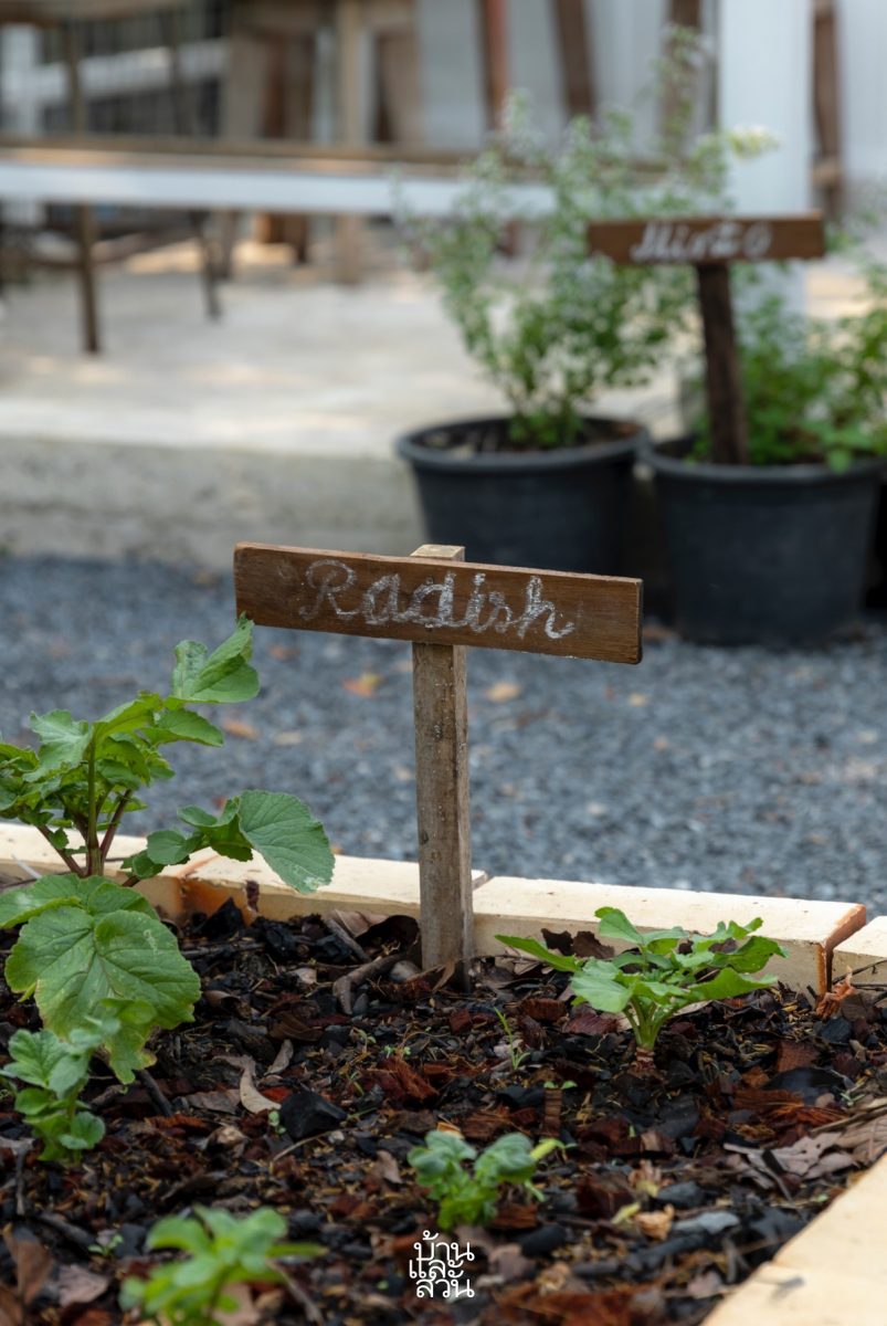 “เราเน้นปลูกพืชผักตามไลฟ์สไตล์ตัวเองในปริมาณที่พอสำหรับใช้เอง ตอนนี้มีเลมอน กาแฟ มินต์ โรสแมรี่ กะเพรา โหระพา และเรดิช เน้นการเข้าถึงดูแลง่าย และปลอดภัย และก็ยังมีพื้นที่ริมคลองหลังบ้านที่วางเตาเผาถ่านสำหรับทำน้ำส้มควันไม้ไว้ฉีดไล่แมลง กับลานปรุงดินจากใบไม้ในสวน เพราะเราอยากทำที่นี่ให้เป็นเหมือน Land Lab ของคนที่มาจากเมืองอย่างเราได้เรียนรู้ ทำความเข้าใจ และสามารถอยู่กับความเป็นชนบทได้อย่างยั่งยืน