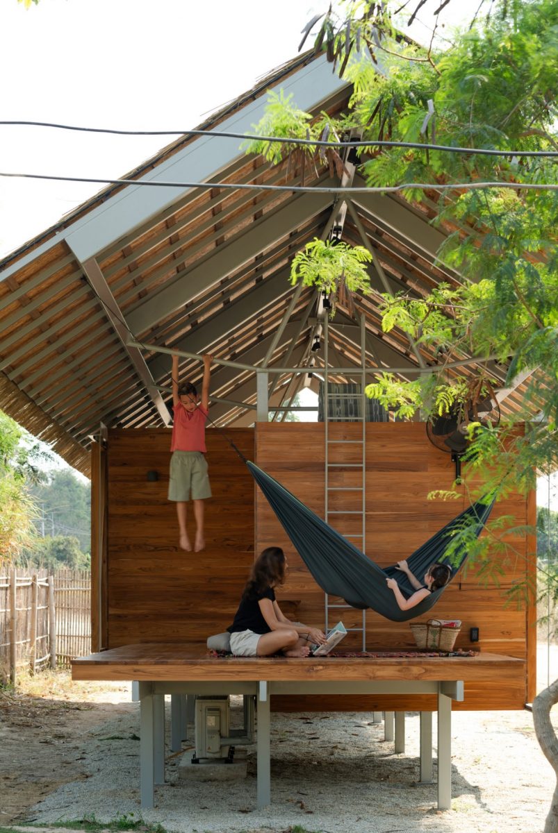 บ้านหลังน้อยที่มีพื้นที่ใช้สอย 45 ตารางเมตรนี้สร้างขึ้นเพื่อให้เด็ก ๆ ได้อยู่และได้เล่นอย่างสนุก ในช่วงเวลาที่ออกมาพักผ่อนอยู่ท่ามกลางธรรมชาติ ด้วยโครงสร้างเหล็กที่สามารถสร้างขึ้นได้เร็วและเอื้อต่องานออกแบบผนังที่เปิดโล่ง รวมไปถึงการยกโครงสร้างหลังคาให้ลอยขึ้น แล้วมุงด้วยไม้ไผ่ส่วนฝ้าภายในกรุเป็นไม้อัด OSB ทำให้ผืนหลังคาดูบางเบาและยังมีสเปซว่าง ๆ ระหว่างห้องนอนและหลังคาซึ่งกลายเป็นมุมน่าสนุกสำหรับเด็ก ๆได้รู้สึกเหมือนกำลังผจญภัย >> อ่านต่อ
