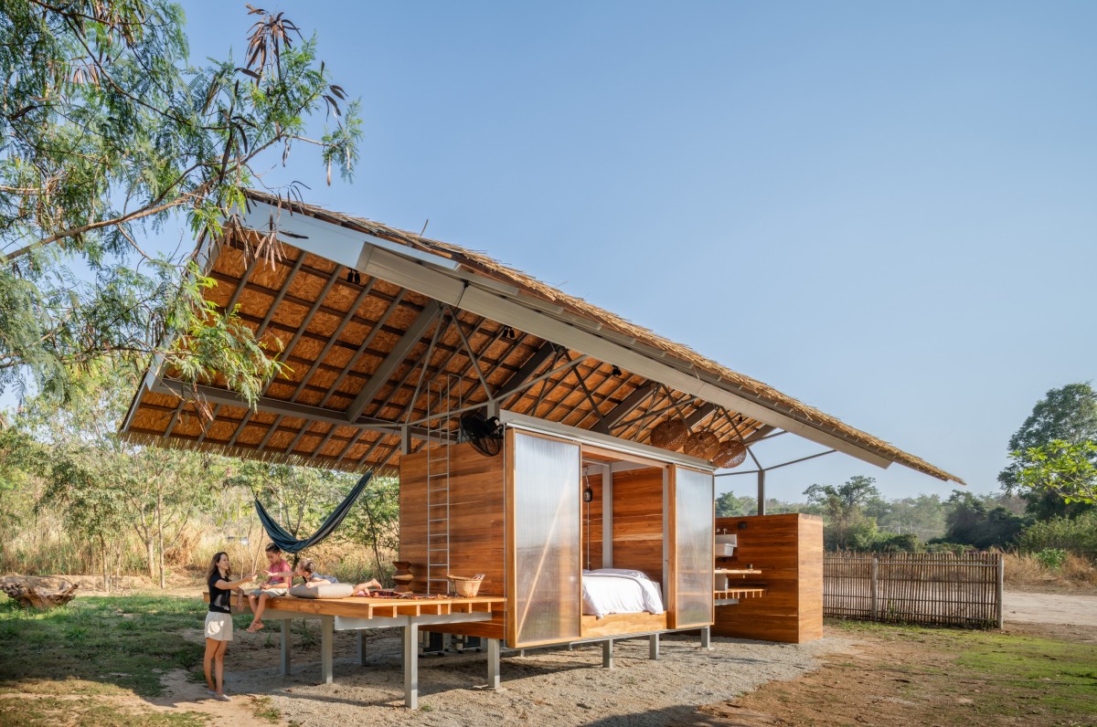 บ้านกลางทุ่งนา 40 ไร่ในจังหวัดหนองบัวลำภูที่ออกแบบให้สอดรับกับกิจกรรมการทำเกษตรอินทรีย์สมัยใหม่ โดยแบ่งพื้นที่ออกเป็น 3 ส่วน ได้แก่ ส่วนในบ้านที่มีห้องนอนเป็นชั้นลอย ห้องน้ำ ครัวเล็กๆ และพื้นที่ห้องนั่งเล่น ส่วนชานที่มีหลังคา และส่วนชานที่ไม่มีหลังคา เติมกิมมิกเก๋ๆด้วยการเลือกใช้เฟอร์นิเจอร์แคมปิ้งที่ยกย้ายได้ตามการใช้งาน ตามประสาคนที่ชื่นชอบการใช้ชีวิตแบบเอาต์ดอร์ >> อ่านต่อ