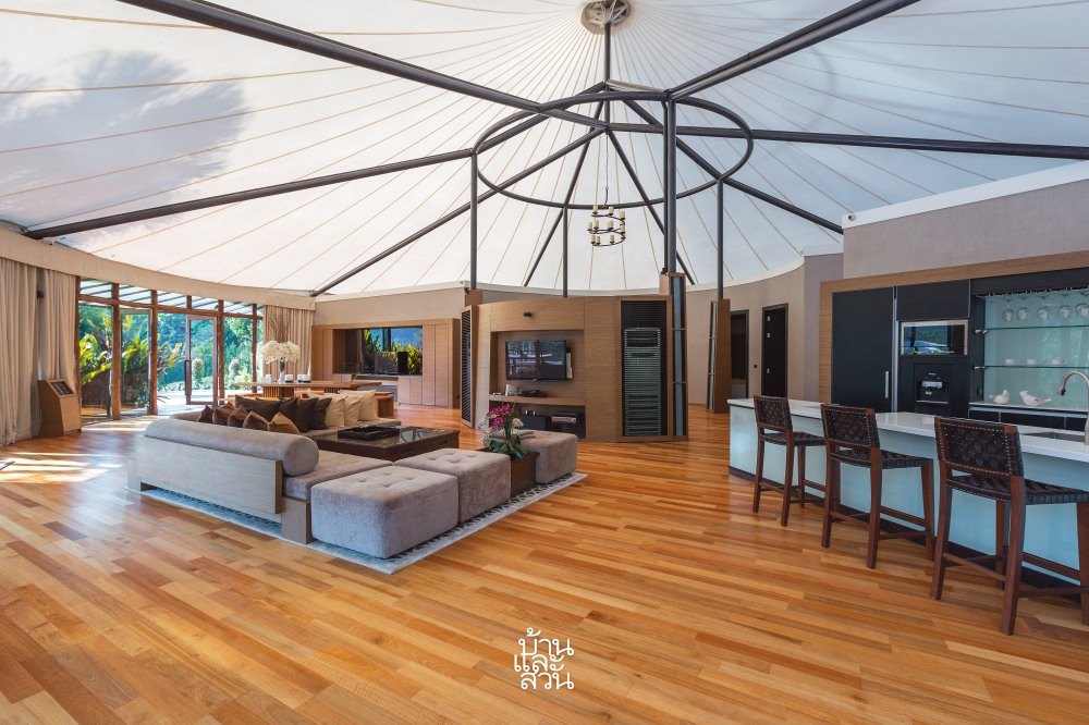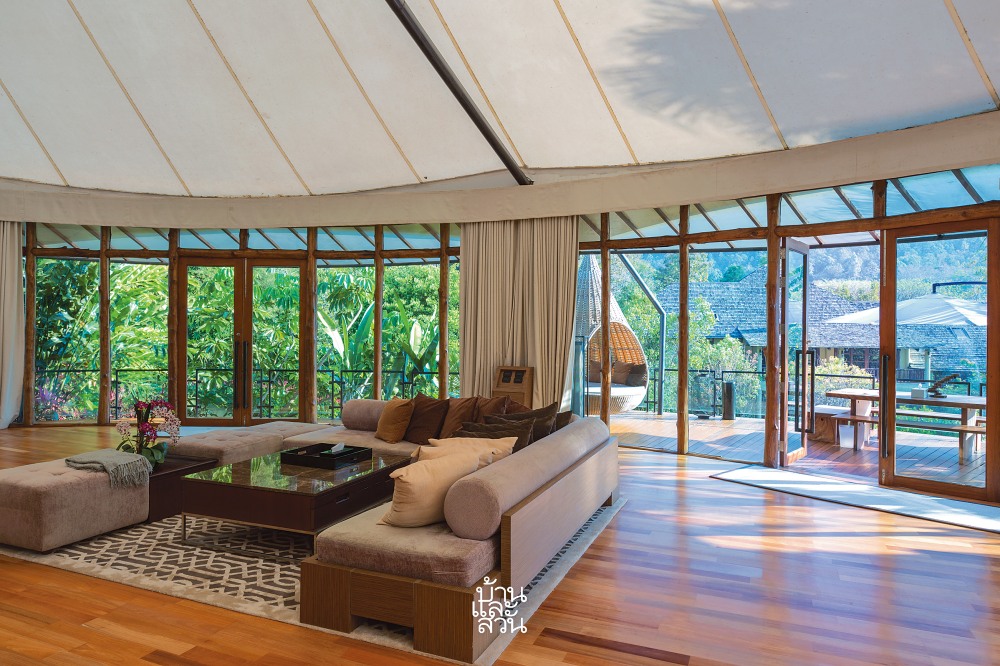 บ้านนี้ไม่ใช่เต็นท์ทั่วไปที่ใช้เวลาประกอบไม่นานและใช้งานแบบชั่วคราว หากมีลักษณะไม่ต่างจากบ้านทั่วไปซึ่งมีความแข็งแรงมากพอจะอยู่อาศัยได้นานนับสิบปี ทนต่อสภาพดินฟ้าอากาศ ตัวบ้านมีลักษณะเป็นโครงสร้าง Tension Membrane ซึ่งเป็นโครงสร้างของหลังคาผ้าใบแรงดึงสูง ดูเหมือนกระโจมดอกเห็ดที่มียอดแหลมตรงกลางสูงประมาณ 8 เมตร ส่วนหลังคาเป็นผ้าใบเย็บต่อกันเป็นรูปวงกลม และยึดขอบด้วยเสาเหล็กที่อยู่นอกตัวบ้านเป็นช่วงๆโดยรอบ ทำให้บ้านดูโดดเด่นและมีดีไซน์เฉพาะตัว เปลี่ยนบรรยากาศของการอยู่อาศัยให้เหมือนกำลังพักผ่อนในแนวผจญภัย >> อ่านต่อ