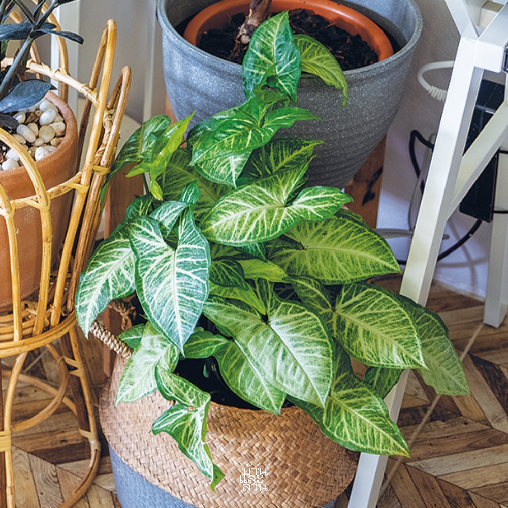 Syngonium podophyllum Schott ปัจจุบันมีหลายพันธุ์ที่มีสีสันแตกต่างกันไป และมีชื่อที่เป็นมงคล เช่น ออมนาค ออมเงิน ออมทอง เชื่อว่าผู้ใดปลูกเลี้ยงจะร่ำรวย มีเงินใช้ไม่ขาดมือ เป็นไม้ที่ทนร่ม จึงเป็นไม้ยอดฮิตในการปลูกในอาคาร ห้องน้ำ ห้องทำงาน หรือห้องครัว หากหมั่นตัดแต่งจะทำให้มีทรงพุ่มที่แน่นสวยงาม