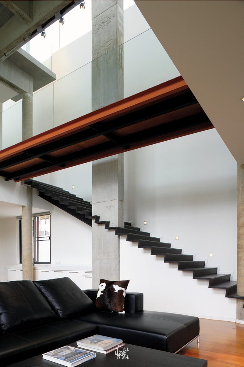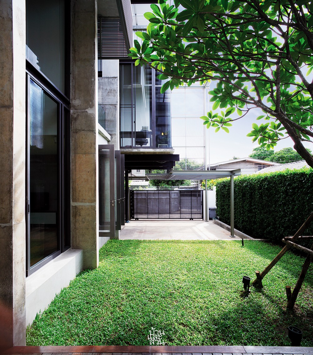ผู้ออกแบบยังได้นำแนวคิดของบ้านเรือนไทยมาประยุกต์กับบ้านสไตล์โมเดิร์นได้อย่างกลมกลืน เช่น การยกพื้นสูงเพื่อป้องกันการเสื่อมสภาพของวัสดุปูพื้นอันเนื่องมาจากความชื้นจากพื้นดิน การออกแบบให้ชายคายื่นยาวเพื่อให้เกิดร่มเงาแก่ตัวบ้าน รวมทั้งการมีช่องเปิดเป็นสวนอยู่ตรงกลางบ้านคล้ายกับลานกลางบ้านของเรือนไทย เพื่อให้เกิดการถ่ายเทของอากาศภายในบ้าน เกิดเป็น บ้านโมเดิร์นกลิ่นอายไทยประยุกต์ หลังนี้