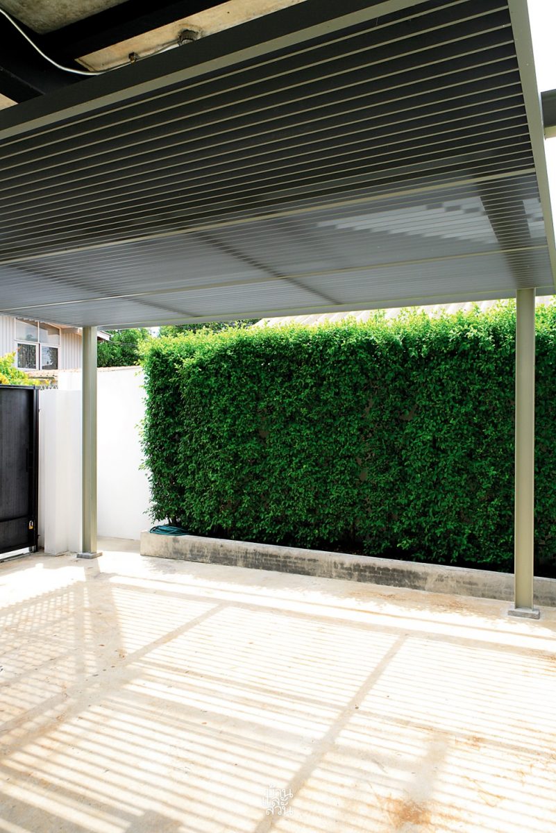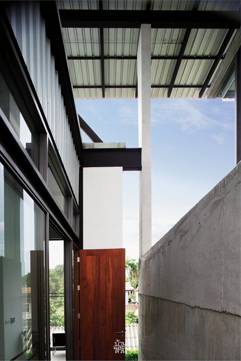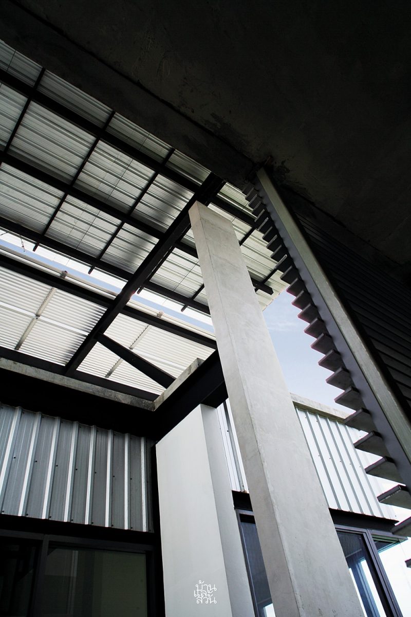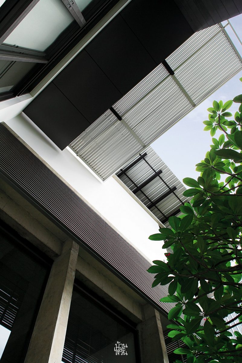 สำหรับประเด็นที่เจ้าของบ้านไม่อยากให้มีหลังคาเอียงนั้น อาจารย์พิรัสกล่าวว่า “ผมทำหลังคาสองชั้นที่มีลักษณะคล้ายกับเพิงหมาแหงนคลุมทับอยู่บนแผ่นหลังคาเรียบอีกชั้น โดยมีการเว้นที่ว่างเพื่อให้อากาศสามารถไหลเวียนได้ ซึ่งเป็นการช่วยระบายความร้อนไปในตัว”