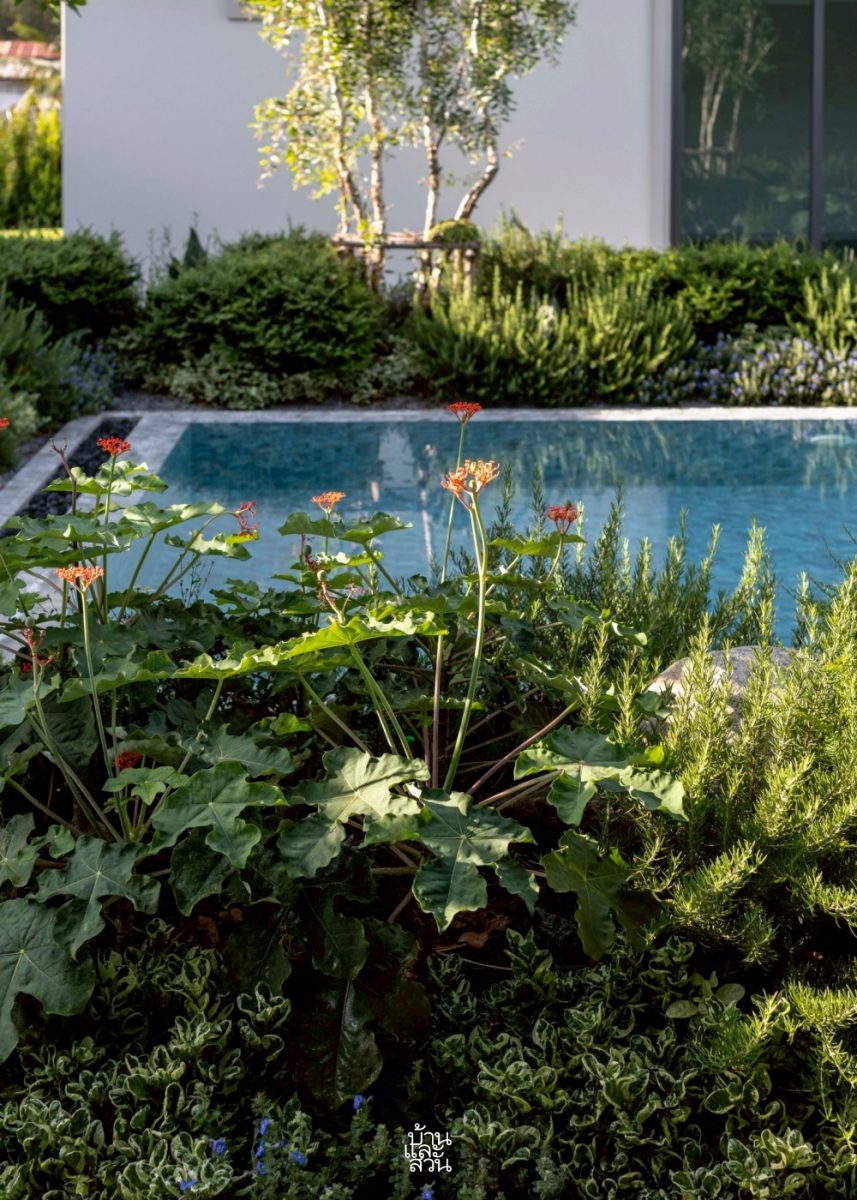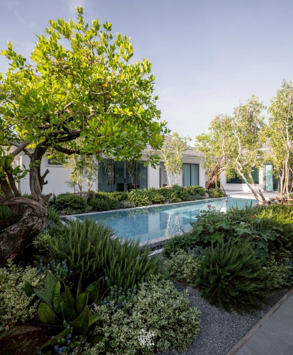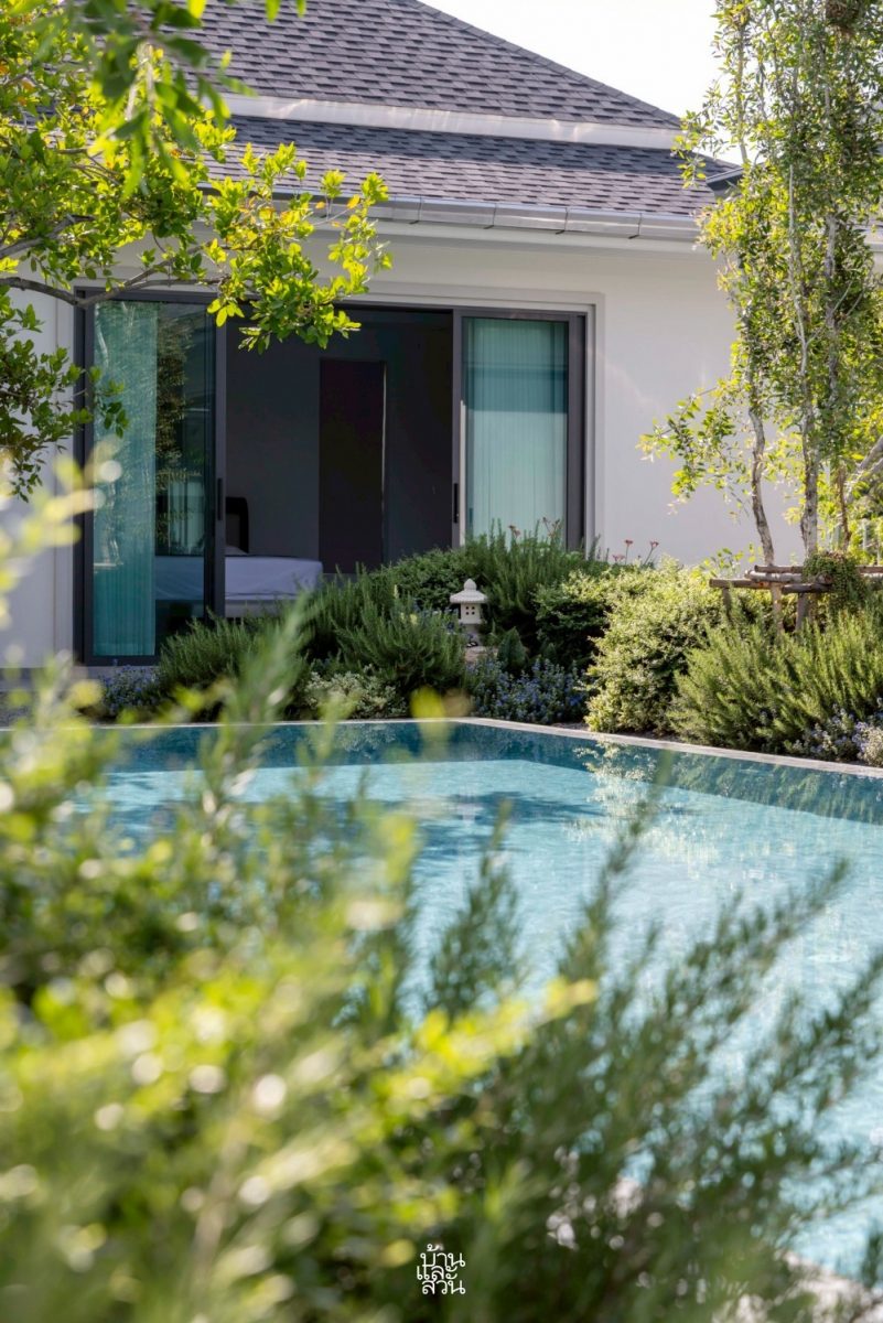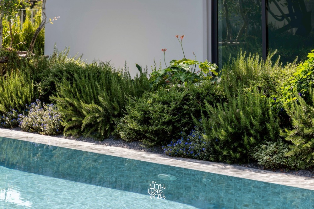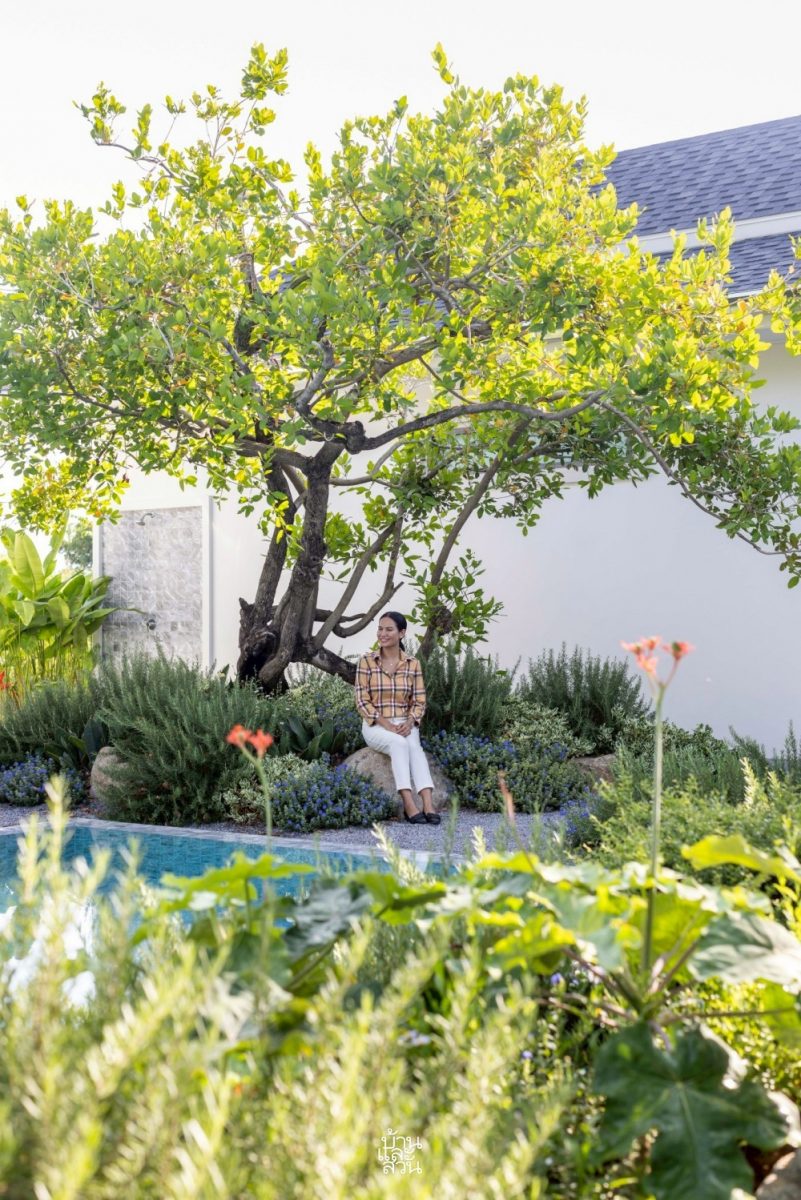 “ย้อนไปเมื่อปีที่แล้ว เจอ คุณเปิ้ล-คเชนทร์ ศรีมาก ทำสวนให้คาเฟ่ใกล้บ้านซึ่งเป็นร้านประจำของเรา ชอบการทำงานของคุณเปิ้ลนะคะ แต่พื้นที่สวนบ้านเราน้อย ยังกลัวว่าจะไม่ยอมมาทำให้ พอคุณเปิ้ลตอบ ตกลง ดีใจมาก ๆ ค่ะ อยากได้สวนรอบสระว่ายน้ำที่มีความเป็นธรรมชาติ และอยากให้สวนดูเชื่อมโยงกับเขาเต่าที่อยู่ข้างบ้าน เดินเข้ามาเห็นคือว้าวเลยค่ะ”