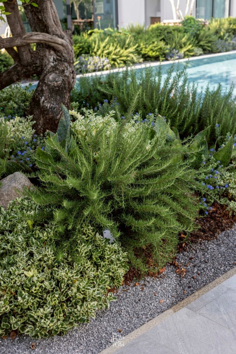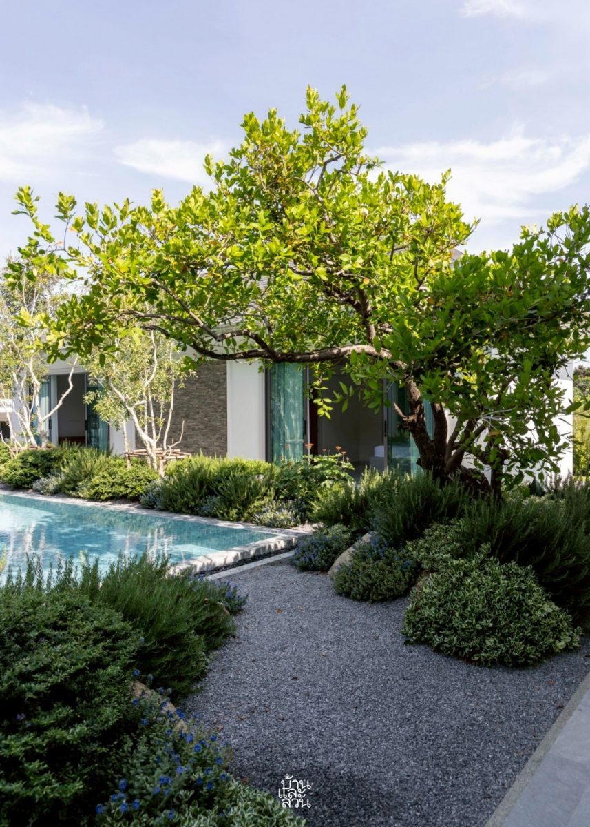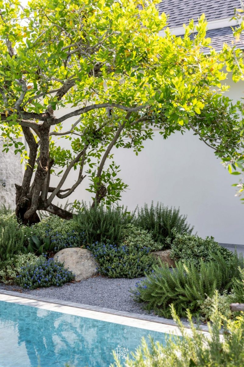 “บ้านนี้ใช้สีเอิร์ธโทน น้ำตาล ขาว เทา ดำเป็นหลัก ต้นไม้ที่เลือกใช้จะมีสีเทาผสมเพื่อให้ดูเชื่อมโยงและกลมกลืนกับสีของบ้าน เช่น เสม็ดขาว เสม็ดแดง หว้าแม่น้ำโขง โรสแมรี่ ฟ้าประดิษฐ์ ม่วงเจริญ ครีบปลาวาฬ เกล็ดแก้ว ผมเดาว่าคุณแอนชอบไม้ดอก ซึ่งเป็นปกติของผู้หญิง เลือกใช้สีที่ไม่ฉูดฉาด คุมให้อยู่ในโทนสีขาว สีฟ้า สีม่วง ซึ่งเป็นโทนสีกลาง ๆ เข้ากับสีเทาโทนเย็นของใบไม้ได้ดี ที่สำคัญคือต้องเป็นต้นไม้ที่ดูแลง่าย ไม่ต้อง ตัดแต่งบ่อย เลือกชนิดที่มีฟอร์มต้นสวยงาม ปล่อยให้เติบโตฟรีฟอร์มตามธรรมชาติ อาจมีบางชนิดที่ตัดแต่งเป็นพุ่มกลม เช่น ม่วงเจริญ เพื่อให้เป็นมวลกลม ๆ ล้อไปกับหินประดับสวน แต่ก็ดูคอนทราสต์กับโรสแมรี่ ครีบปลาวาฬที่แตกกิ่งแตกใบชี้พุ่งขึ้นในแนวตั้ง ทำให้มีรายละเอียดที่น่าสนใจมากขึ้น ที่สำคัญคือต้องตัดแต่ง เพื่อควบคุมความสูงและขนาดพุ่มต้น ส่วนต้นไม้ใหญ่เราจะเลี้ยงบางกิ่งไว้ให้เติบโตทอดยาวทางด้านข้าง เพื่อสร้างร่มเงา และเติมเต็มสเปซในอากาศให้ดูสวยงามมีศิลปะมากขึ้นครับ