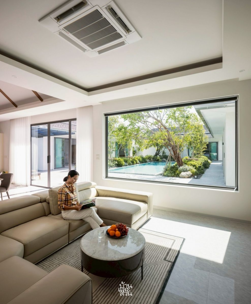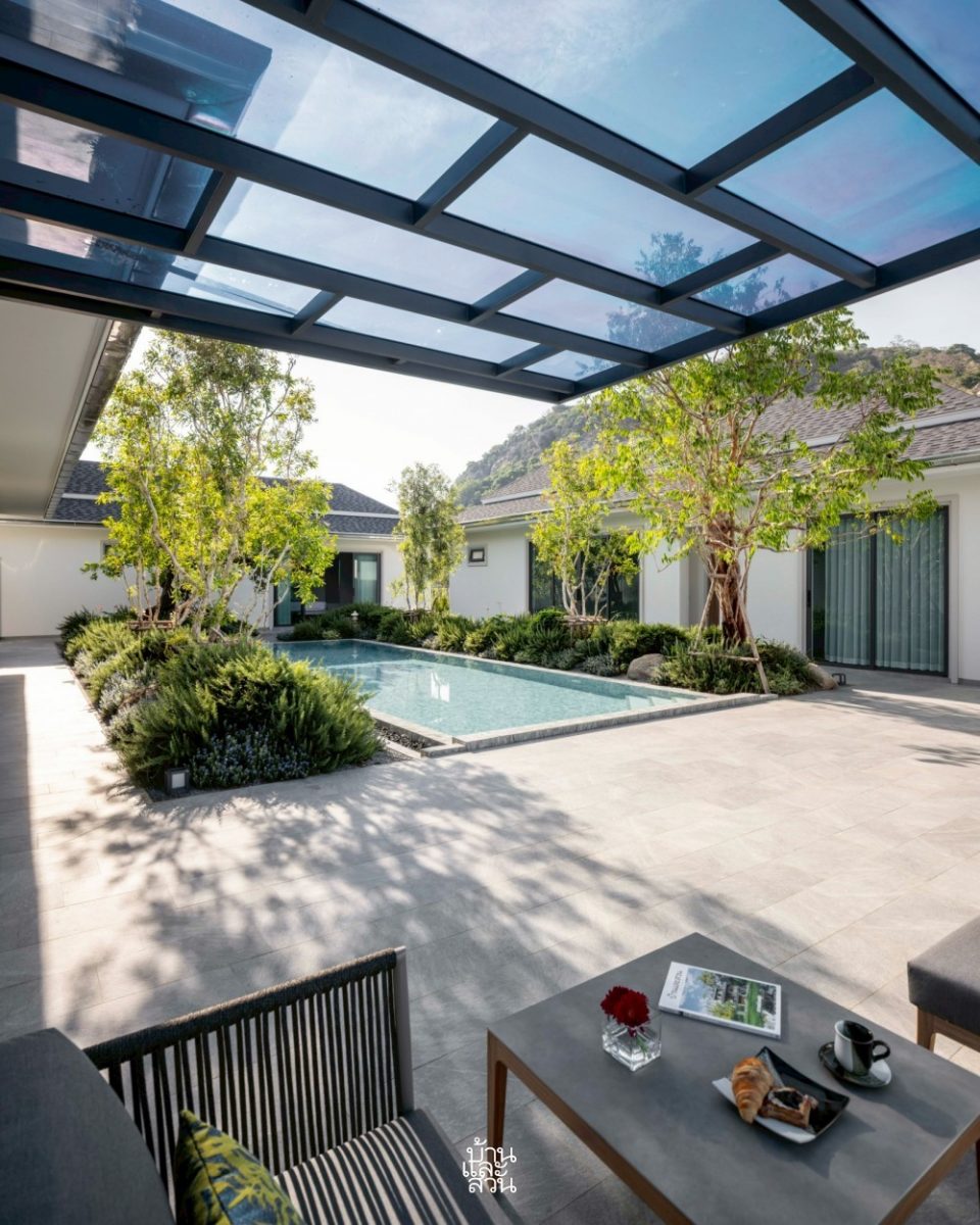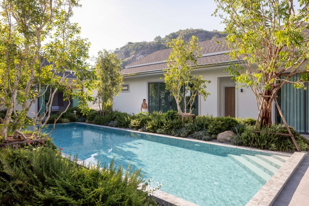“ตั้งใจอยากมีบ้านที่เขาใหญ่ค่ะ แต่พอมาเจอที่ตรงนี้ ด้านหนึ่งติดภูเขา อีกฝั่งเป็นอ่างเก็บน้ำเขาเต่า และอยู่ใกล้ทะเล ก็ตัดสินใจลงหลักปักฐานที่นี่เลยค่ะ แต่ด้วยพื้นที่อยู่ใกล้เขตพระราชฐาน ทำให้สร้างอาคารสูงได้ไม่เกิน 6 เมตรค่ะ ตั้งใจให้สระว่ายน้ำอยู่ตรงกลางตั้งแต่แรก ไว้ให้หลาน ๆ มาเล่นในวันพักผ่อน ล้อมรอบ ด้วยห้องต่าง ๆ คล้ายบ้านพูลวิลล่า ให้อารมณ์เหมือนกำลังพักผ่อนในรีสอร์ตค่ะ” คุณแอน-รัตนาภรณ์ จินดาศรี เจ้าของบ้าน เกริ่นถึง สวนป่ารอบสระว่ายน้ำกลางแจ้ง แห่งนี้