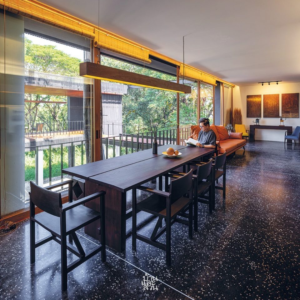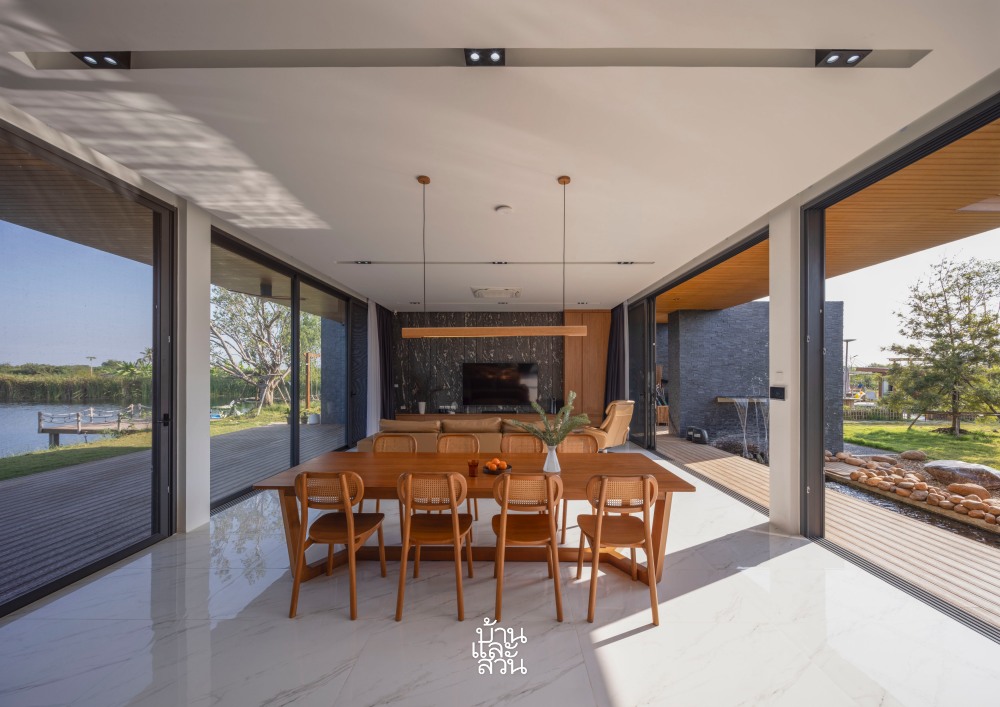 ห้องขนาดใหญ่ที่รวมทั้งมุมนั่งเล่น โต๊ะกินข้าว และครัวไว้ในพื้นที่เดียวกัน พร้อมรองรับการปาร์ตี้ต้อนรับเพื่อนฝูงได้เป็นจำนวนมาก จึงมีระยะพื้นที่ว่างโดยรอบ ให้สะดวกในการเดินไปมา และ เปิดรับวิวธรรมชาติได้ทั้งสองฝั่ง