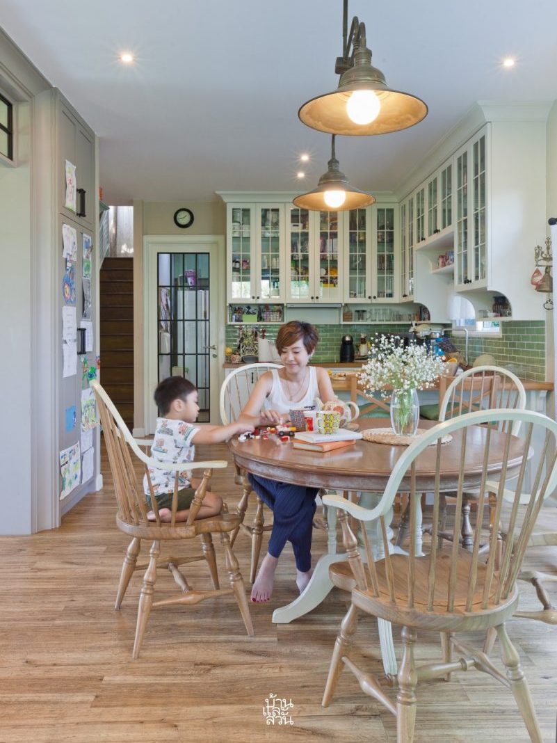 โต๊ะกินข้าวทรงกลมวางต่อเนื่องกับมุมครัว เหมาะกับบ้านที่มีเด็กที่สามารถเข้าถึงและใช้งานได้จากทุกมุม