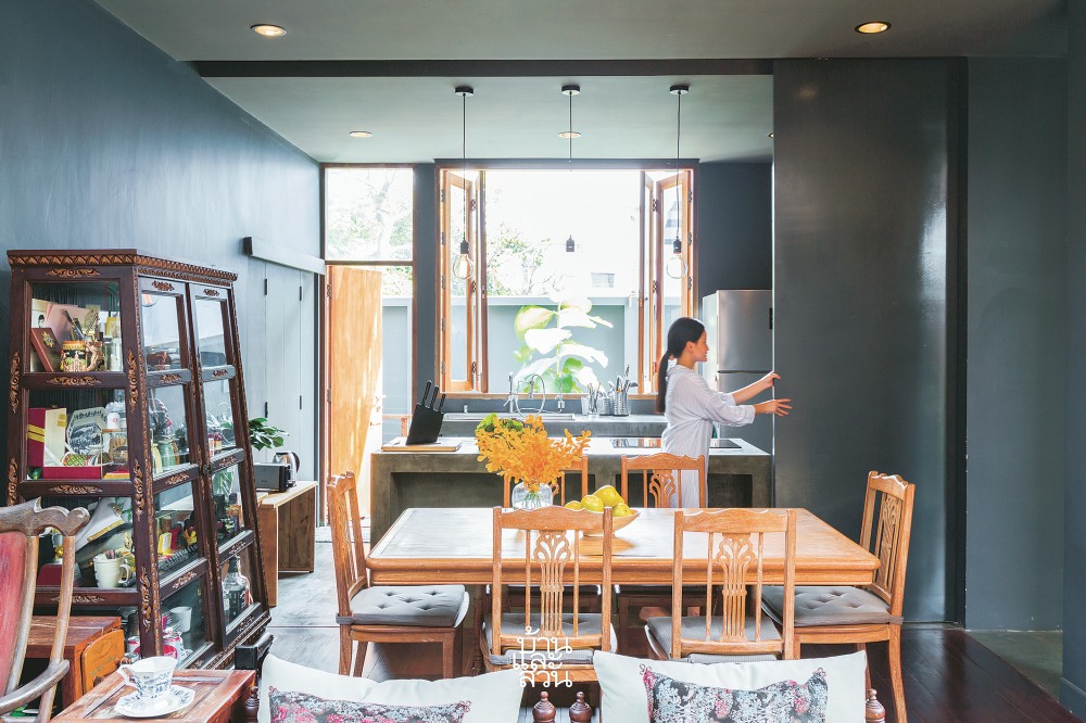 วางโต๊ะกินข้าวไว้ตรงกลาง เว้นระยะโดยรอบให้เดินได้สะดวก มีตู้เก็บของใกล้ ๆ ให้หยิบใช้งานได้สะดวก
