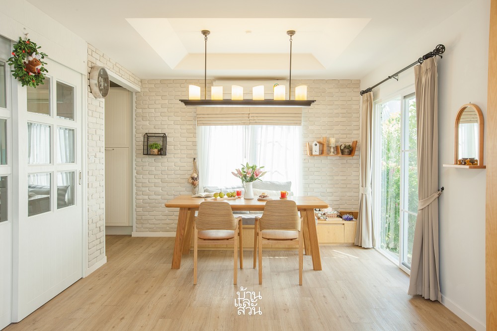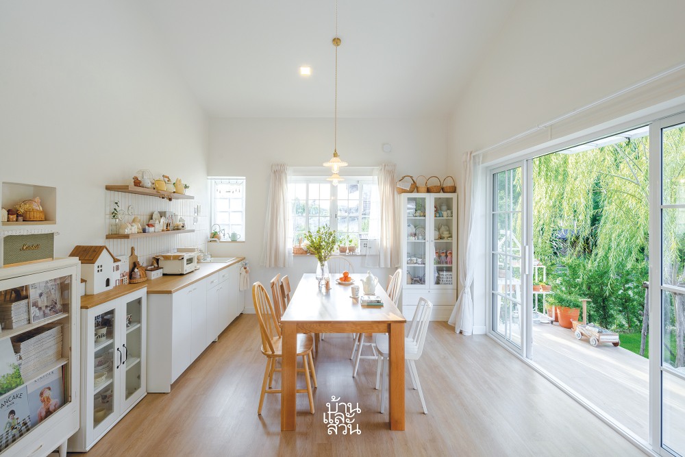 โต๊ะกินข้าวในบรรยากาศอบอุ่น ตกแต่งด้วยเฟอร์นิเจอร์ไม้ และ ข้าวของเครื่องใช้น่ารัก ๆ วางโต๊ะขนานไปกับที่นั่งริมหน้าต่าง รับแสงอุ่น ๆ และเห็นวิวสวนอยู่ใกล้ ๆ