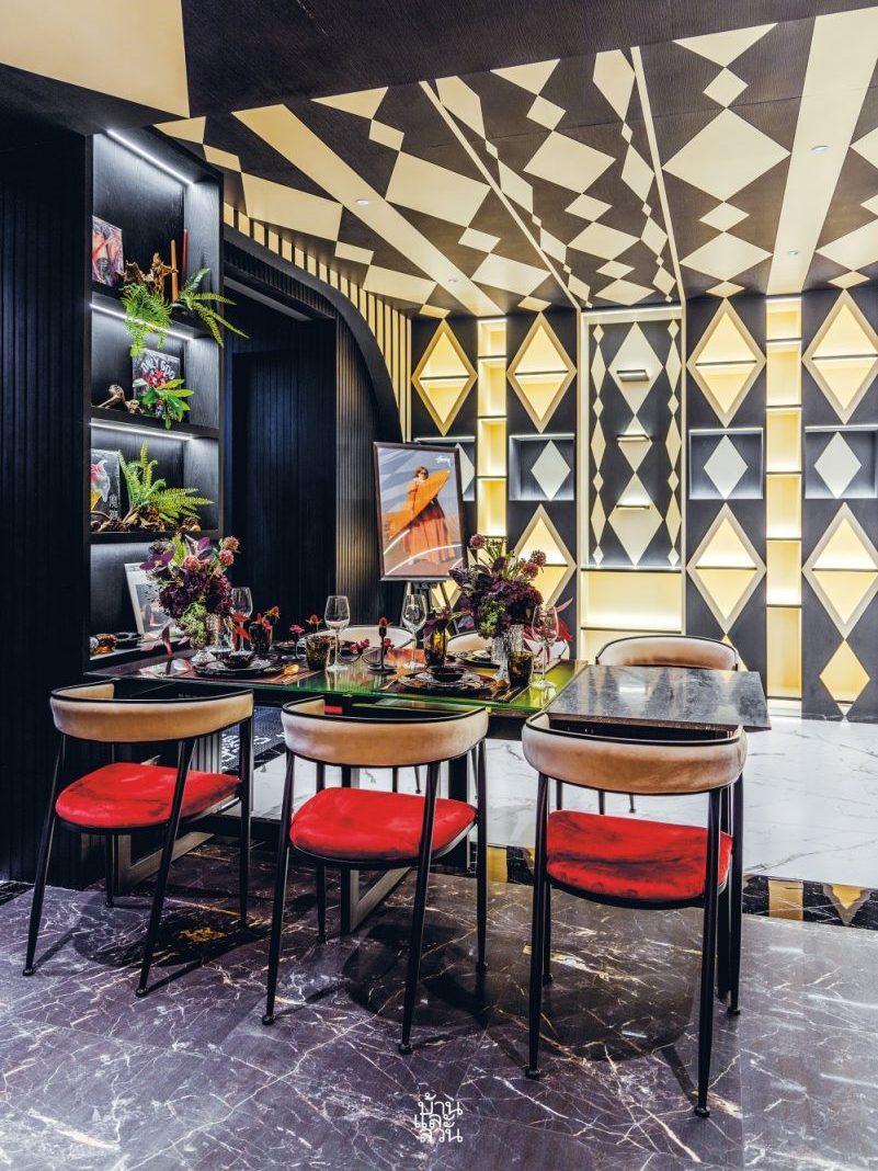 มุมรับประทานอาหารตกแต่งให้ดูตื่นเต้ นแปลกตาด้วยเส้นสายลวดลายกราฟิก และเก้าอี้ผ้าบุกำมะหยี่ที่ดูหรูหรา