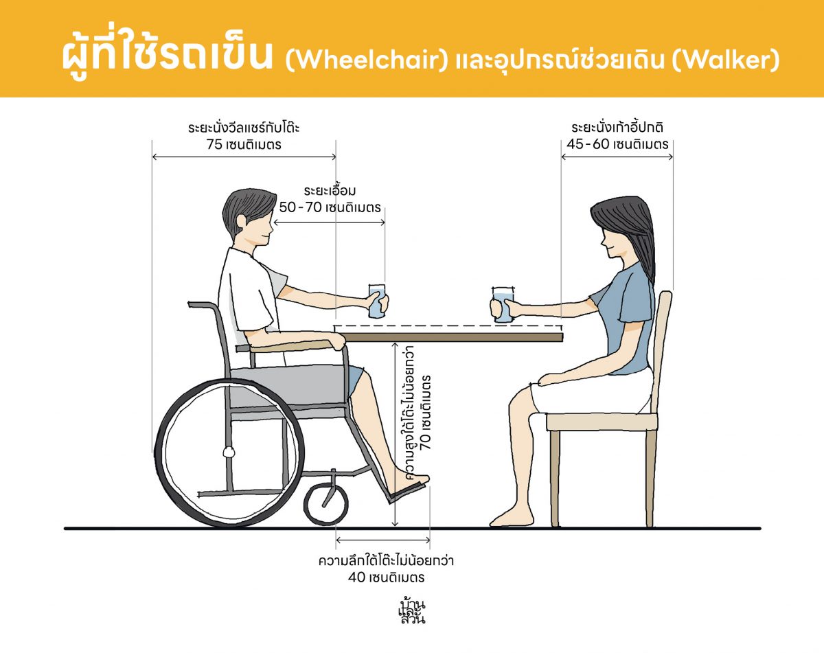 - ความสูงของใต้โต๊ะไม่น้อยกว่า 70 เซนติเมตร เพื่อให้สามารถเลื่อนวีลแชร์เข้าไปใต้โต๊ะได้