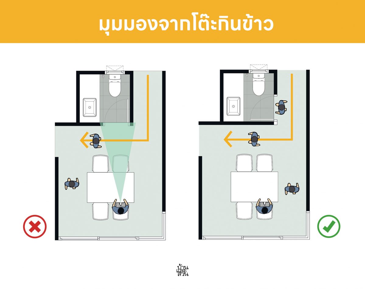 สำหรับคนไทย โต๊ะกินข้าวเป็นเหมือนศูนย์กลางของบ้าน อาจมีคนเดินผ่านไปมารอบ ๆ โต๊ะ และในเวลาเดียวกันก็อาจจะมีคนนั่งกินข้าวหรือนั่งทำงานอยู่ คงไม่ดีแน่ ถ้านั่งกินข้าวแต่มองเห็นห้องน้ำอยู่ตรงหน้า เพียงเปลี่ยนตำแหน่งประตูห้องน้ำมาอีกฝั่งของผนัง ก็ทำให้ความรู้สึกของผู้ที่นั่งอยู่ตรงนี้เปลี่ยนไปโดยสิ้นเชิง