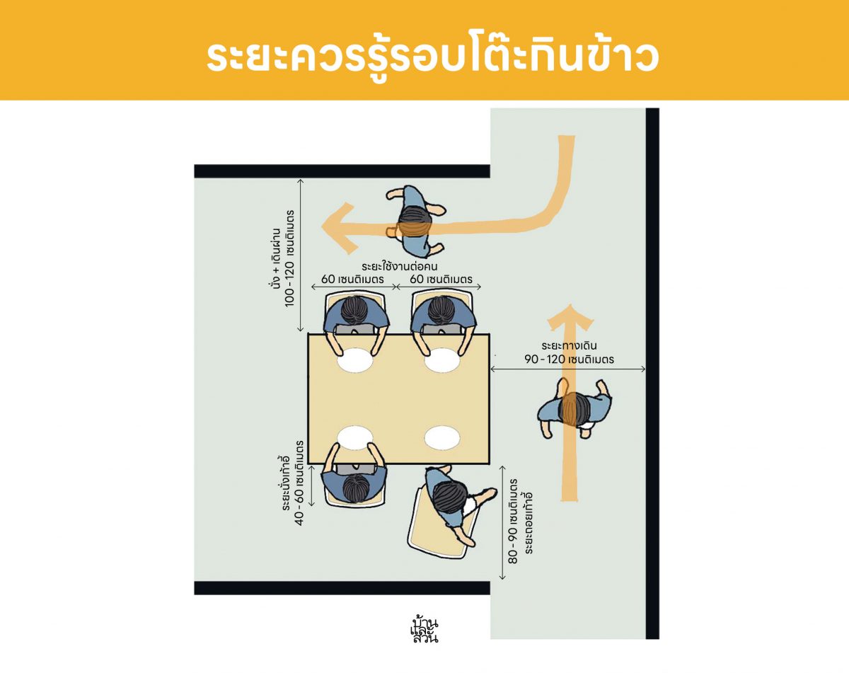 - ความกว้างสำหรับเดินผ่านหลังเก้าอี้(ตอนที่มีคนนั่งอยู่) ประมาณ 60-90 เซนติเมตร หรือมีระยะจากขอบโต๊ะไม่น้อยกว่า 100 เซนติเมตร