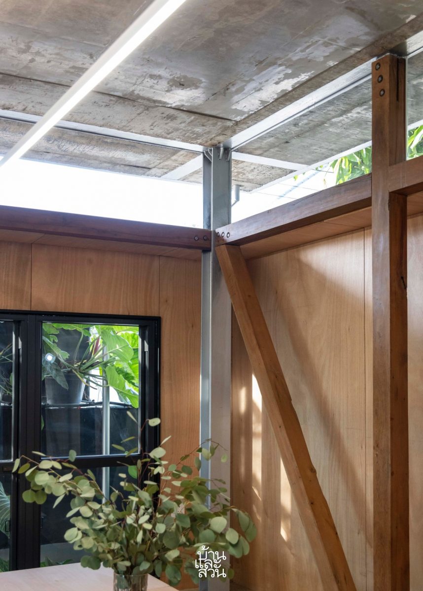 ห้องประชุมหรือพื้นที่ทำงานที่ต่อเติมเพิ่มขึ้นมาบริเวณหลังบ้านโดยใช้โครงสร้างเหล็กผสมไม้เพื่อสามารถสร้างได้ไว และออกแบบให้มีช่องเปิดรับแสงทั้งจากผนังกระจกกับช่องแสงเล็ก ๆ บริเวณผนังด้านบน