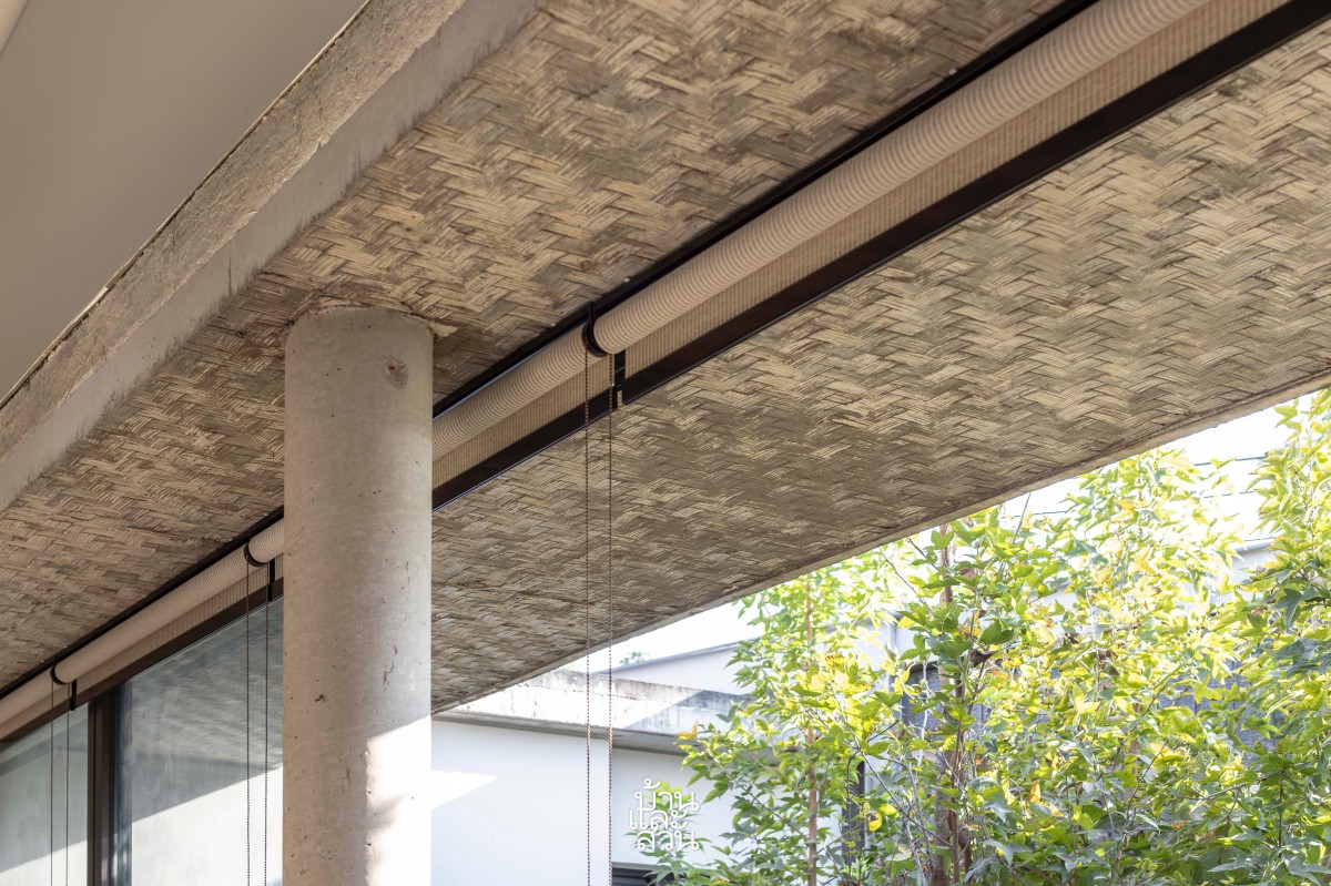 เพดานภายในยาวต่อเนื่องไปถึงชายคาภายนอกเป็นอีกมุมหนึ่งที่มาจากการทดลองใช้ไม้แบบมาสร้างลวดลายเหมือนเสื่อสานให้ผิวปูนเปลือย
