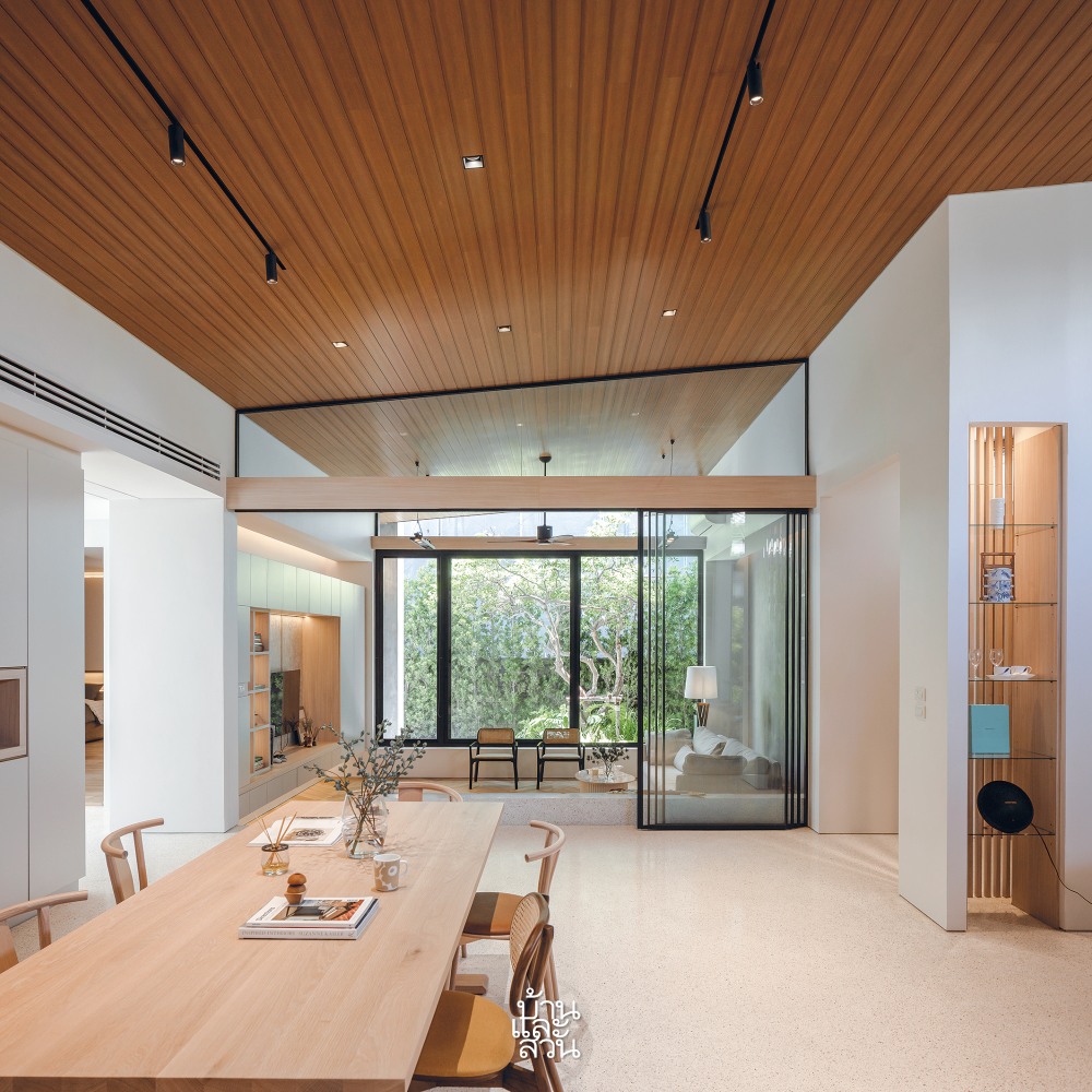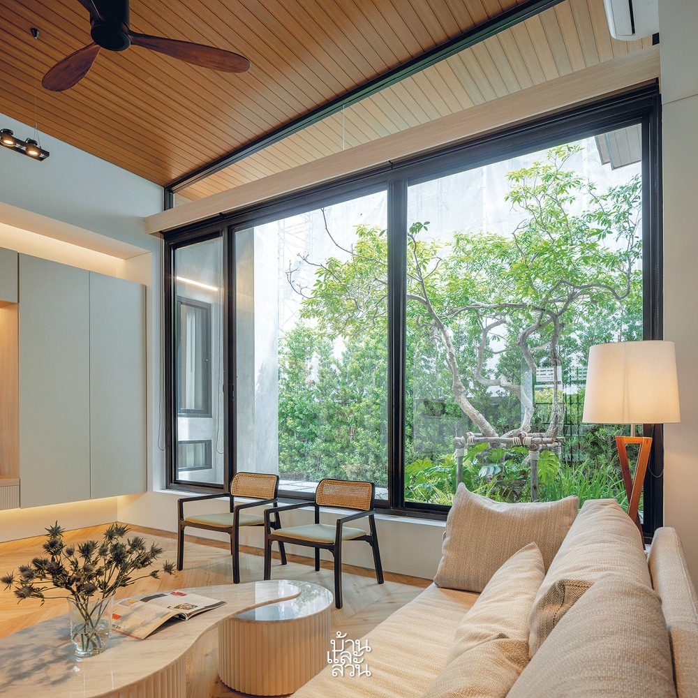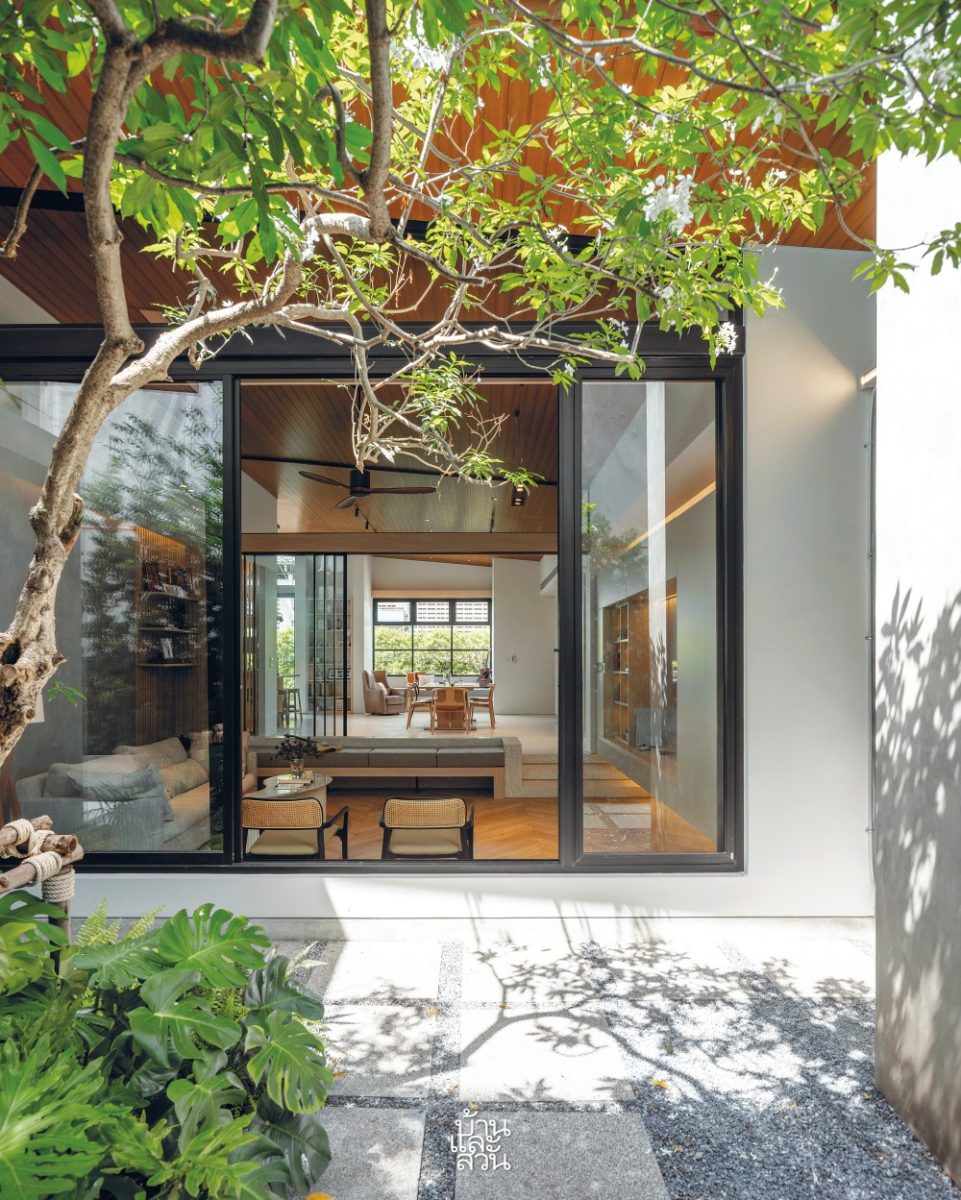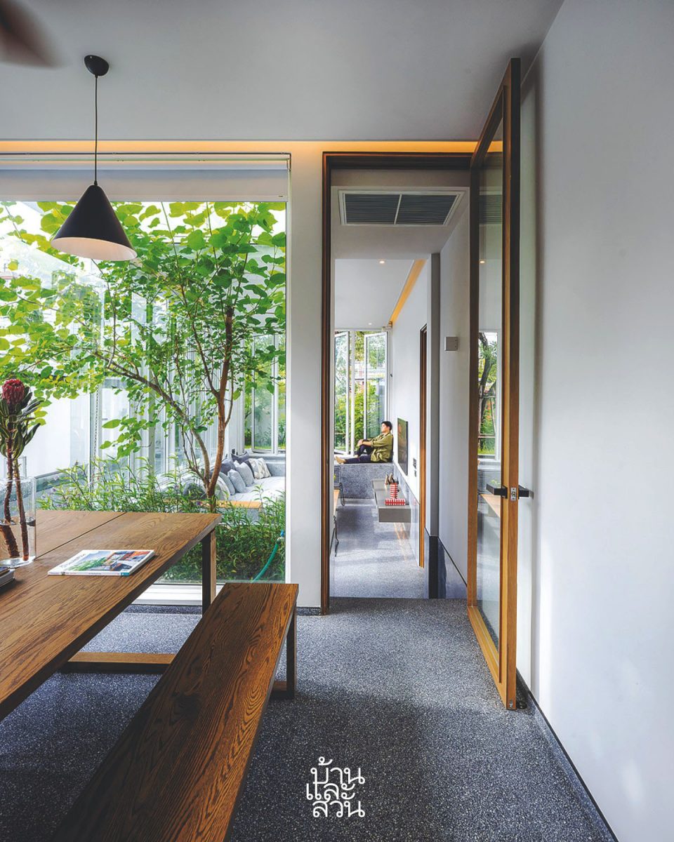 แม้จะมีหน้ากว้าง 17 เมตรแต่ภายในมีขนาดลึกเข้าไปเพียง 8 เมตรเท่านั้น อีกทั้งรูปทรงที่ดินยังมีการตัดเฉียง ทำให้กลายเป็นทรงสี่เหลี่ยมคางหมูที่ไม่สมมาตร หน้าบ้านก็หันไปทางทิศตะวันตก การออกแบบวางตัวบ้านทรงแคบลงไปบนที่ดินผืนขนาดจำกัดแบบนี้ โดยไม่ทำให้การอยู่อาศัยภายในอึดอัดนั้นจึงไม่ใช่เรื่องง่ายเลย สถาปนิกจึงแก้ปัญหาด้วยการใส่พื้นที่คอร์ตสำหรับปลูกต้นไม้ไว้ตรงกลาง แล้วดันพื้นที่อยู่อาศัยให้หลบเข้าไปด้านในเพื่อช่วยเลี่ยงแนวแสงแดดและความร้อน แล้วกั้นเพิ่มความเป็นส่วนตัวของคอร์ตหน้าบ้านด้วยแนวรั้วอิฐลอน ซึ่งเป็นวัสดุธรรมดา ๆ ที่บ้านสมัยก่อนนิยมใช้ แต่กลับสร้างเสน่ห์ให้ตัวบ้านได้ดี โดยคอร์ตต้นไม้ยังทำให้สามารถเปิดพื้นที่ในบ้านให้โปร่งเป็นโถงนั่งเล่นที่สูงถึง 5 เมตร พร้อมแทรกด้วยช่องสกายไลต์ที่เปิดรับแสงธรรมชาติเข้าบ้านทำให้พื้นที่แคบดูโปร่งสบาย รวมถึงเป็นดีไซน์ที่ทำให้พื้นที่ในบ้านมีเอกลักษณ์ที่น่าสนใจ >> อ่านต่อ