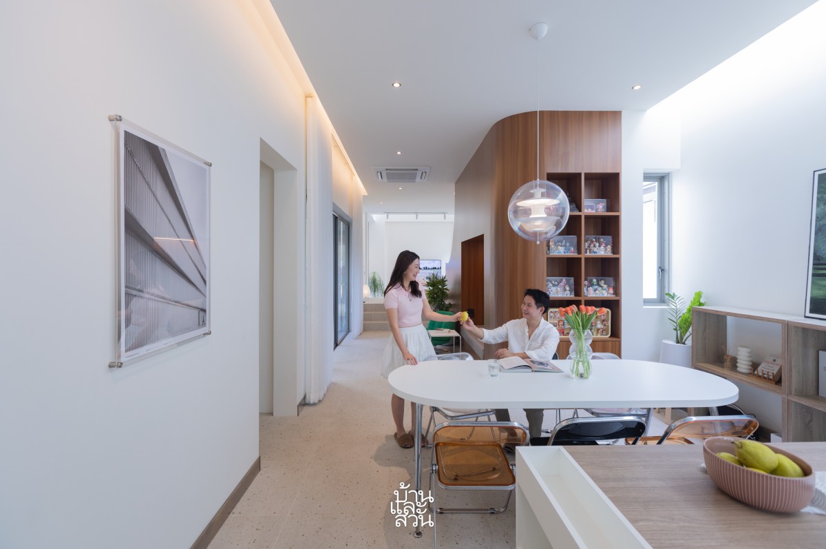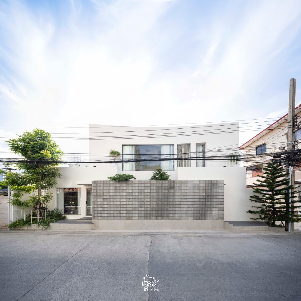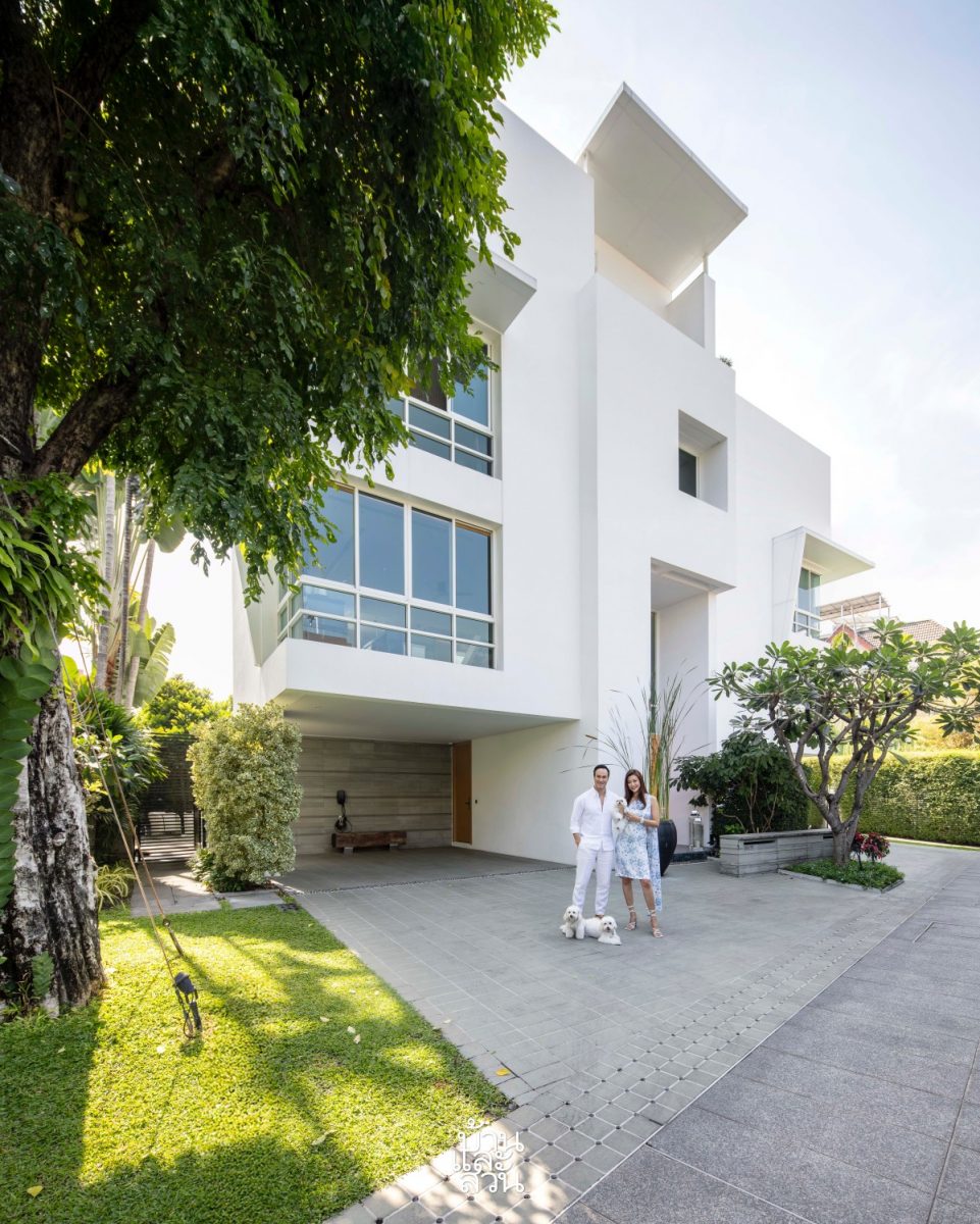 บ้านโมเดิร์นสีขาวสองชั้นบนพื้นที่ 650 ตารางเมตรได้ออกแบบฟังก์ชันภายในบ้านแยกจากกันเสมือนเป็นบ้านสองหลัง แต่ยังเชื่อมโยงกันด้วยการออกแบบทางภาษาสถาปัตยกรรมให้ผสมผสานความชอบของทั้งสองรุ่น ระหว่างสไตล์คลาสสิกกับมินิมัล โดยสถาปนิกแปลความคลาสสิกของคุณพ่อคุณแม่ด้วยการมีแพตเทิร์นคิ้วบัว ความสมดุล และหรูหรา ส่วนความมินิมัลของลูกคือ บ้านสีขาว ทรงเหลี่ยมๆ ใช้ไม้สีอ่อน และตกแต่งด้วยผ้าที่มีเท็กซ์เจอร์อย่างผ้าลินินที่ได้ฟีลคาเฟ่หรือร้านอาหารญี่ปุ่น จึงนำคาแร็กเตอร์เหล่านี้มาออกแบบองค์ประกอบ เกิดเป็นการย่อมุมของเฟรมสีขาวทั้งฝ้าและผนังให้ความรู้สึกสง่างามและเรียบง่ายไปพร้อมๆกัน ในความเรียบนิ่งของสีขาวกลับแสดงมิติของแสงเงาที่เปลี่ยนไปในแต่ละช่วงเวลาได้อย่างชัดเจน >> อ่านต่อ