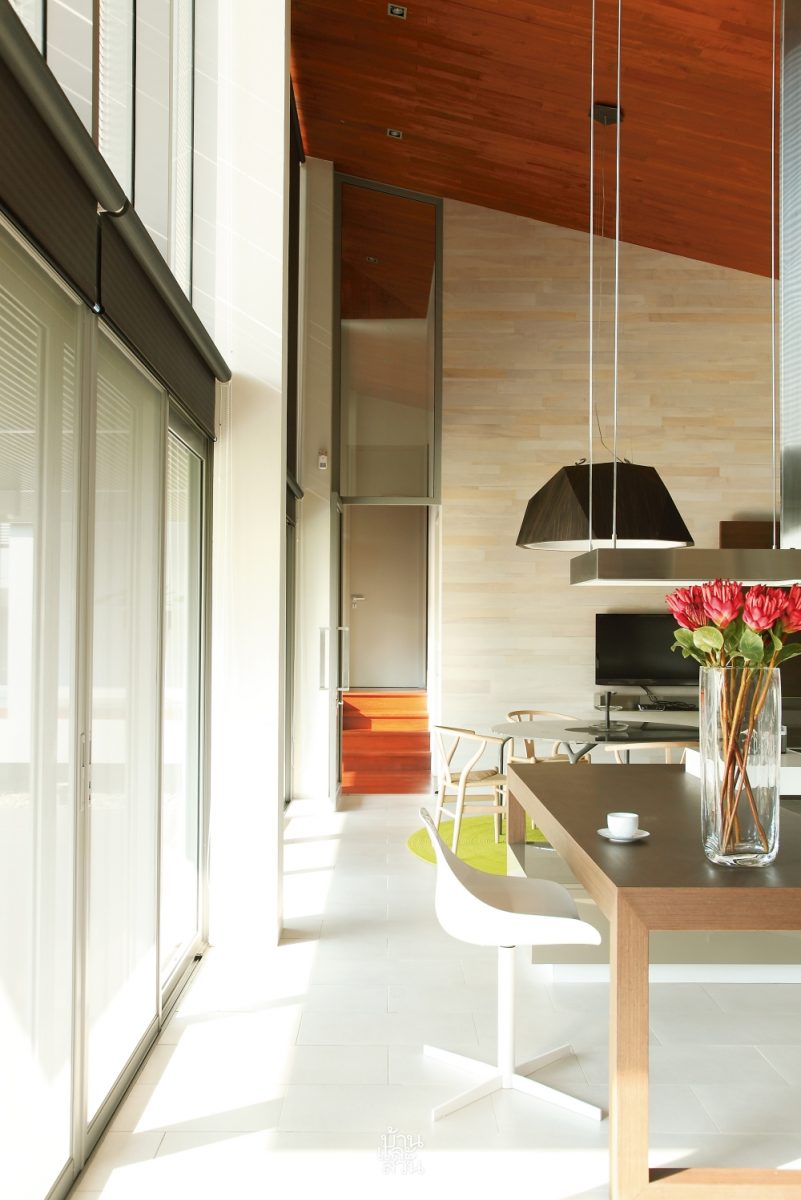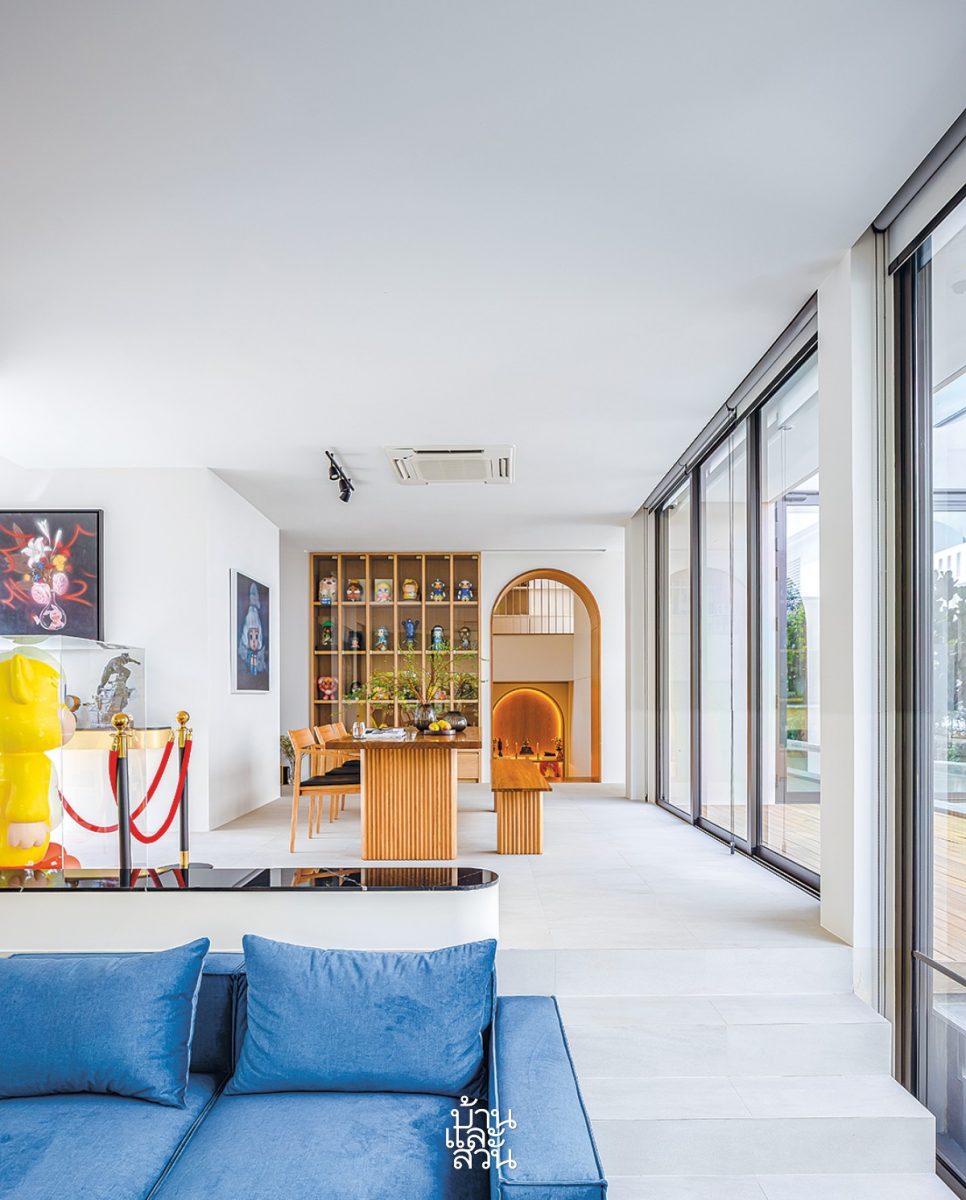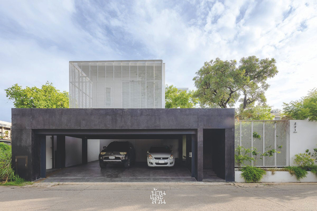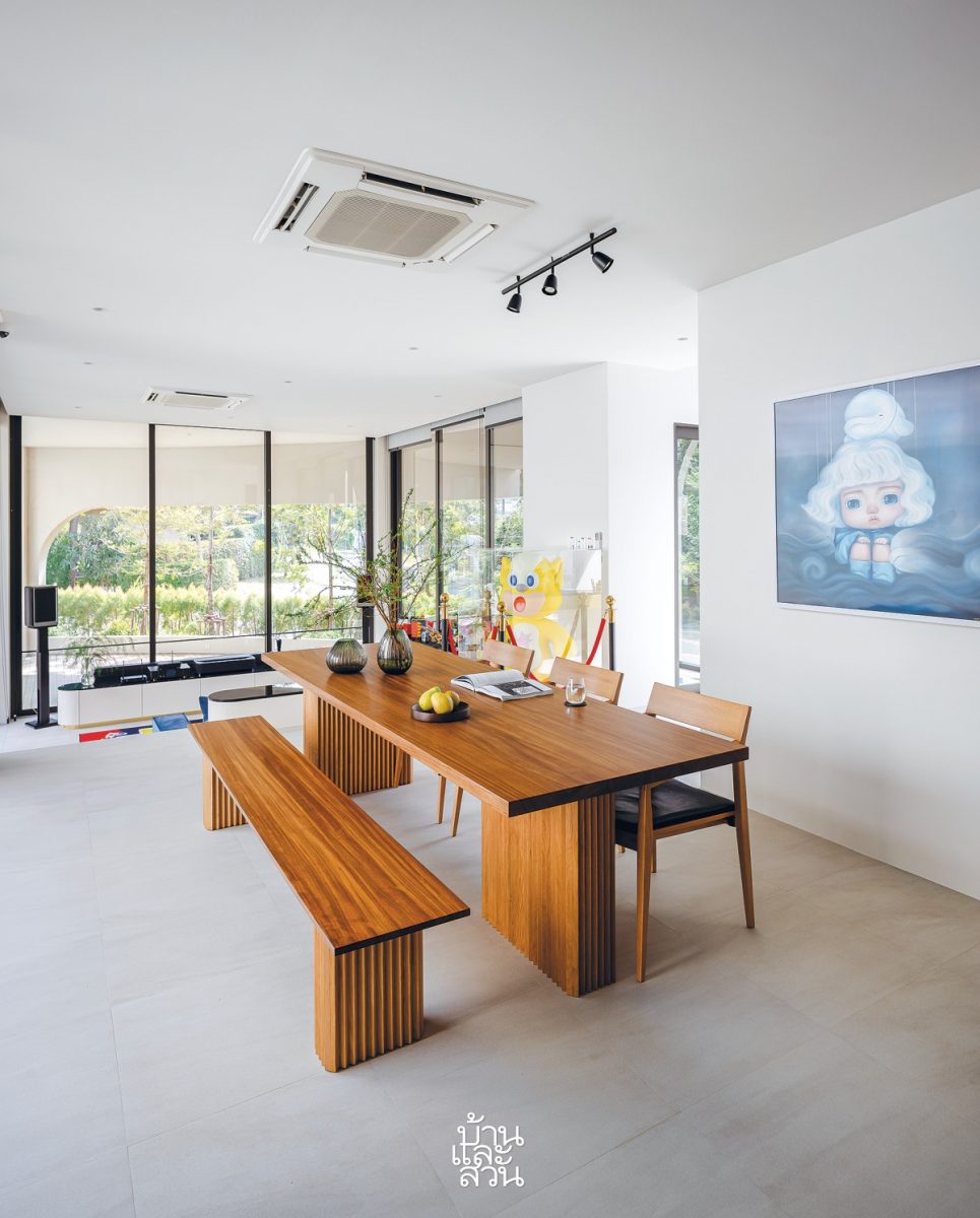 บ้านโมเดิร์นสีขาวสองชั้นบนพื้นที่ 650 ตารางเมตรได้ออกแบบฟังก์ชันภายในบ้านแยกจากกันเสมือนเป็นบ้านสองหลัง แต่ยังเชื่อมโยงกันด้วยการออกแบบทางภาษาสถาปัตยกรรมให้ผสมผสานความชอบของทั้งสองรุ่น ระหว่างสไตล์คลาสสิกกับมินิมัล โดยสถาปนิกแปลความคลาสสิกของคุณพ่อคุณแม่ด้วยการมีแพตเทิร์นคิ้วบัว ความสมดุล และหรูหรา ส่วนความมินิมัลของลูกคือ บ้านสีขาว ทรงเหลี่ยมๆ ใช้ไม้สีอ่อน และตกแต่งด้วยผ้าที่มีเท็กซ์เจอร์อย่างผ้าลินินที่ได้ฟีลคาเฟ่หรือร้านอาหารญี่ปุ่น จึงนำคาแร็กเตอร์เหล่านี้มาออกแบบองค์ประกอบ เกิดเป็นการย่อมุมของเฟรมสีขาวทั้งฝ้าและผนังให้ความรู้สึกสง่างามและเรียบง่ายไปพร้อมๆกัน ในความเรียบนิ่งของสีขาวกลับแสดงมิติของแสงเงาที่เปลี่ยนไปในแต่ละช่วงเวลาได้อย่างชัดเจน >> อ่านต่อ