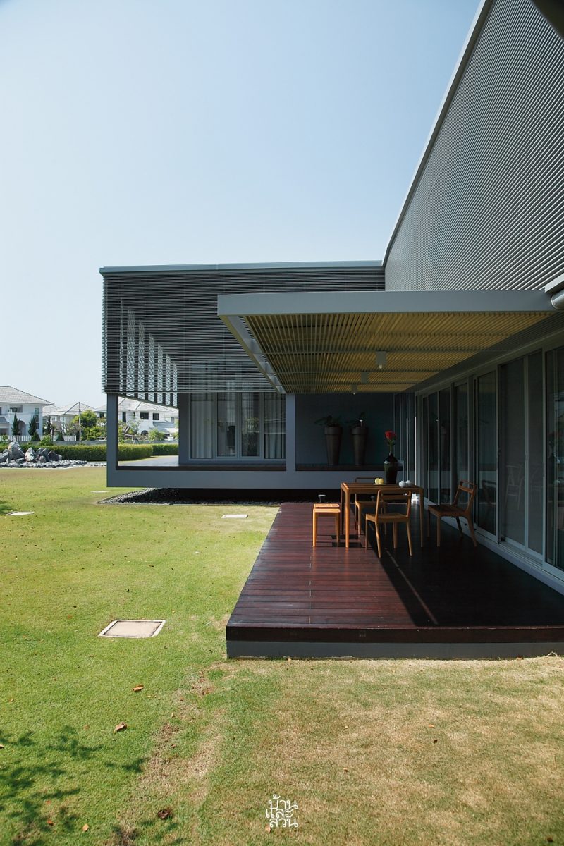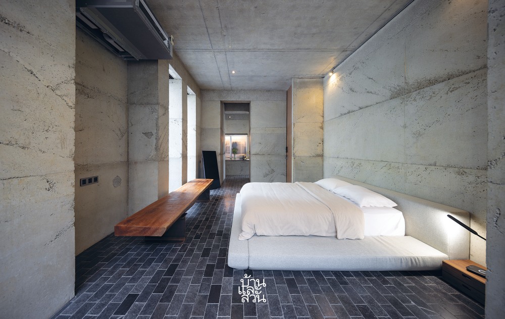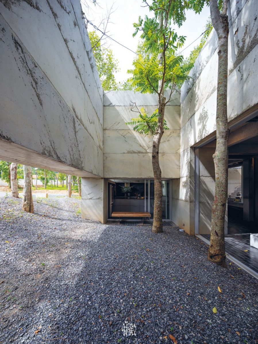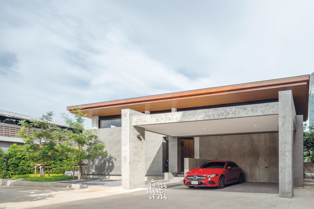 คอนเซ็ปต์ในการออกแบบบ้านหลังนี้คือ บ้านที่ซ่อนตัวอยู่หลังกำแพง เมื่อมองจากภายนอกเข้ามาจะมีองค์ประกอบของกำแพงผืนใหญ่ที่บดบังพื้นที่ภายในบ้านไว้เพื่อความเป็นส่วนตัวของผู้อยู่อาศัย แต่เมื่อเข้ามาแล้วจะพบว่าบ้านไม่ได้ทึบตันอย่างที่เห็น เพราะออกแบบสเปซให้ต่อเนื่องกัน นำแสงธรรมชาติเข้ามาผ่านช่องแสงทั้งทางด้านข้างตัวบ้าน และช่องแสงด้านบนเหนือกำแพงทึบ จึงทำให้บ้านโปร่งโล่งอยู่สบาย เมื่อโจทย์คือการออกเเบบบ้านชั้นเดียว จึงต้องคิดว่าทำอย่างไรให้เราเดินอยู่ในบ้านแล้วไม่เจอกับผนังทึบตัน เพราะความพิเศษของบ้านชั้นเดียวคือการที่เราได้มองเห็นโคนต้นไม้ ได้เห็นพื้นหญ้า ให้พื้นที่ภายในบ้านได้มีโอกาสสัมผัสกับบรรยากาศภายนอกมากที่สุด การออกแบบช่องเปิดนั้นเป็นโจทย์สำคัญ >> อ่านต่อ