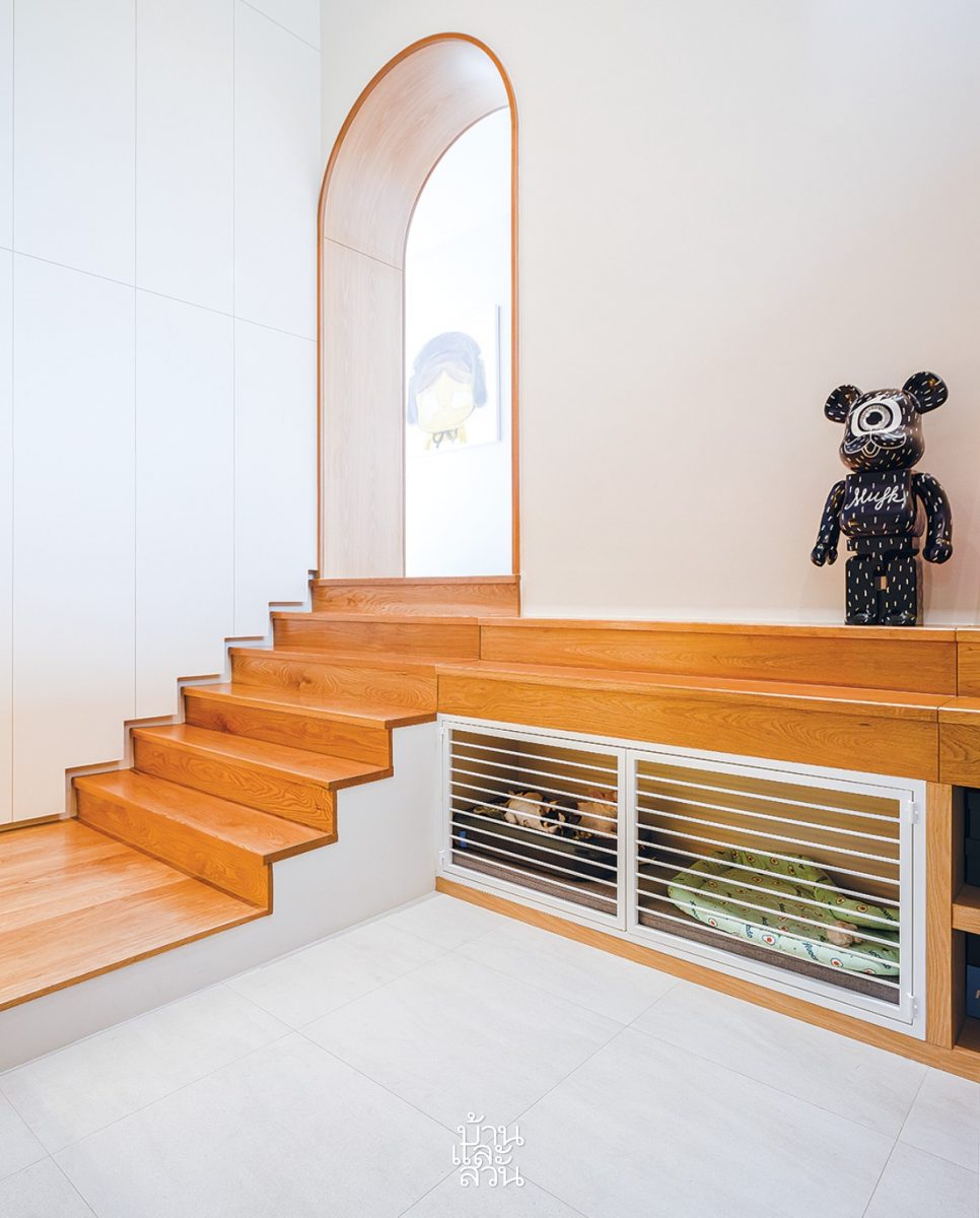 แม้ภายนอกของบ้านหลังนี้จะดูเรียบง่าย แต่ภายในนั้นมีความสนุกซ่อนอยู่ในฟังก์ชันการใช้สอย เพราะสถาปนิกใช้สเต็ปเล็ก ๆ หรือการเพิ่มชั้นบันไดเตี้ยๆ ในบ้านมาเป็นเครื่องมือ่ในการจัดสรรพื้นที่ใช้สอยพร้อมกับไล่ระดับการเข้าถึงจากพื้นที่ต้อนรับด้านหน้า พื้นที่ส่วนกลาง และพื้นที่ส่วนตัวที่อยู่ด้านในสุด ทำให้การเชื่อมต่อแต่ละมุมดูมีชั้นเชิง สร้างประสบการณ์ให้เจ้าของบ้านใช้งานได้สนุกและไม่น่าเบื่อ โดยทุกมุมนุ่มนวลกลมกล่อมอยู่ในสีเอิร์ธโทน >> อ่านต่อ