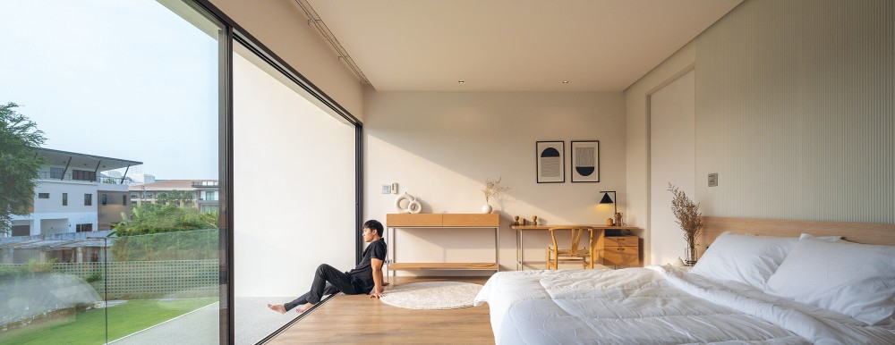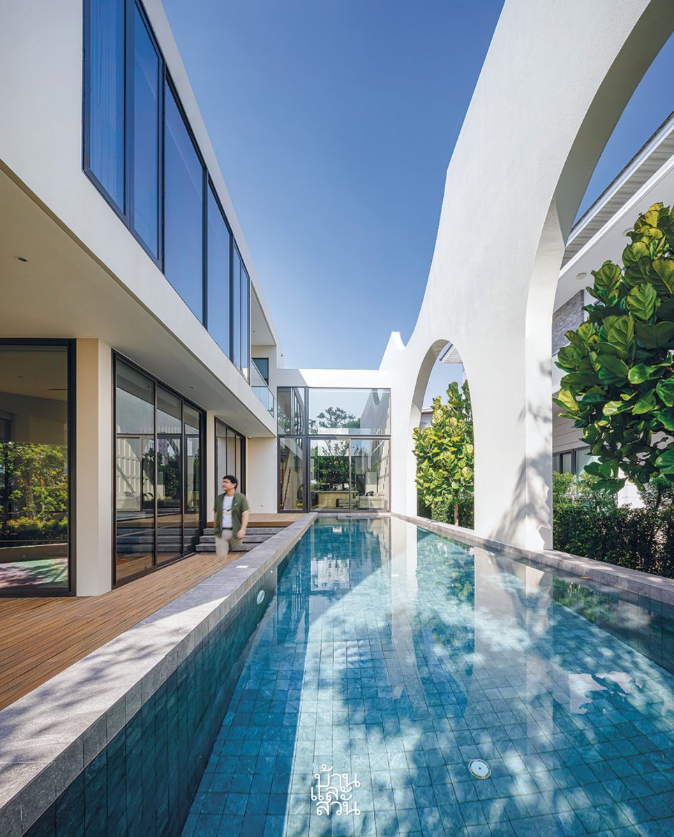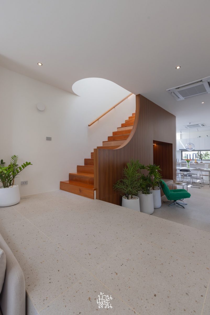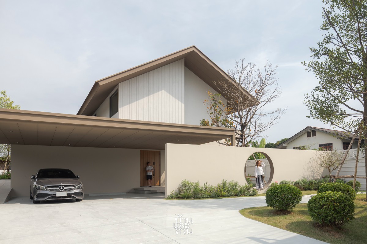 ที่ตั้งของบ้านหลังนี้อยู่ตรงแนวโค้งของถนนพอดี บางเวลาก็ดูสงบเงียบและบางเวลาก็เป็นเส้นทางที่คนในหมู่บ้านมักจะใช้วิ่งออกกำลังกาย เมื่อไม่สามารถสร้างรั้วที่เป็นโครงสร้างทึบได้ สถาปนิกจึงเลือกใช้ต้นไม้มาเป็นรั้วธรรมชาติช่วยพรางตาให้พื้นที่ชั้นล่างของบ้าน เพิ่มผนังฟาซาดทรงโค้งกั้นมุมมองข้างบ้านไว้ล้อรับไปกับที่ดินทรงโค้งของโครงการ พร้อมกับวางผังให้มุมพักผ่อนต่างๆ ของบ้านอยู่ลึกเข้าไปในด้านในเพื่อสร้างความสงบส่วนตัว โดยให้ความสำคัญกับการเชื่อมต่อพื้นที่ระหว่างภายนอกกับภายในอาคารมากๆ เพื่อให้การใช้ชีวิตอยู่ภายในบ้านรับรู้ได้ถึงธรรมชาติภายนอกด้วย ยิ่งใส่พื้นที่สีเขียวเข้าไปมากเท่าไร Ventilation หรือการหมุนเวียนของอากาศก็จะดีขึ้นเท่านั้น >> อ่านต่อ