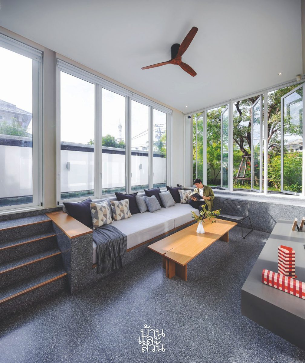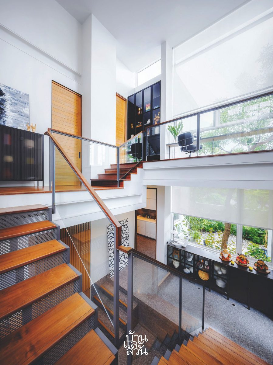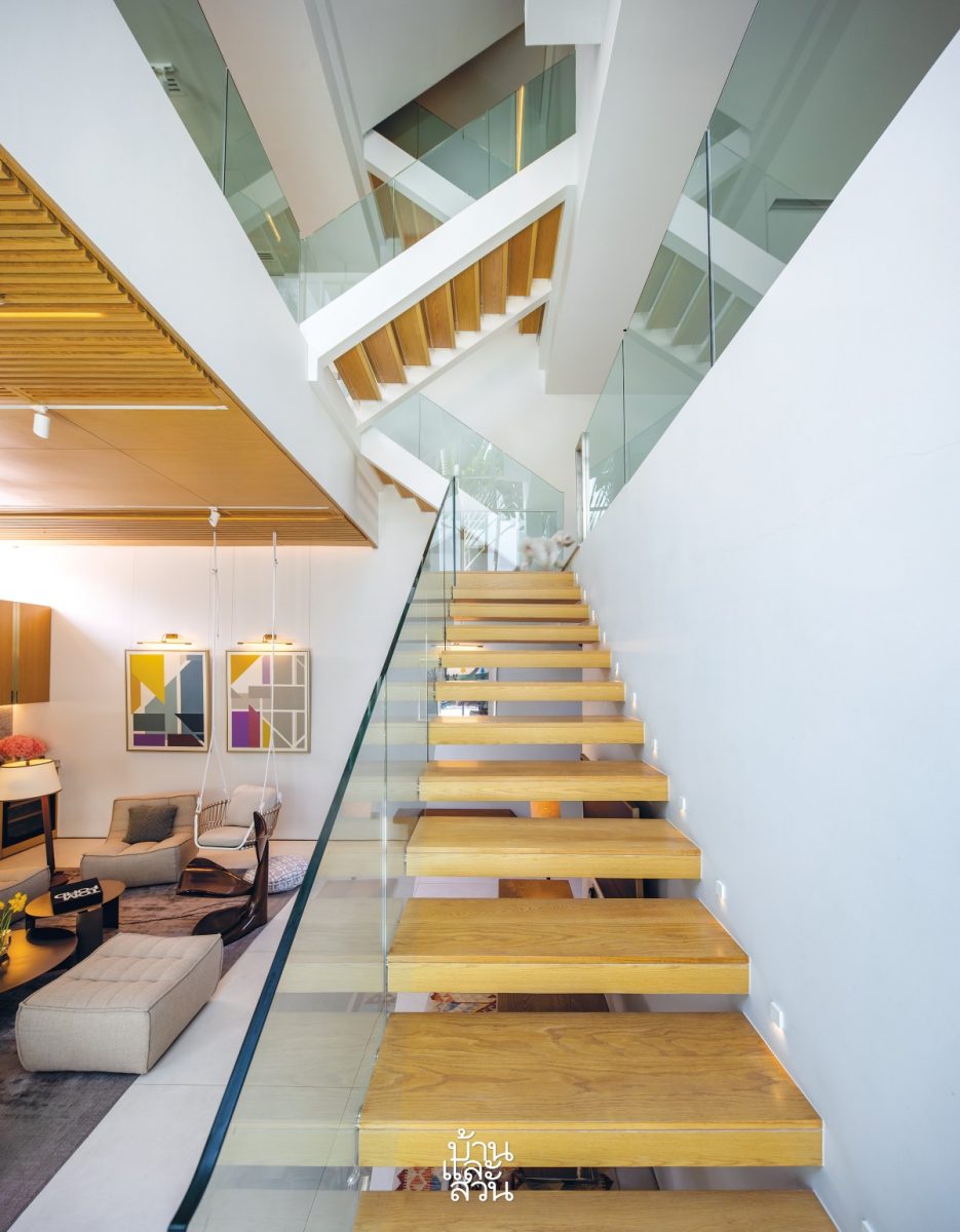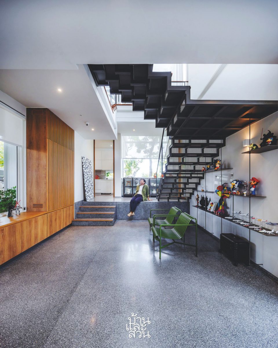 แบบบ้านเล่นระดับ สไตล์โมเดิร์นที่ภายในมีฟังก์ชันเป็นแนวตั้งสลับไปมาทั้งหมดร่วม 7 ชั้น บนพื้นที่ใช้สอยราว 430 ตารางเมตร แต่ละชั้นมีฟังก์ชันสอดคล้องและรับกับไลฟ์สไตล์ รวมถึงไล่ระดับความเป็นส่วนตัวจากชั้นล่างสู่ชั้นบน โดยมีบันไดอยู่กลางบ้านเพื่อทำให้ภายในดูสูงโปร่ง อีกทั้งเชื่อมพื้นที่ระหว่างชั้นและเปิดรับแสงธรรมชาติผ่านผนังกระจกใส ซึ่งช่วยให้ทุกชั้นสามารถมองเห็นกันได้แม้จะพักผ่อนหรือใช้งานอยู่คนละฟังก์ชัน >> อ่านต่อ