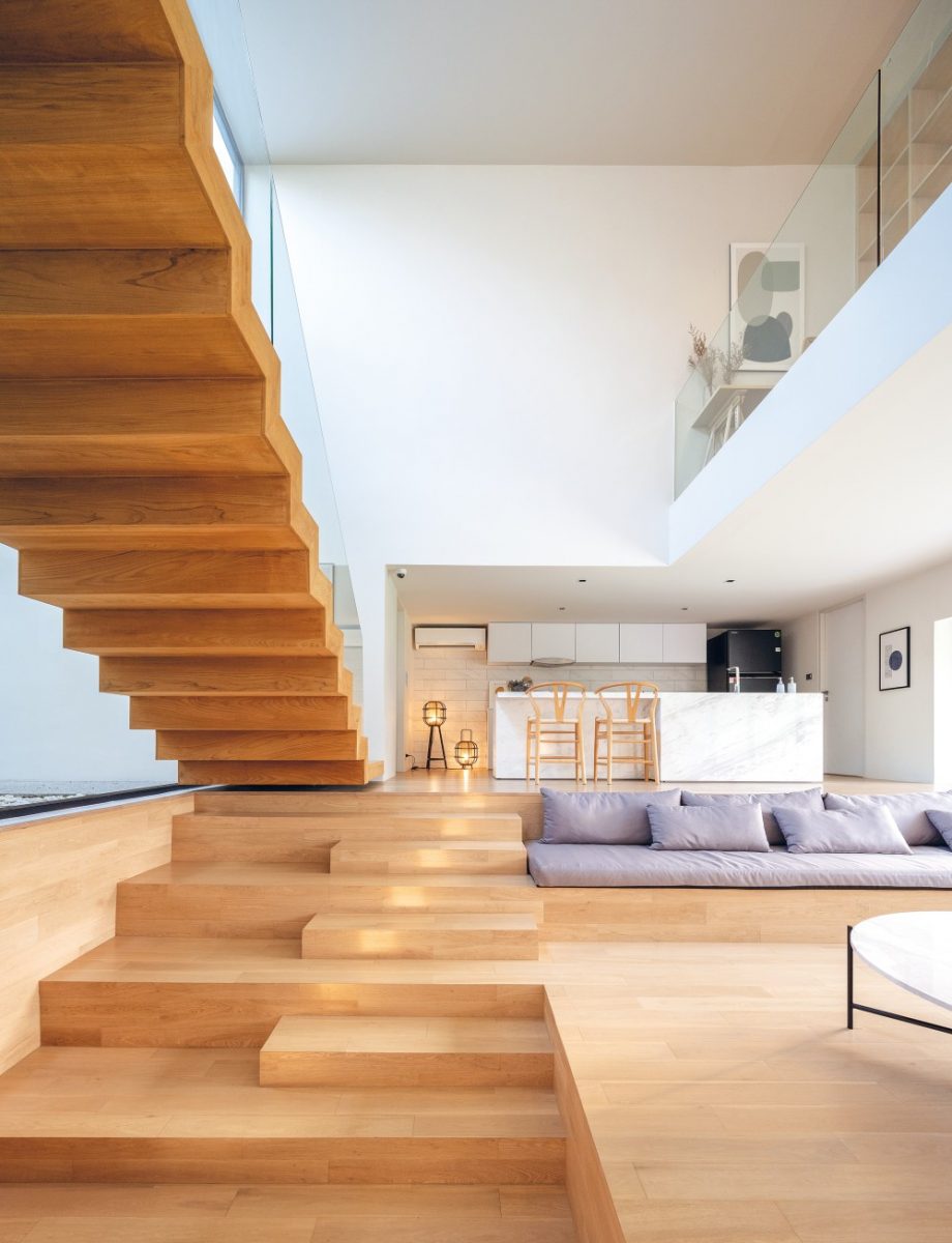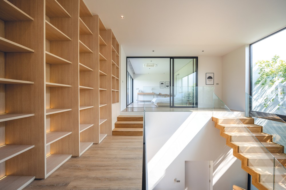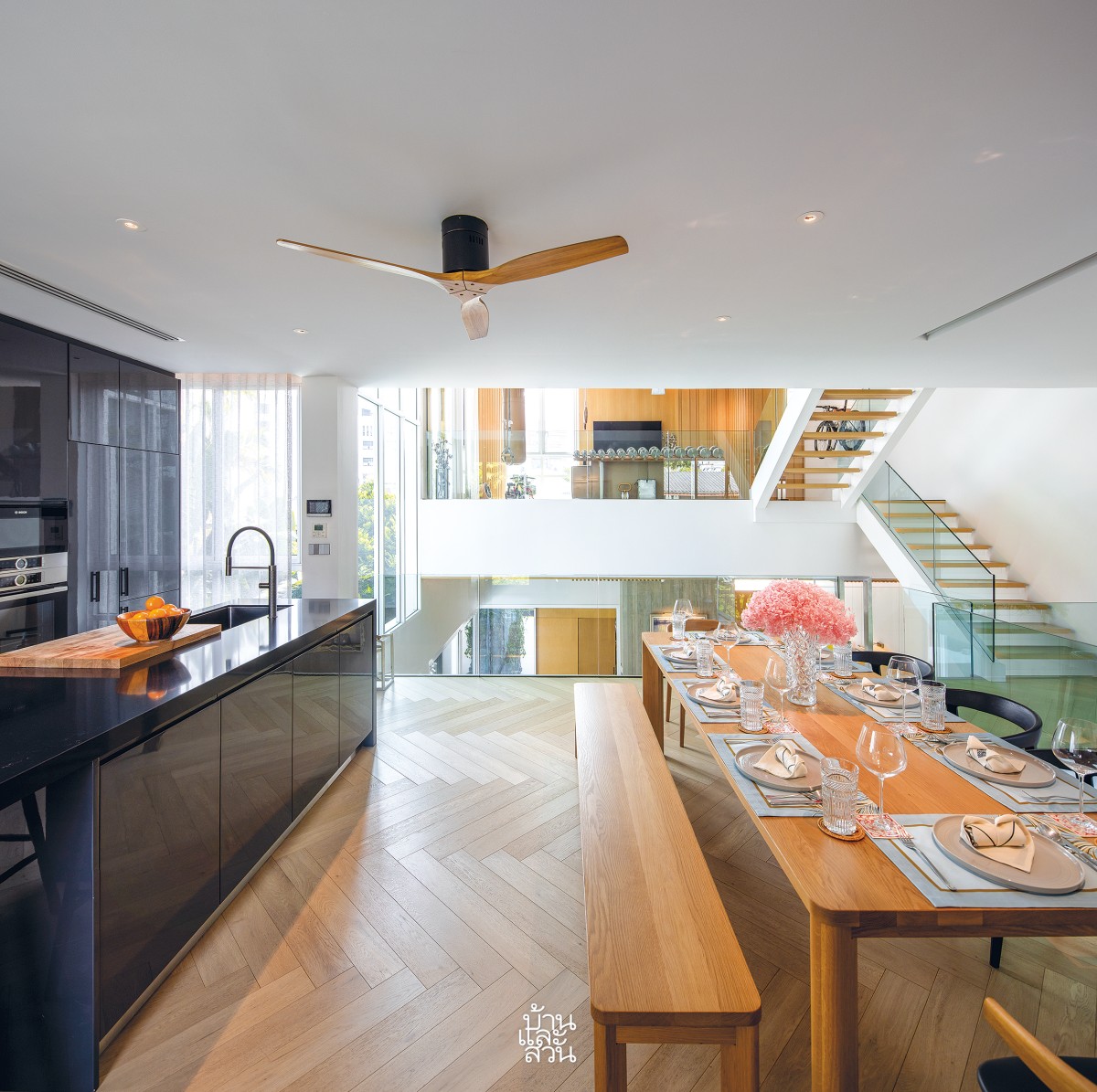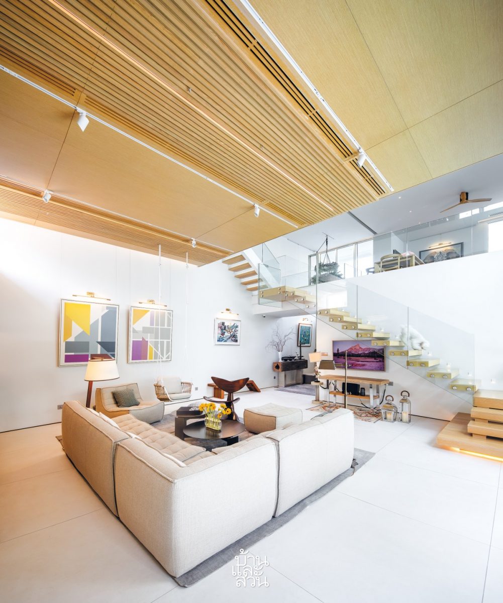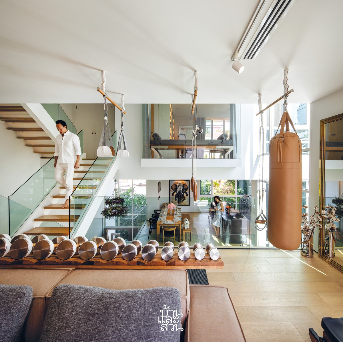 แบบบ้านเล่นระดับ สไตล์โมเดิร์นที่ภายในมีฟังก์ชันเป็นแนวตั้งสลับไปมาทั้งหมดร่วม 7 ชั้น บนพื้นที่ใช้สอยราว 430 ตารางเมตร แต่ละชั้นมีฟังก์ชันสอดคล้องและรับกับไลฟ์สไตล์ รวมถึงไล่ระดับความเป็นส่วนตัวจากชั้นล่างสู่ชั้นบน โดยมีบันไดอยู่กลางบ้านเพื่อทำให้ภายในดูสูงโปร่ง อีกทั้งเชื่อมพื้นที่ระหว่างชั้นและเปิดรับแสงธรรมชาติผ่านผนังกระจกใส ซึ่งช่วยให้ทุกชั้นสามารถมองเห็นกันได้แม้จะพักผ่อนหรือใช้งานอยู่คนละฟังก์ชัน >> อ่านต่อ
