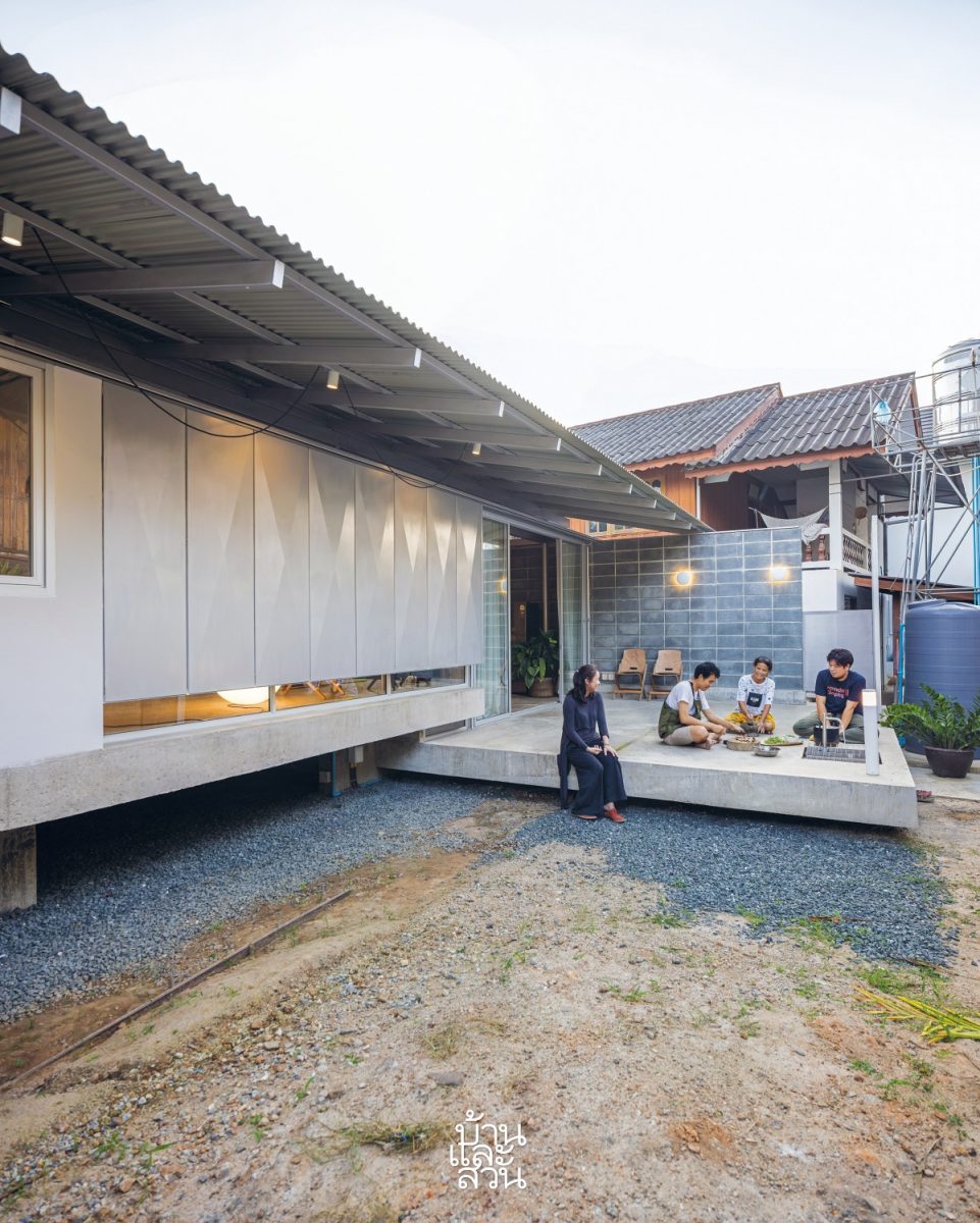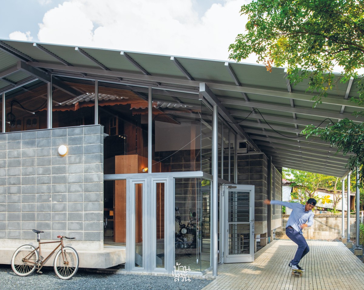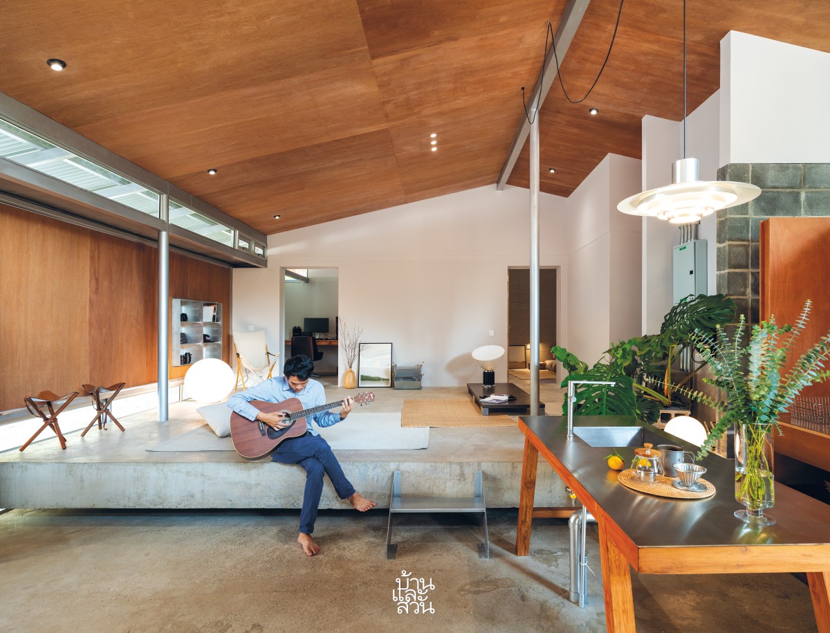 บ้านชั้นเดียวแบบชนบทภายใต้โครงสร้างเหล็กสมัยใหม่ ที่เน้นการใช้วัสดุธรรมดาอย่างอิฐบล็อกและคอนกรีตเปลือย แต่ออกแบบให้ดูเท่เป็นพิเศษ โดดเด่นชัดเจนในรูปทรงหลังคาจั่วที่ปรับมาใช้วัสดุเมทัลชีตแทนกระเบื้อง แล้วยื่นชายคาสองฝั่งให้ไม่เท่ากันเพื่อสร้างร่มเงาที่สอดคล้องไปกับทิศทางของแดด ด้วยความที่บ้านอยู่กลางกลุ่มบ้านของญาติๆ สไตล์บ้านชนบท จึงมีทั้งสเปซที่เปิดให้เข้าถึงได้ง่ายและส่วนที่ปิดมุมมองเพื่อความเป็นส่วนตัว นอกจากนี้ ยังออกแบบให้มีสเต็ปพิเศษจากภายนอกสู่ภายในด้วยคานปูนหนา 30 เซนติเมตรวางเหลื่อมซ้อนกันเป็น 2 ชั้น โดยชั้นแรกเป็นที่นั่งเล่นนอกบ้านซึ่งพาดยาวไปเป็นพื้นที่ในบ้านต่อเนื่องไปจนถึงลานกว้างด้านหลังบ้าน และชั้นที่สองเป็นที่นั่งราบกับพื้นสบายๆ ตามวิถีชนบทพร้อมยกระดับความเป็นพื้นที่ส่วนตัวให้ชัดเจนขึ้น เพิ่มมิติให้กับบ้านชั้นเดียวหลังนี้ดูไม่ธรรมดาเลย >> อ่านต่อ
