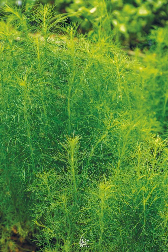 ไม้พุ่มอายุสั้น ใบเป็นเส้นฝอย ออกเวียนรอบกิ่ง นิยมปลูกประดับสวน เนื่องจากปลูกเลี้ยงง่าย ชอบดินชุ่มชื้น มีน้ำขังเล็กน้อย ใบมีกลิ่นและรสชาติคล้ายผักชีลาว ยอดอ่อนรับประทานเป็นผักสดหรือนำไปปรุงอาหาร