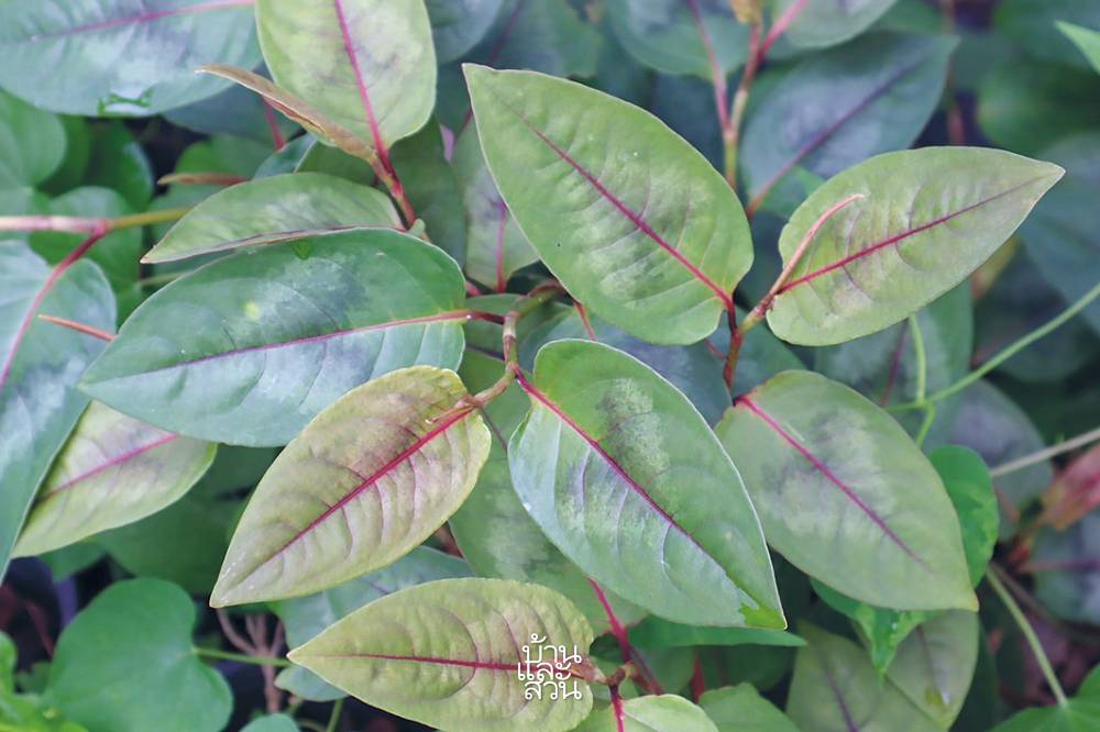 ไม้ล้มลุก ลำต้นมีสีแดงอมชมพู ใบรูปโล่หรือรูปไข่หัวกลับ แผ่นใบสีเขียวและเส้นใบสีด่างขาว โตเร็ว ปลูกเลี้ยงง่าย ปลูกประดับสวนได้ดี ยอดอ่อนมีรสชาติจืด นำไปลวกเป็นผักจิ้มน้ำพริก